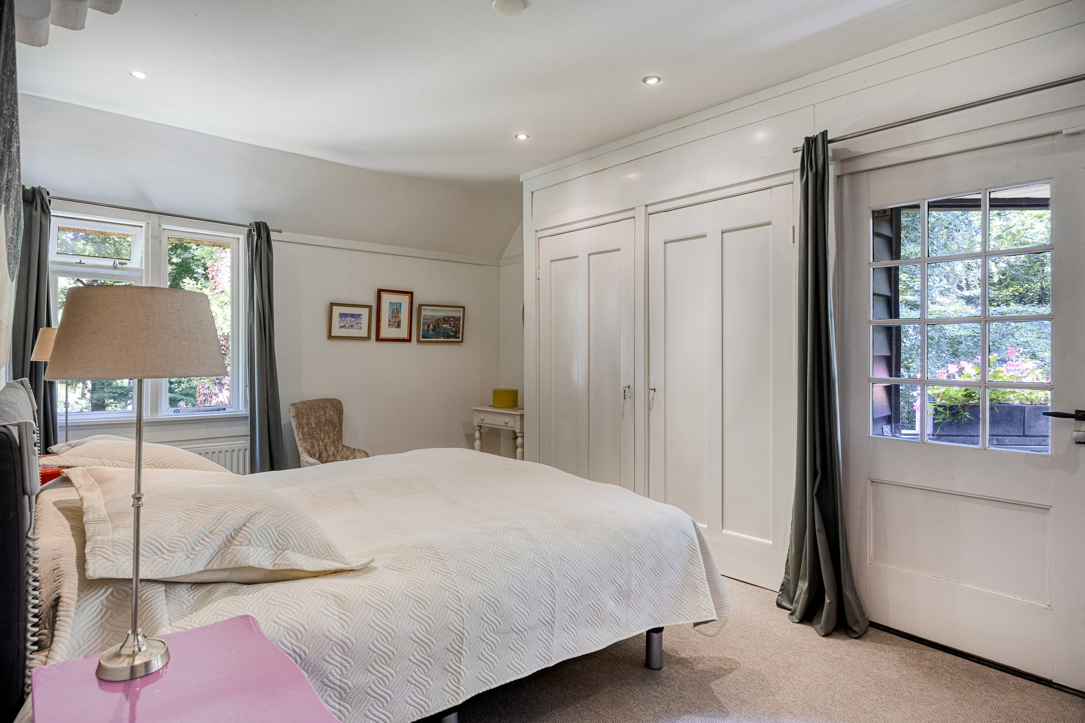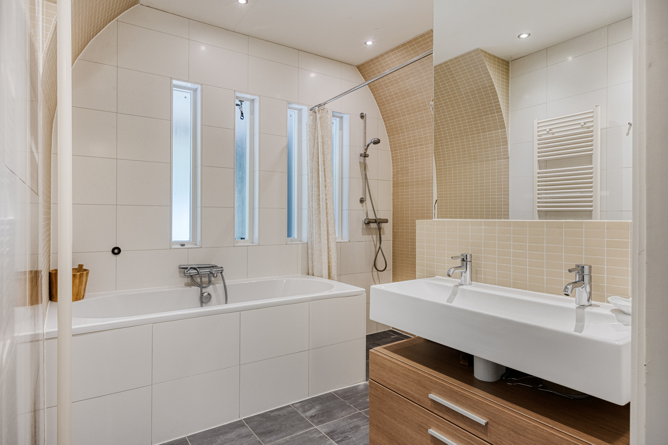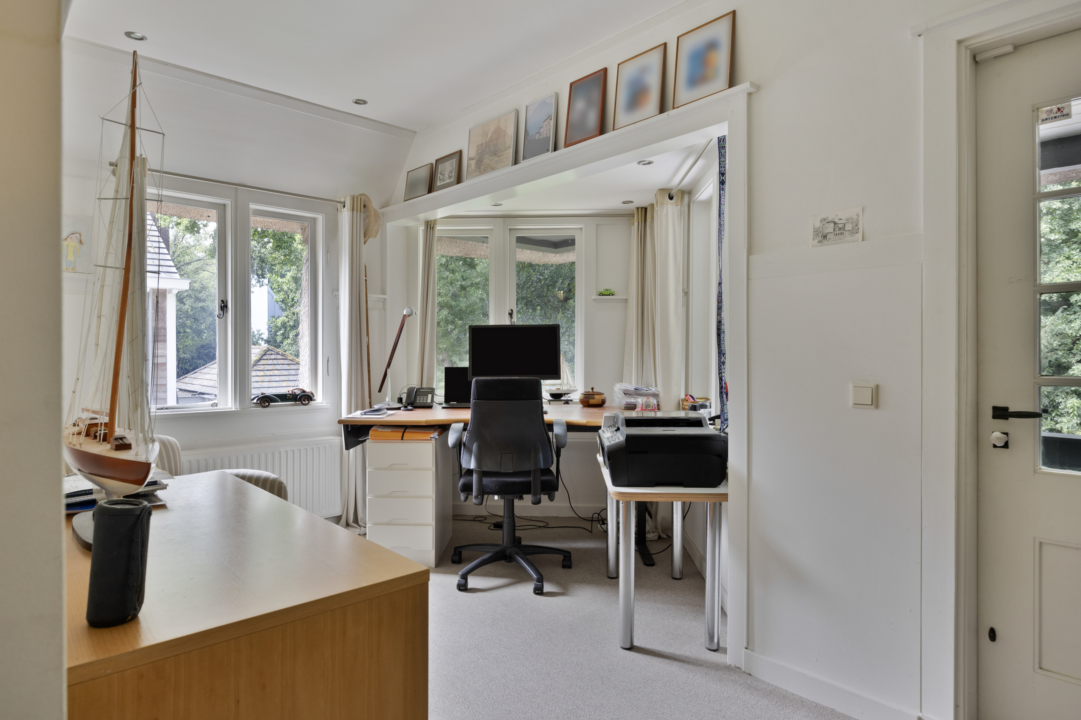Op de eerste verdieping bevinden zich vier ruime slaapkamers, waarvan twee met toegang tot het balkon aan de voorzijde. Aan de achterzijde ligt een sfeervol kantoor met schouw en balkon. De vierde slaapkamer beschikt over een praktische zijkamer en eveneens toegang tot het balkon. De lichte badkamer is voorzien van ligbad, inloopdouche en wastafelmeubel. De badkamer en het separate toilet beschikken over vloerverwarming.