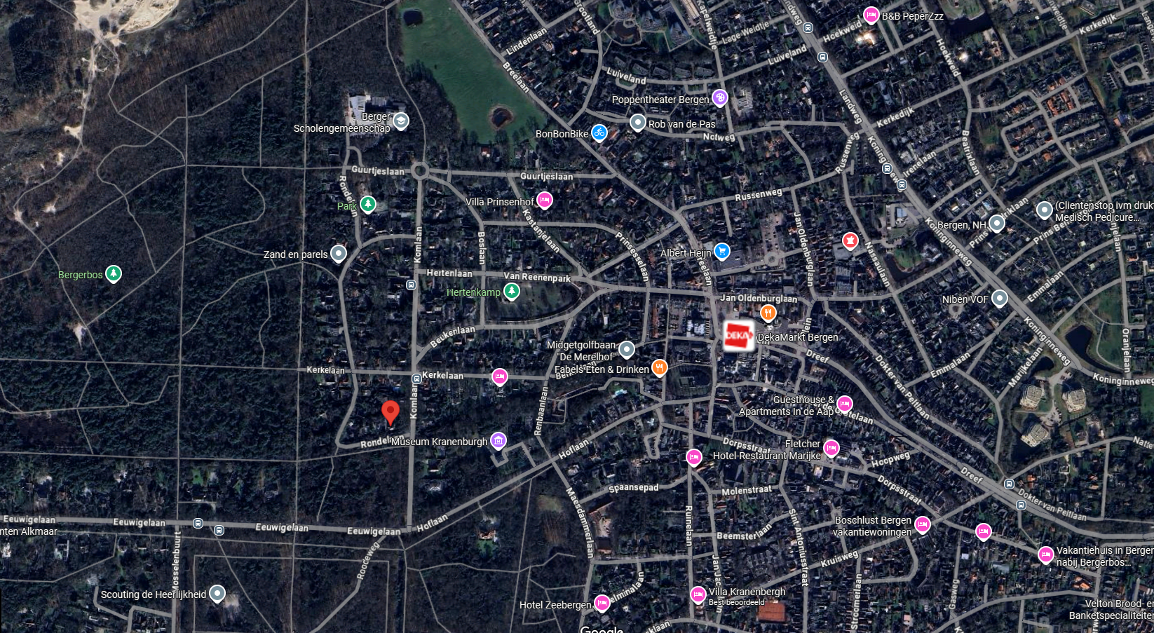 De woning ligt op een van de mooiste plekken van Bergen Noord-Holland, direct aan het Bergerbos en nabij de Schoorlse Duinen. Het strand van Bergen aan Zee ligt op circa 4 km. Het gezellige centrum van Bergen met winkels, restaurants, terrassen, de Kunst10Daagse en Museum Kranenburgh ligt op korte afstand.