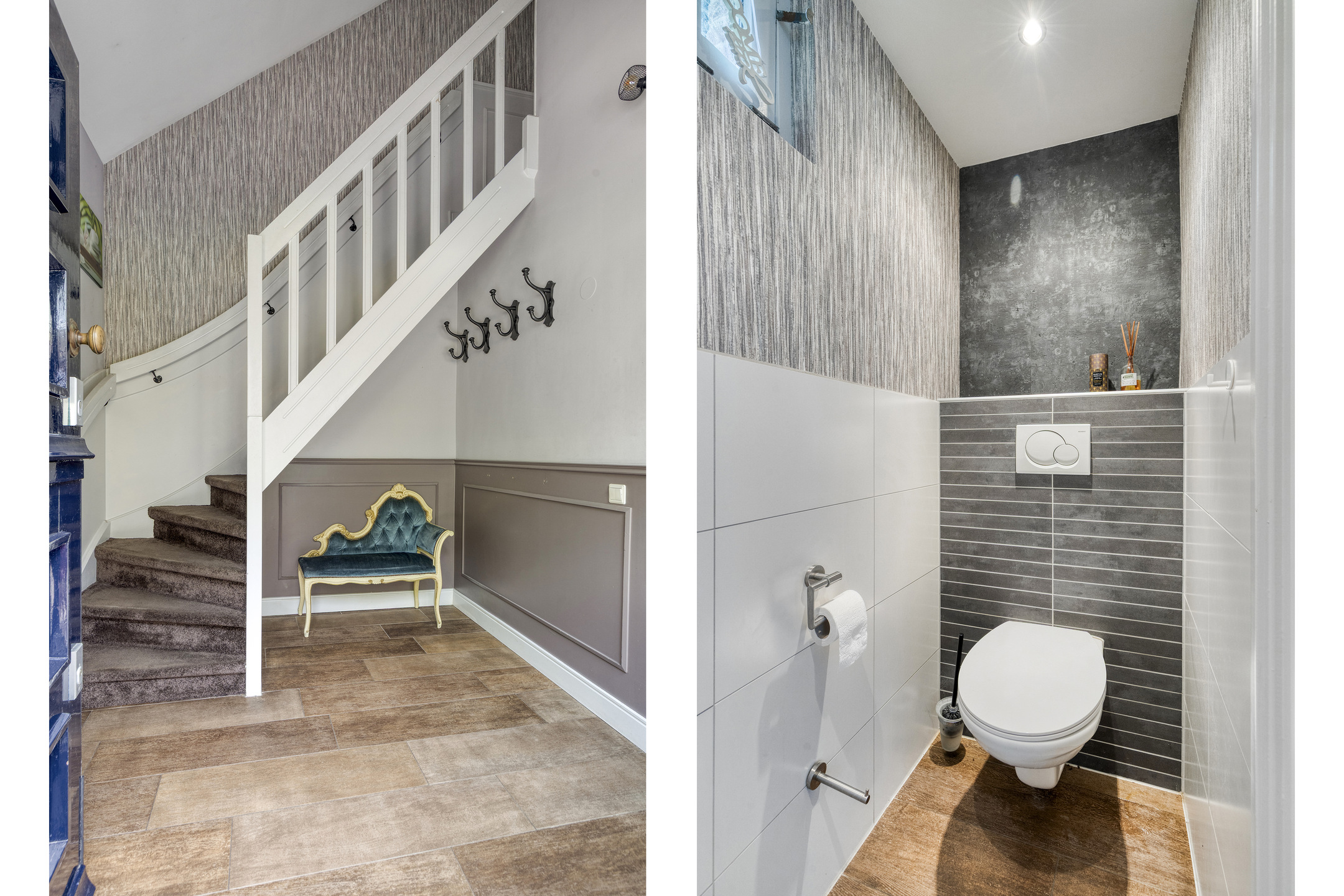 Entree van de woning zit aan de zijkant. Hal met toilet, meterkast met glasvezelaansluiting, diepe bergkast onder de trap en trapopgang naar 1e verdieping.