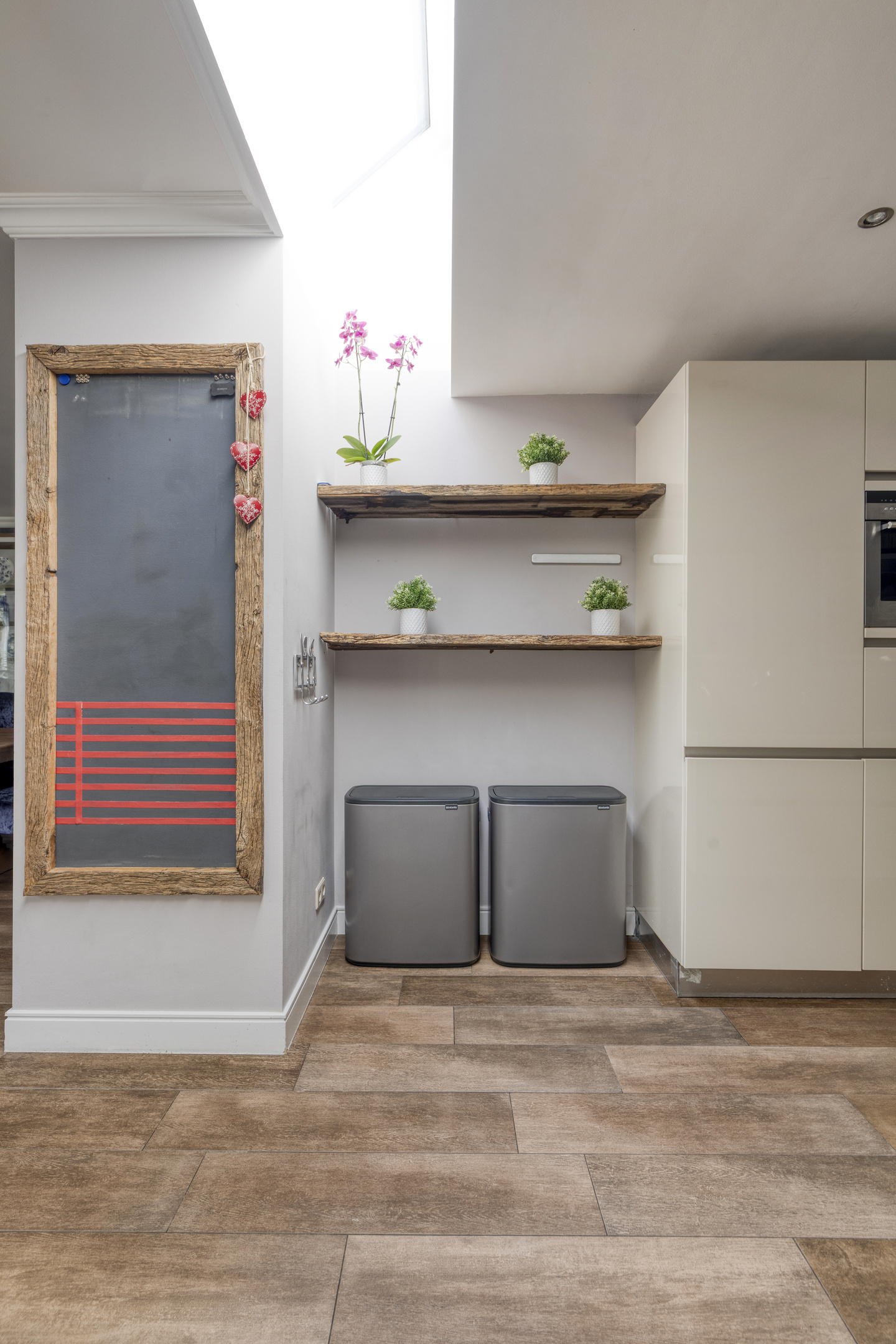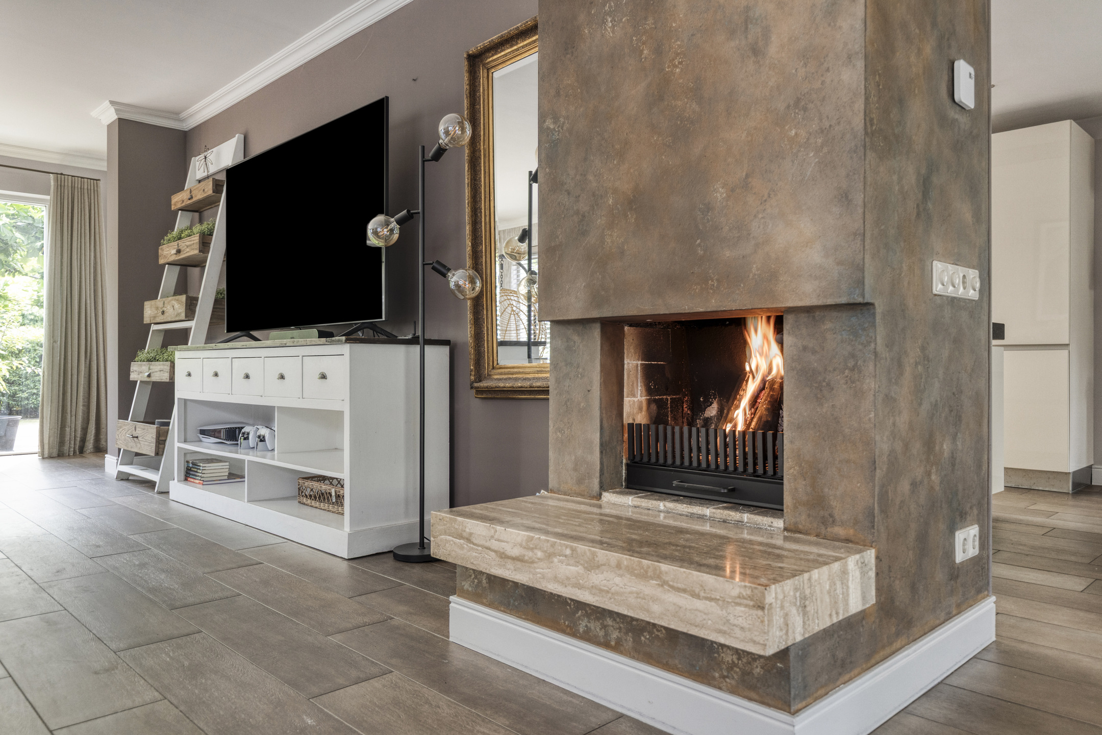 De gehele begane grond inclusief de veranda is voorzien van een houtlook tegelvloer met vloerverwarming.