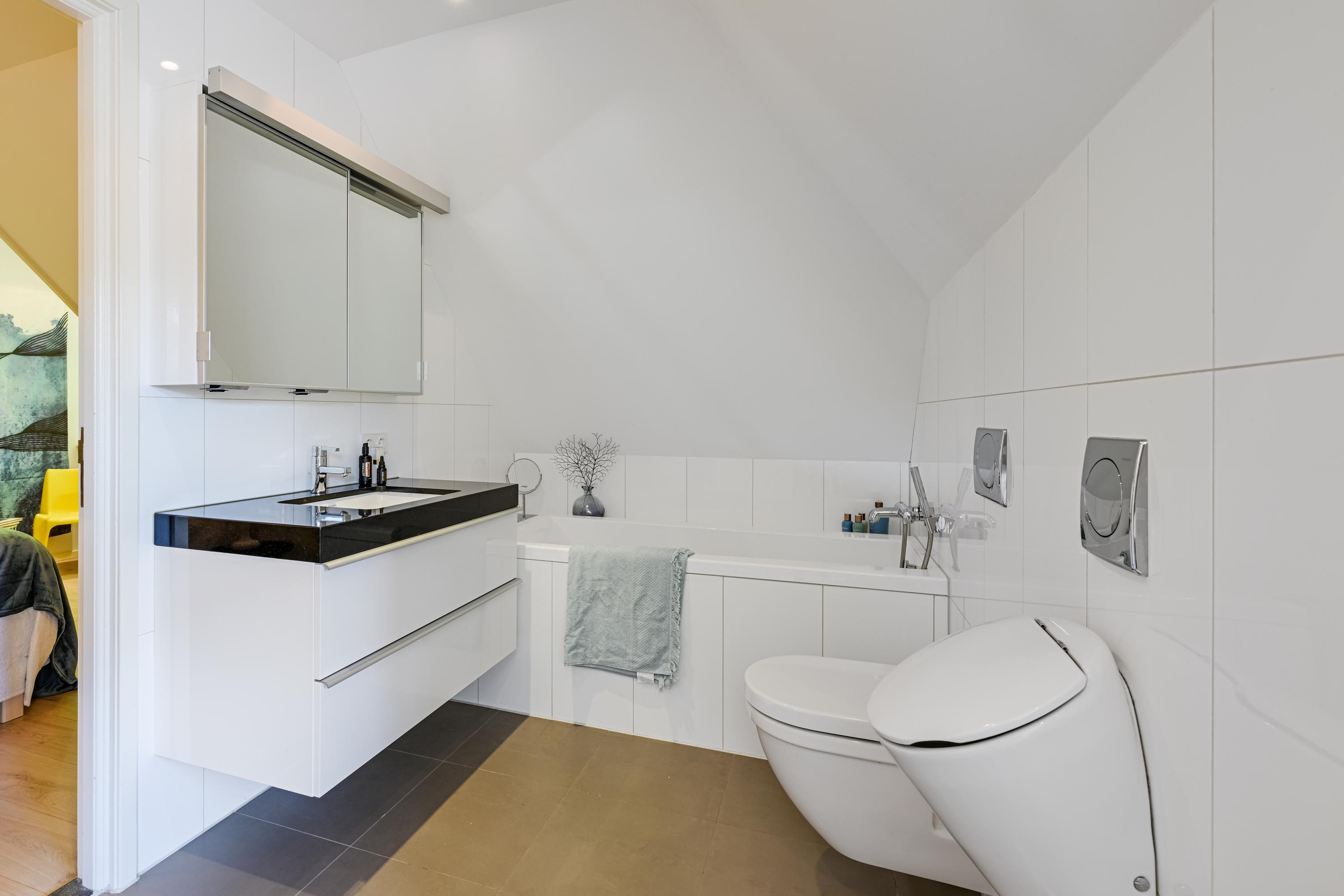 Hal met bordestrap en lift, werkkamer met ronde erker met prachtig uitzicht, ruime slaapkamer met toegang tot balkon, tweede grote (ouder-)slaapkamer met beschut balkon met fraai uitzicht over de tuin, gang naar kleedkamer en eigen badkamer met ligbad, douche, dubbele wastafel in meubel, urinoir en toilet, vloerverwarming. Derde slaapkamer en vierde slaapkamer beide met dakkapel en beide met toegang naar badkamer met bad, douche, toilet, urinoir, wastafelmeubel en vloerverwarming.