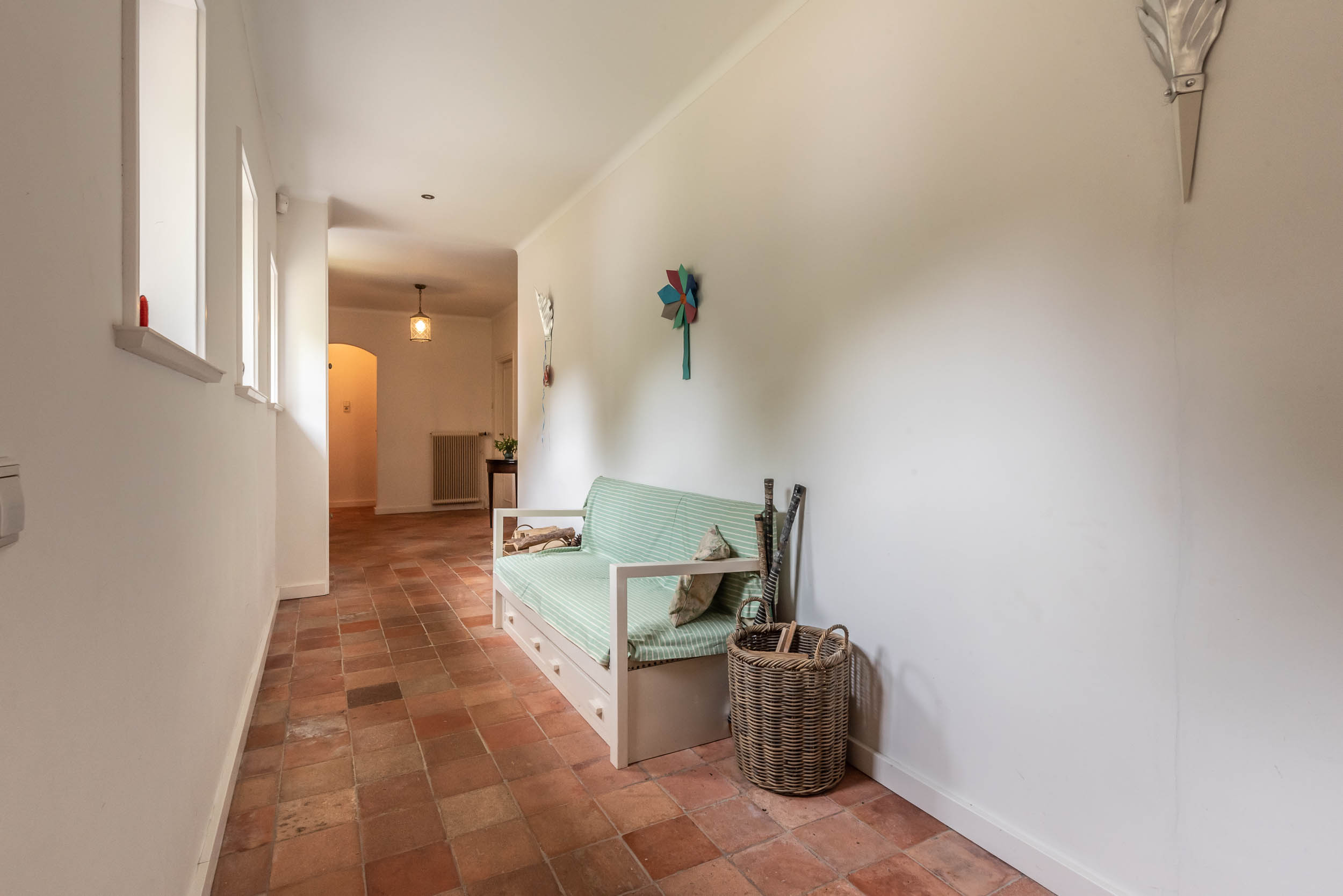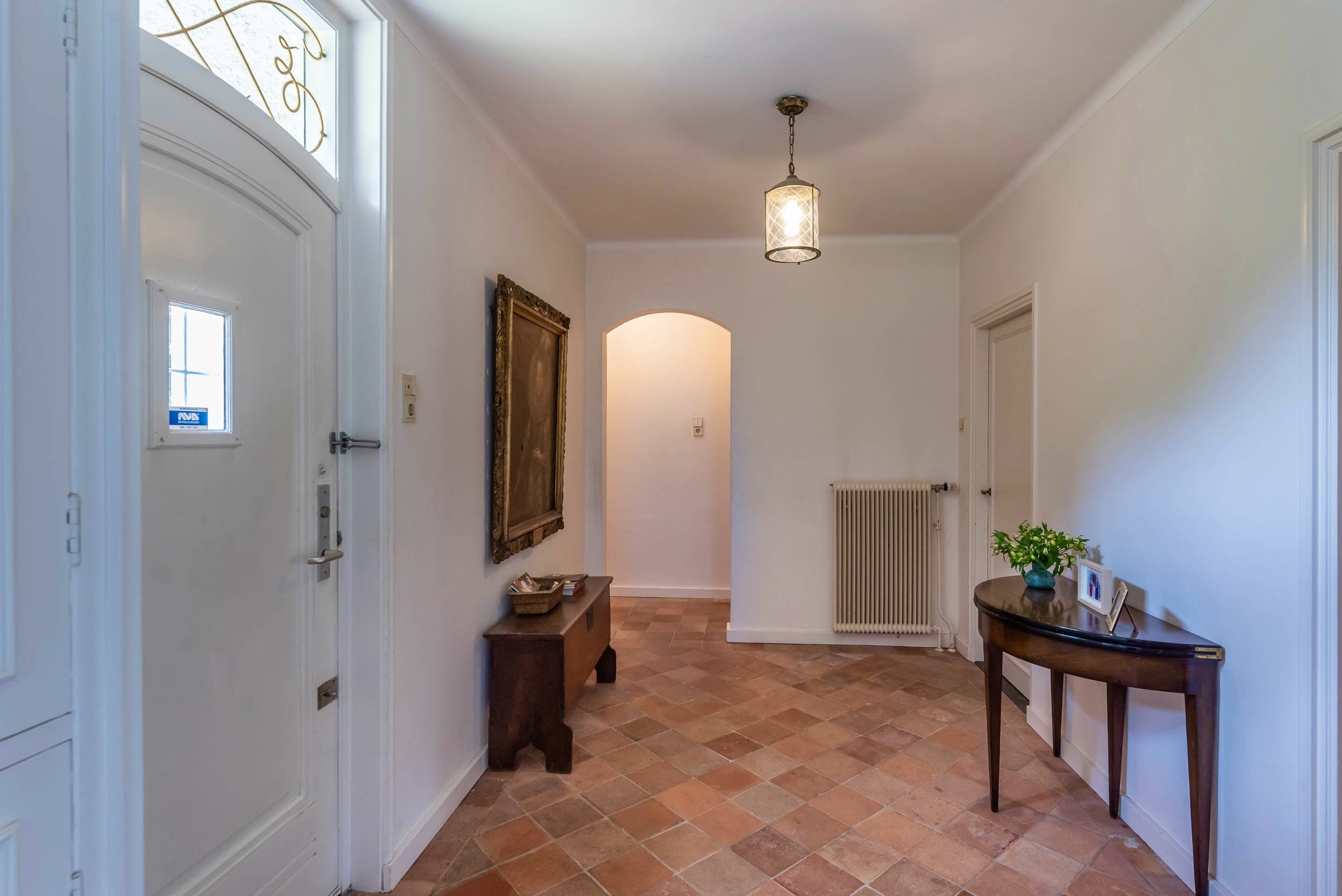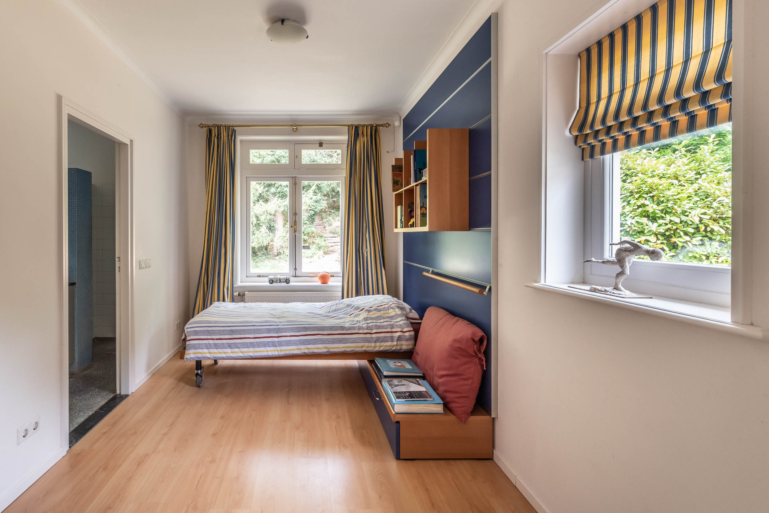 Oorspronkelijk gedeelte: entree, gezellige hal met tegelvloer van Piet Jonker, doorgang naar aparte garderobe en wc met fonteintje. Lichte woonkamer met zicht op de tuin, open haard, parketvloer, op maat gemaakte boekenkast en openslaande deuren naar de prachtige tuin. De woonkamer staat in open verbinding met de eetkamer en een werkkamer die daar weer op aansluit. De gang geeft toegang tot de trap naar de kelder en garage en tot drie slaapkamers en een tweede badkamer. De hoofdslaapkamer heeft een eigen badkamer met bad, dubbele wastafel (meubel) en vloerverwarming en een inloopgarderobe en openslaande deuren naar balkon en tuin.