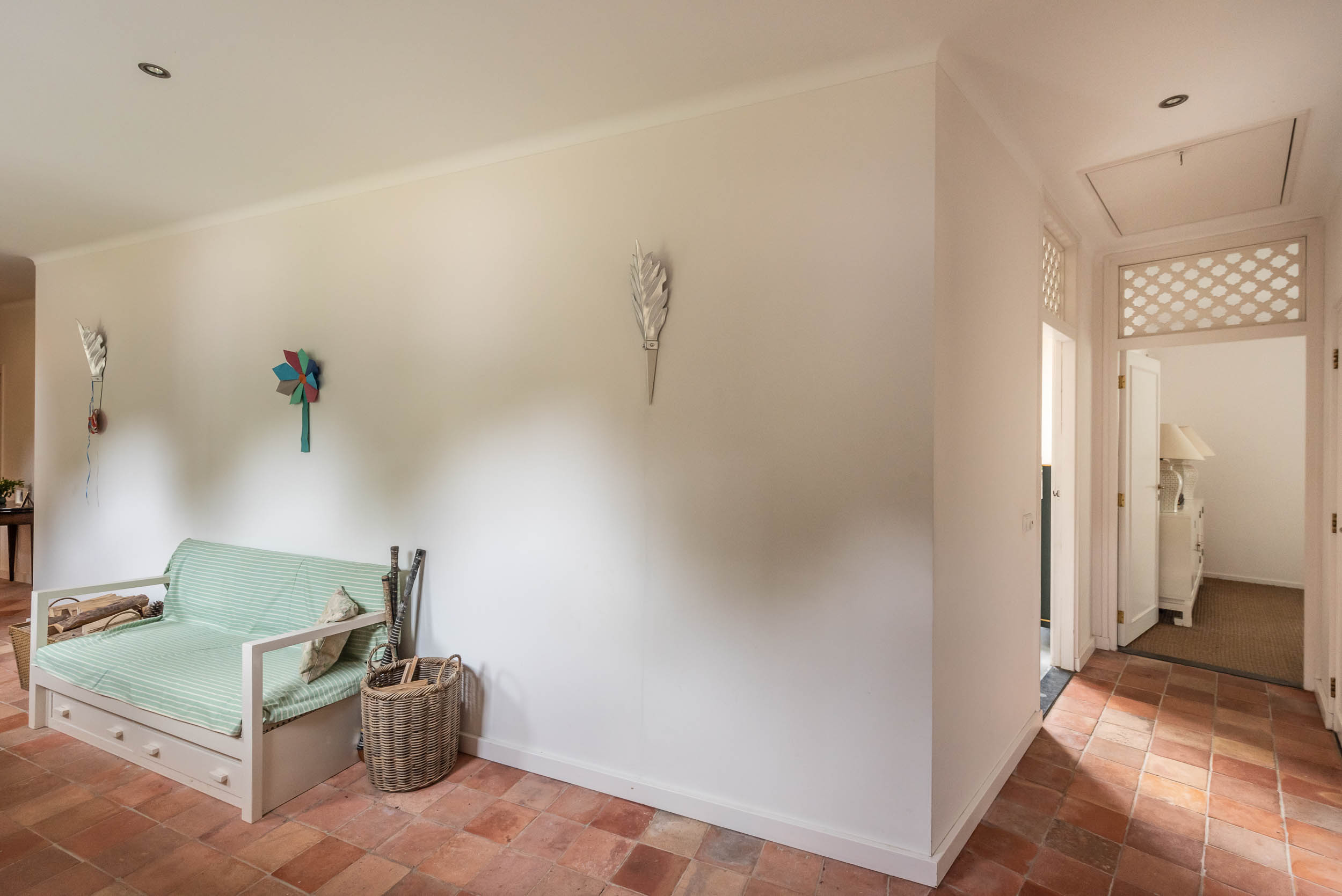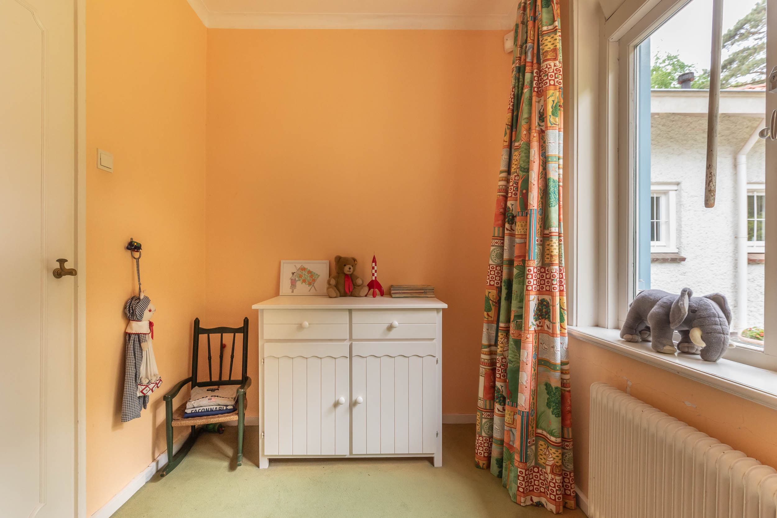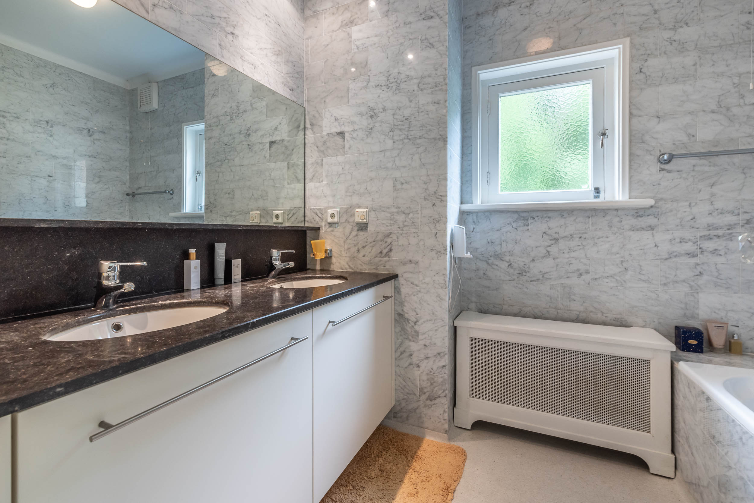 Oorspronkelijk gedeelte: entree, gezellige hal met tegelvloer van Piet Jonker, doorgang naar aparte garderobe en wc met fonteintje. Lichte woonkamer met zicht op de tuin, open haard, parketvloer, op maat gemaakte boekenkast en openslaande deuren naar de prachtige tuin. De woonkamer staat in open verbinding met de eetkamer en een werkkamer die daar weer op aansluit. De gang geeft toegang tot de trap naar de kelder en garage en tot drie slaapkamers en een tweede badkamer. De hoofdslaapkamer heeft een eigen badkamer met bad, dubbele wastafel (meubel) en vloerverwarming en een inloopgarderobe en openslaande deuren naar balkon en tuin.