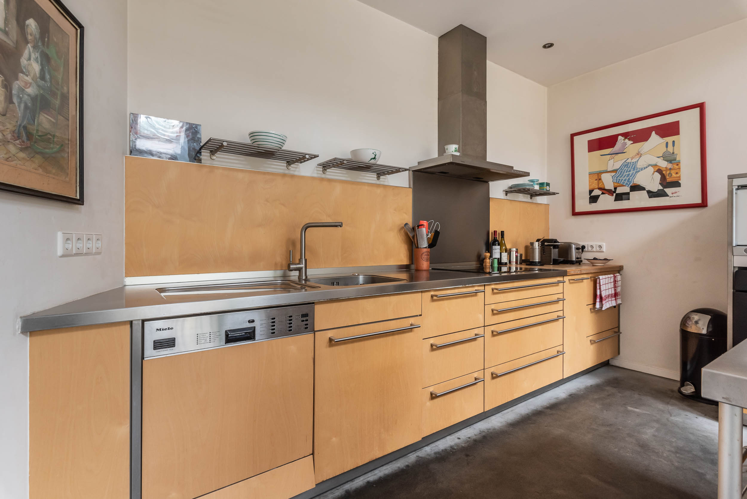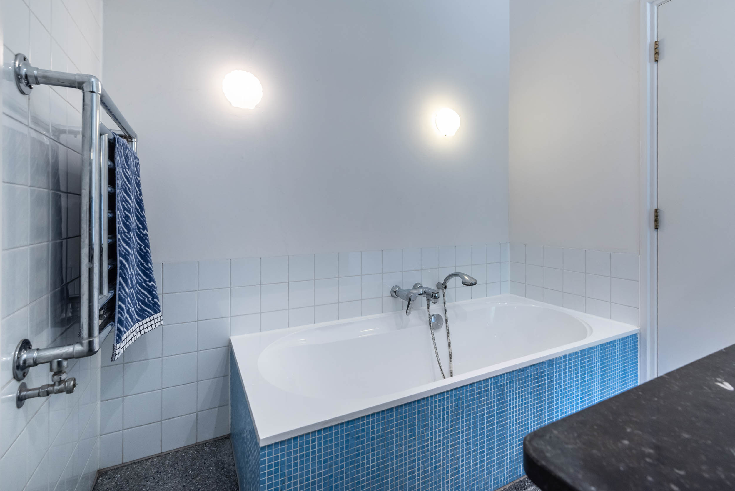 Aanbouw 2001: gezellige ruime woonkeuken met hoog plafond, open haard, terrazzovloer met vloerverwarming, openslaande deuren naar het zonnige terras. De Bulthaup keuken met werkeiland is uitgerust met diverse apparatuur, w.o. Gaggenau stoomoven. Diepe voorraadkast/bijkeuken met uitstortgootsteen. Twee slaapkamers die beide aansluiten op de badkamer met wc, bad, inloopdouche en dubbele wastafel (meubel) en vloerverwarming.