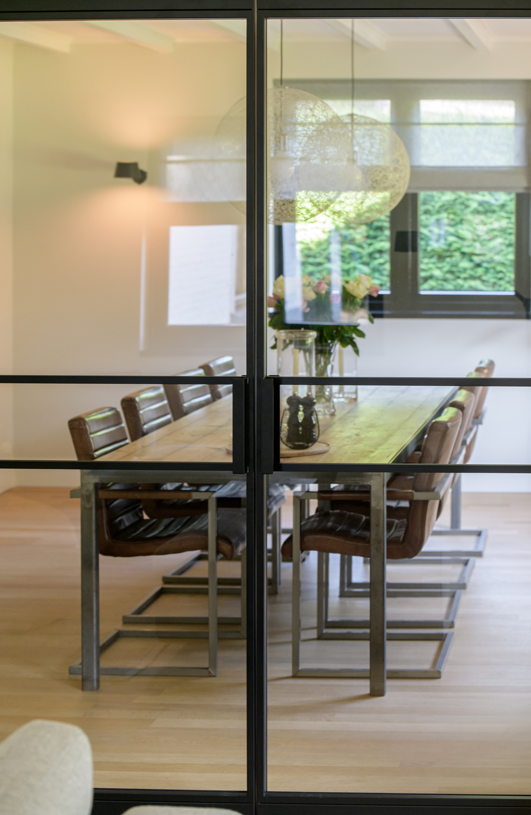 De stalen deuren geven toegang tot de aparte zitkamer, grenzend aan de achtertuin. Twee openslaande deuren geven toegang tot de achtertuin.