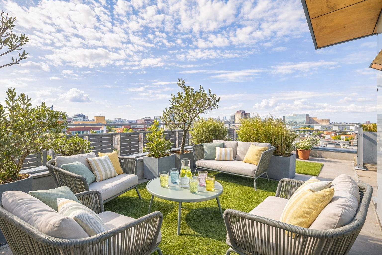 Buiten wordt binnen: maar liefst 98 m² aan zonnige dakterrassen op het zuidoosten én zuidwesten garanderen zon van ’s ochtends vroeg tot zonsondergang.