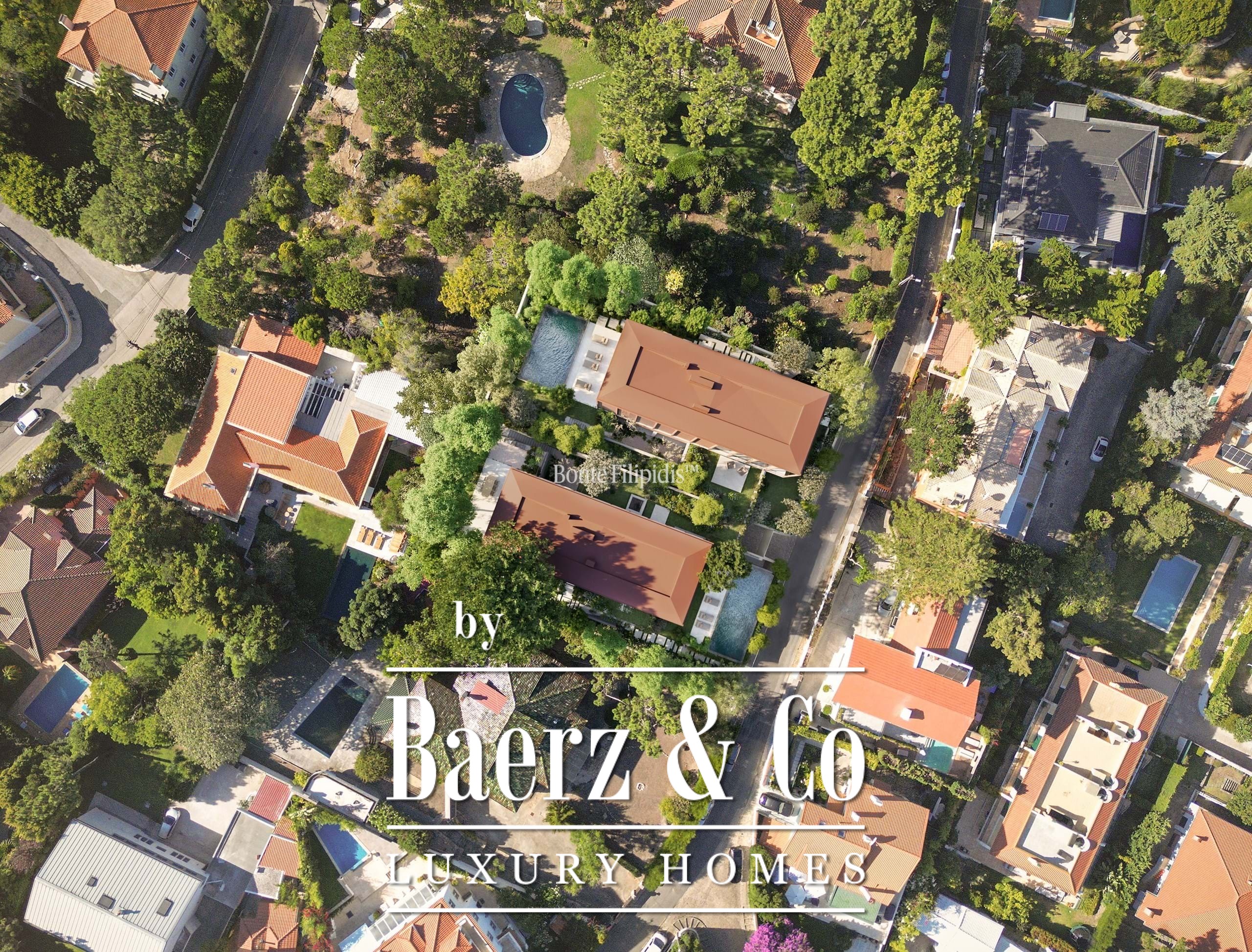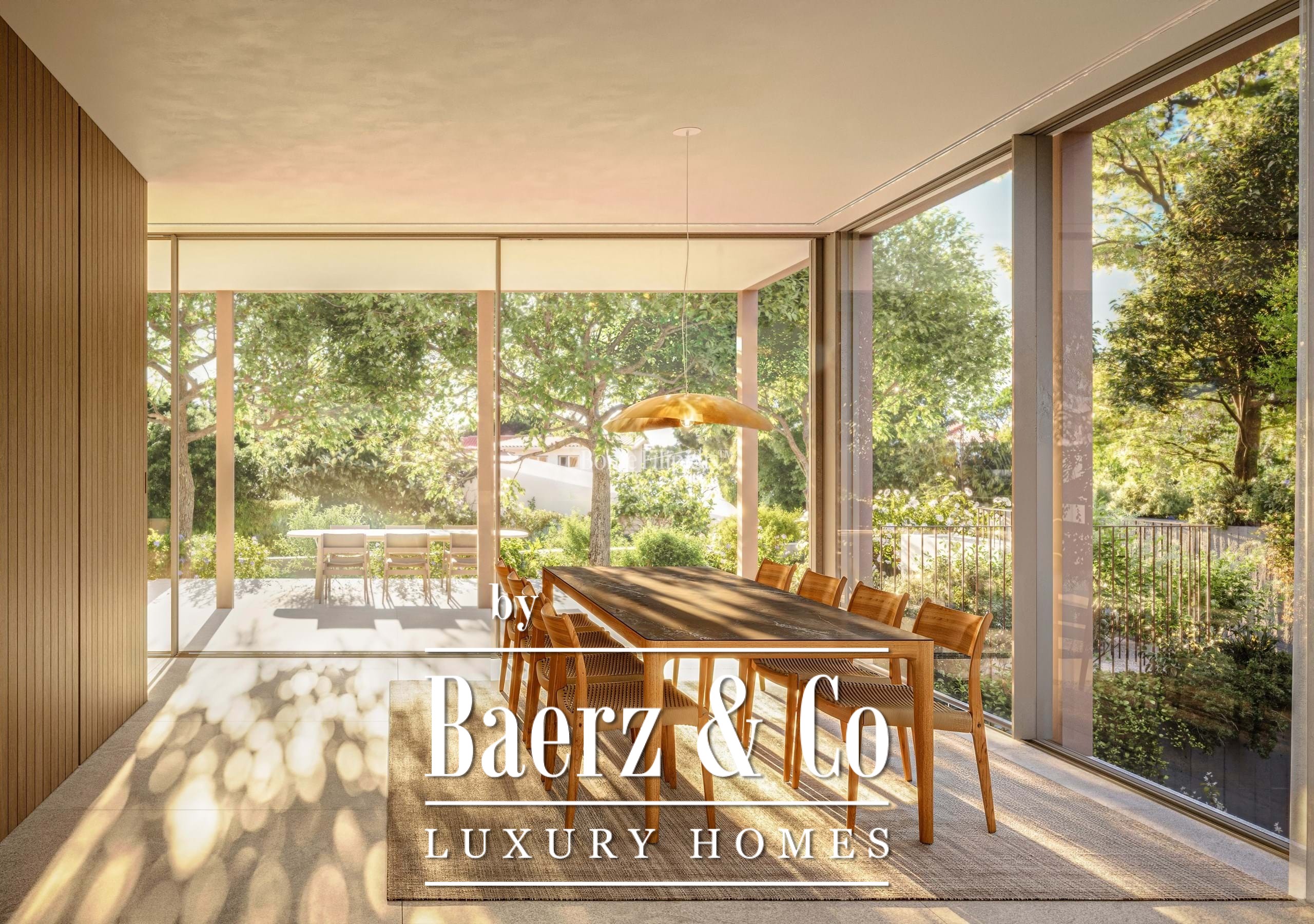 Licht stroomt op alle drie de woonlagen binnen via aluminium kozijnen van vloer tot plafond, wat zorgt voor thermisch en akoestisch comfort in combinatie met een ingetogen, serene uitstraling. Vier slaapkamers en vijf badkamers bieden privacy en ruimte, waaronder een primaire suite van 52 m² met inloopkast en directe toegang tot de tuin en het zwembad. De woon- en ontvangstruimten lopen vloeiend over in 727 m² aangelegde terrassen, schaduwrijke patio’s en een verwarmd zwembad van 63 m², wat zorgt voor een soepele overgang tussen binnen en buiten.