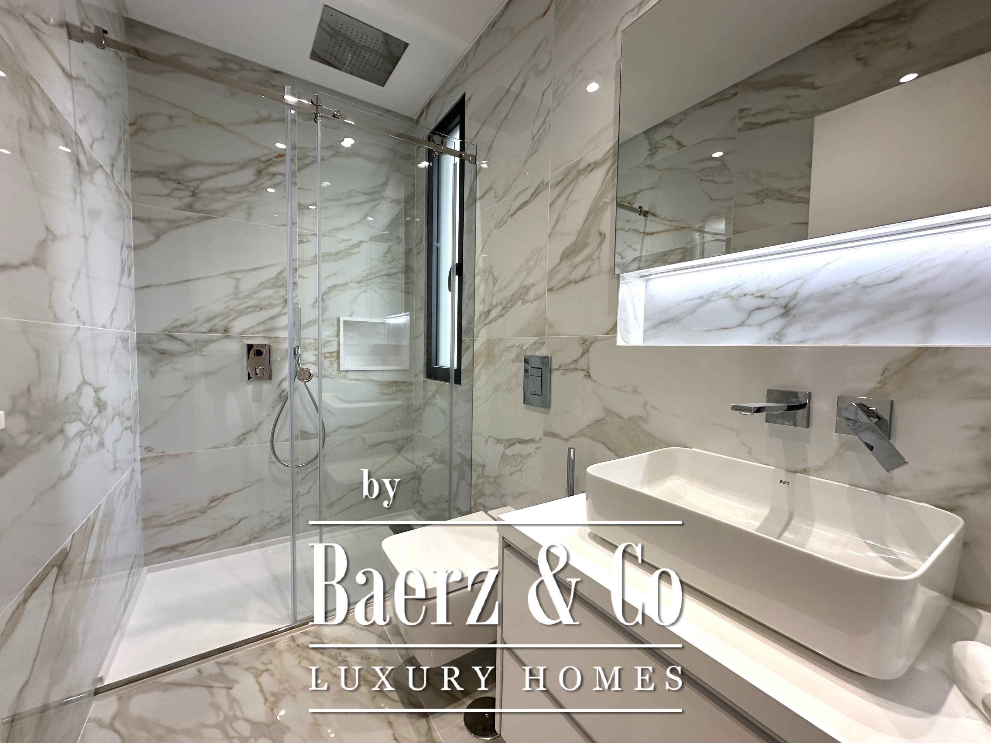Het souterrain biedt drie verdere suites van 27 m², 13,43 m² en 12 m², elk afgewerkt volgens hoogwaardige standaarden. Doordat er geen inbouwkasten zijn, kunnen de interieurs volledig op maat worden gerealiseerd. Een royaal dakterras van 106 m² bekroont de woning en biedt uitzicht en ruimte voor ontspannen buitenleven, ondersteund door een technische ruimte van 27 m². Extra voorzieningen omvatten een privé garage van 72 m², een wasruimte van 8 m² en extra technische bergruimte.