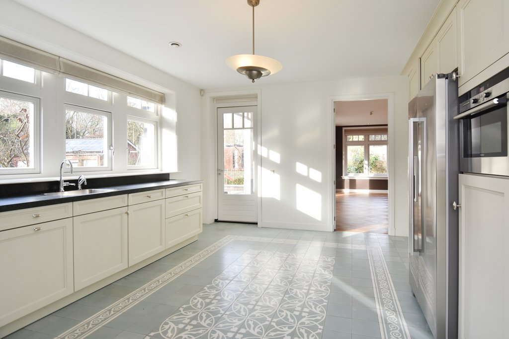 Entree, hal met garderoberuimte en meterkast. Ruime hal met aangrenzend de studeerkamer (3.80 x 3.40m). Toiletruimte. Woonkamer met fraaie visgraat-parketvloer en open haard. De woonkamer heeft meerdere openslaande deuren naar de omliggende tuin. Woonkeuken (Siematic, 4.18 x 5.30m) met Amerikaanse koel-/vrieskast, 6-pitsgaskookplaat met oven, afzuigkap, vaatwasser en aparte combi oven-/magnetron. Bijkeuken alwaar aansluitingen voor de wasmachine en droger. Zonnig, riant terras (6.05 x 6.22m).