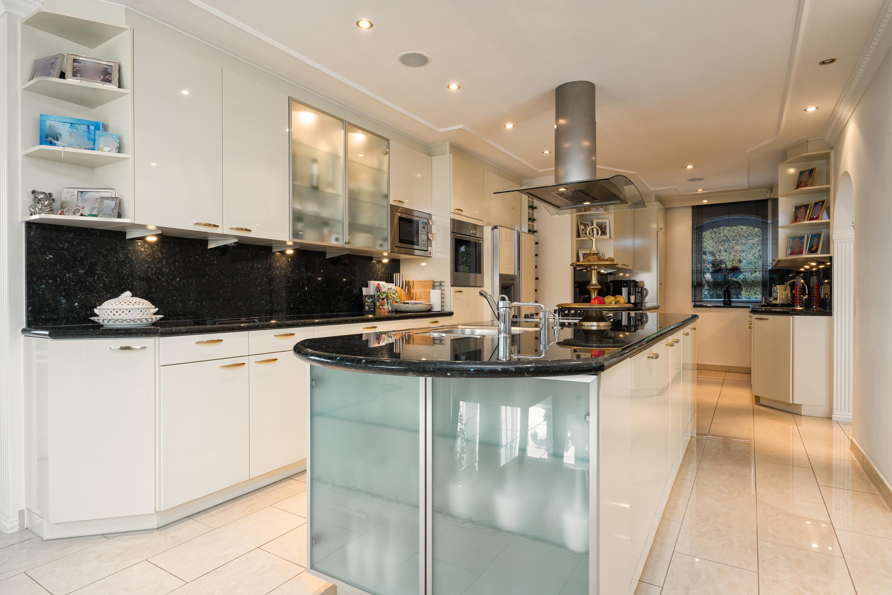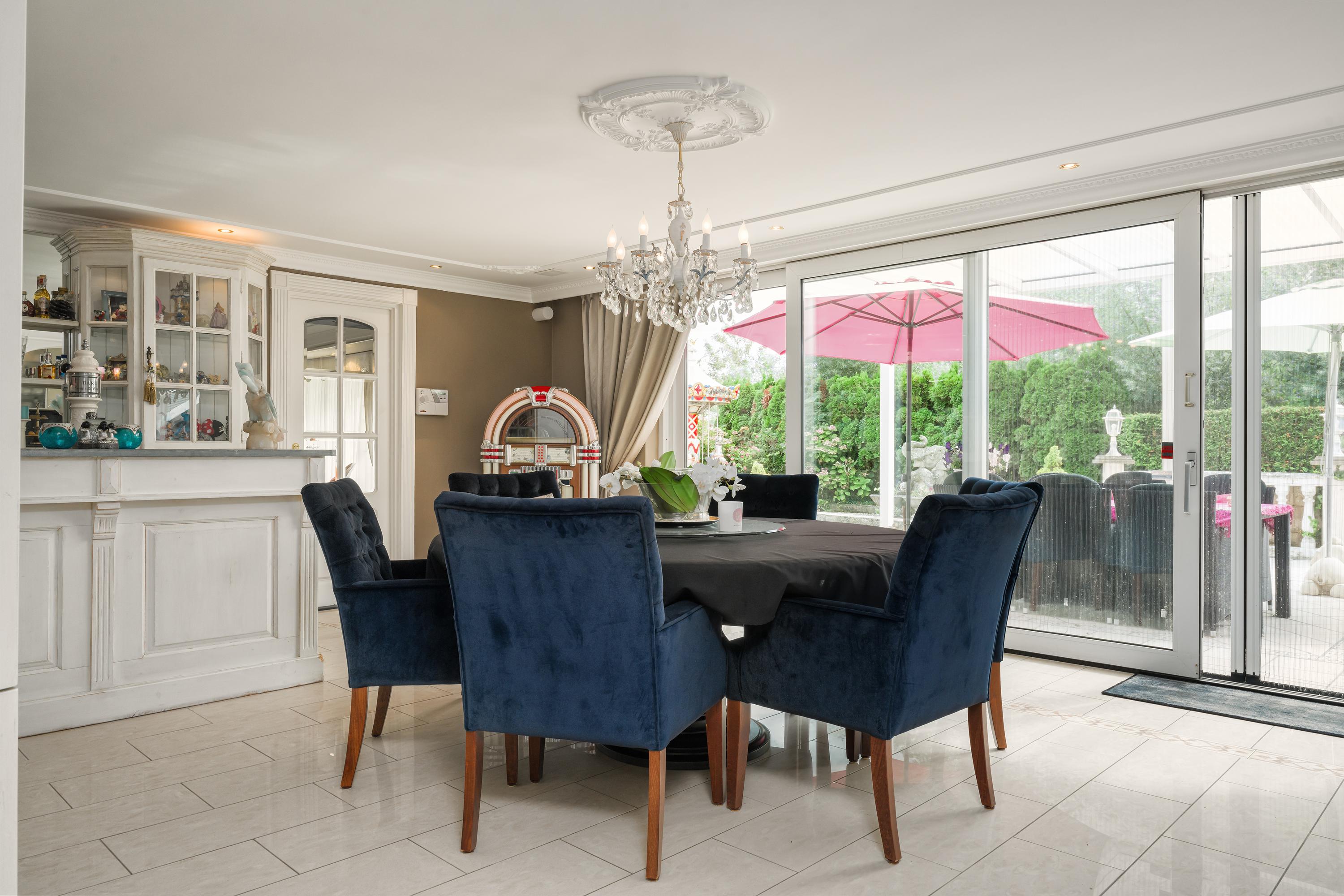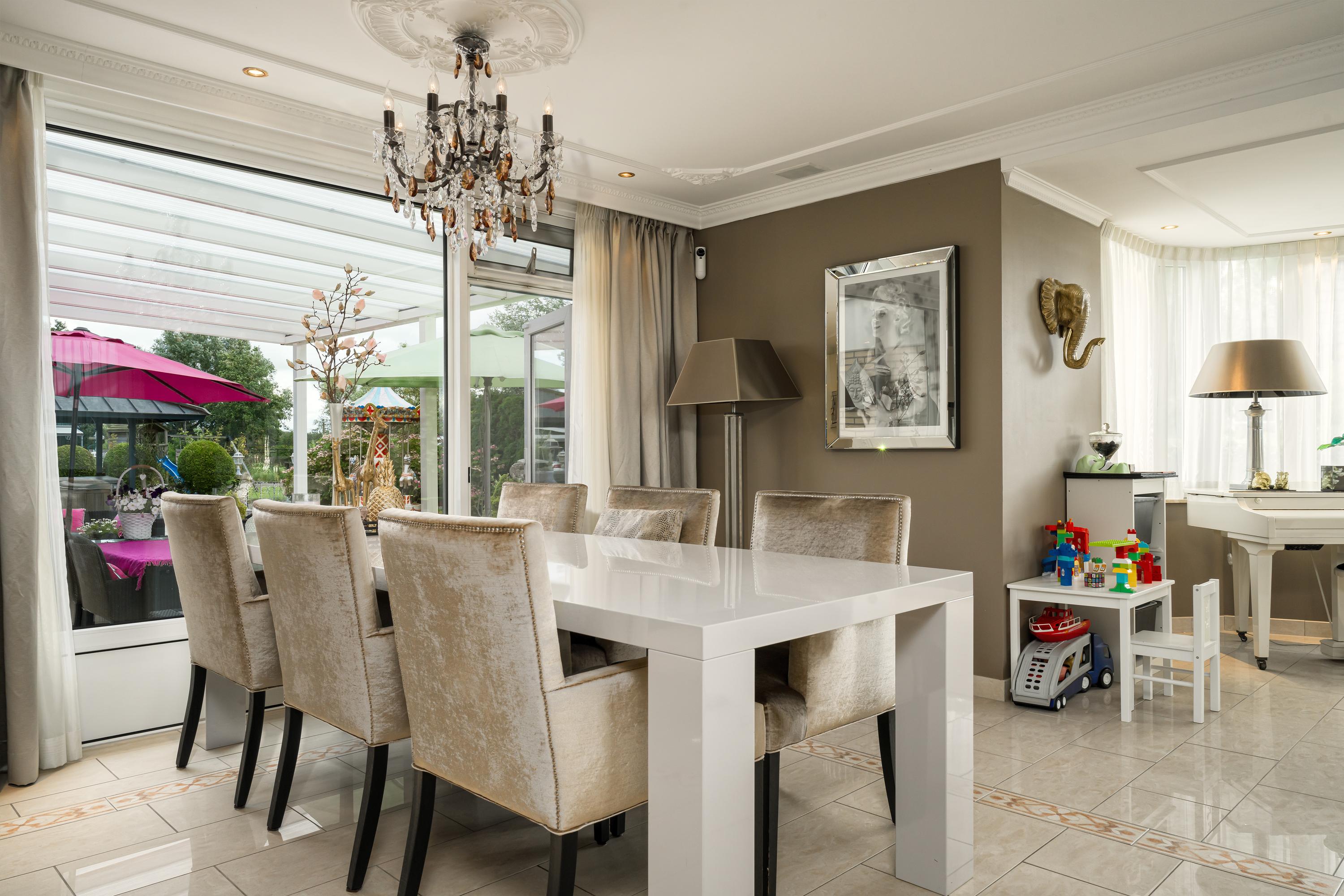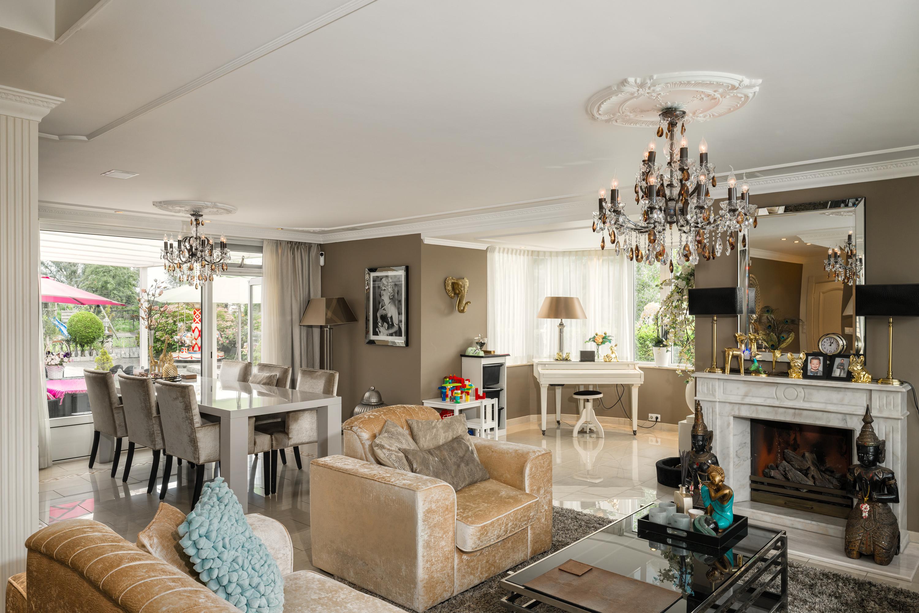 Zij-entree, hal, eetkamer, grenzend aan de tuin / het terras, open keuken met eiland, living met erker en open haard, bijkeuken, badkamer 1, trapopgang naar de verdieping. Masterbedroom met open 2e badkamer, doorgang naar de ruime wellness ruimte met sauna en kledingkasten. Ook vanuit de masterbedroom en de wellness ruimte heb je toegang tot de tuin via de ruime puien.