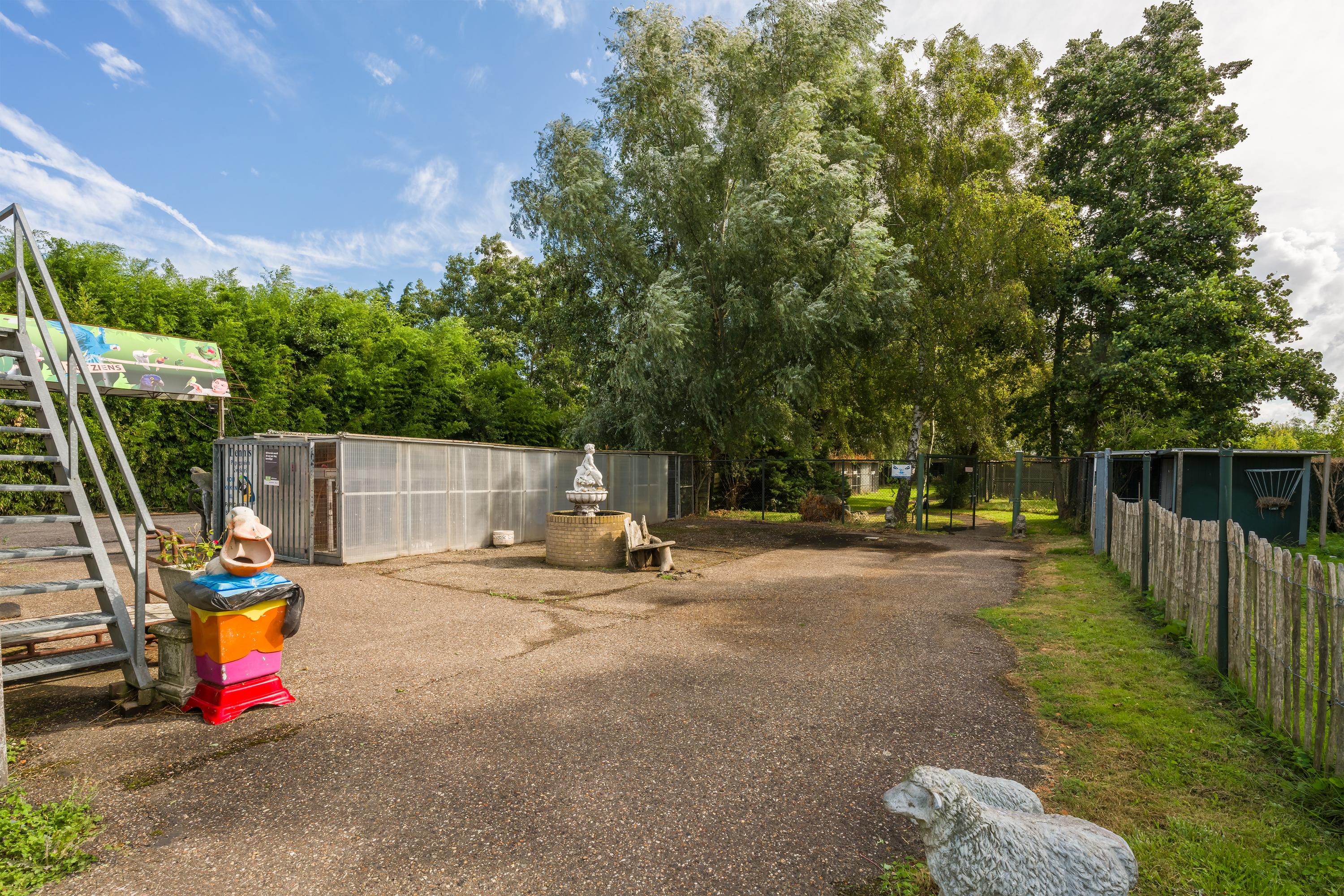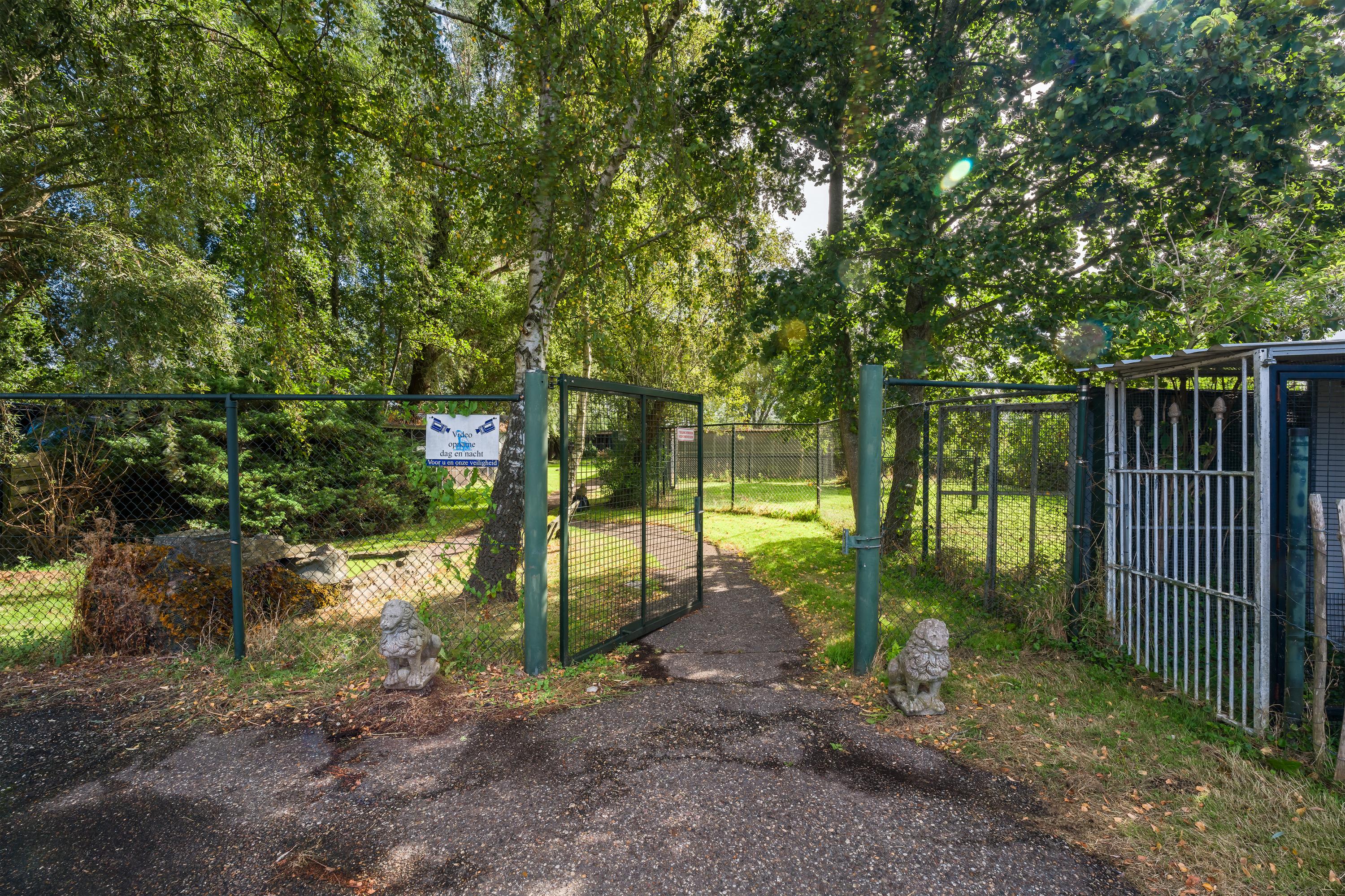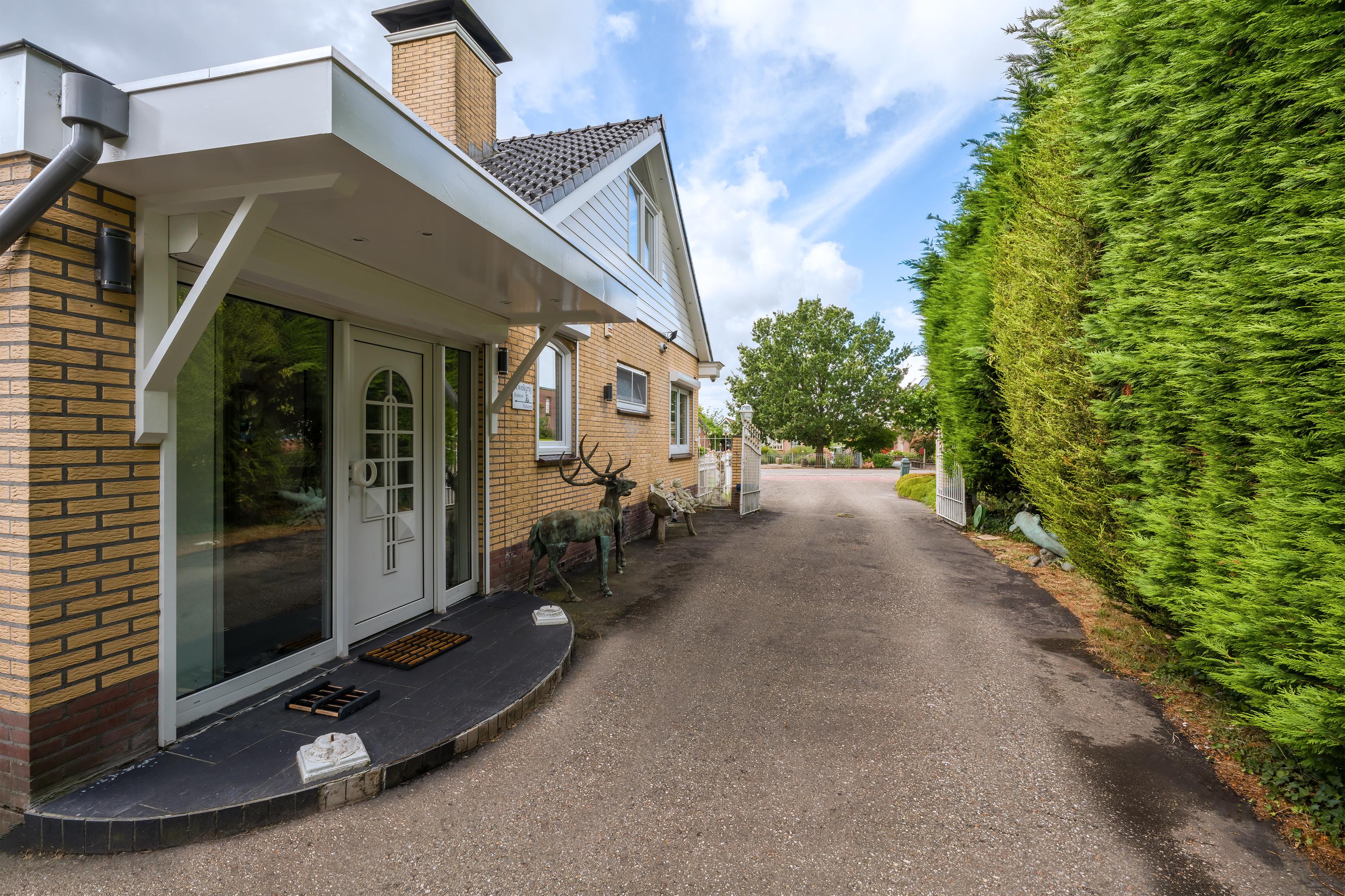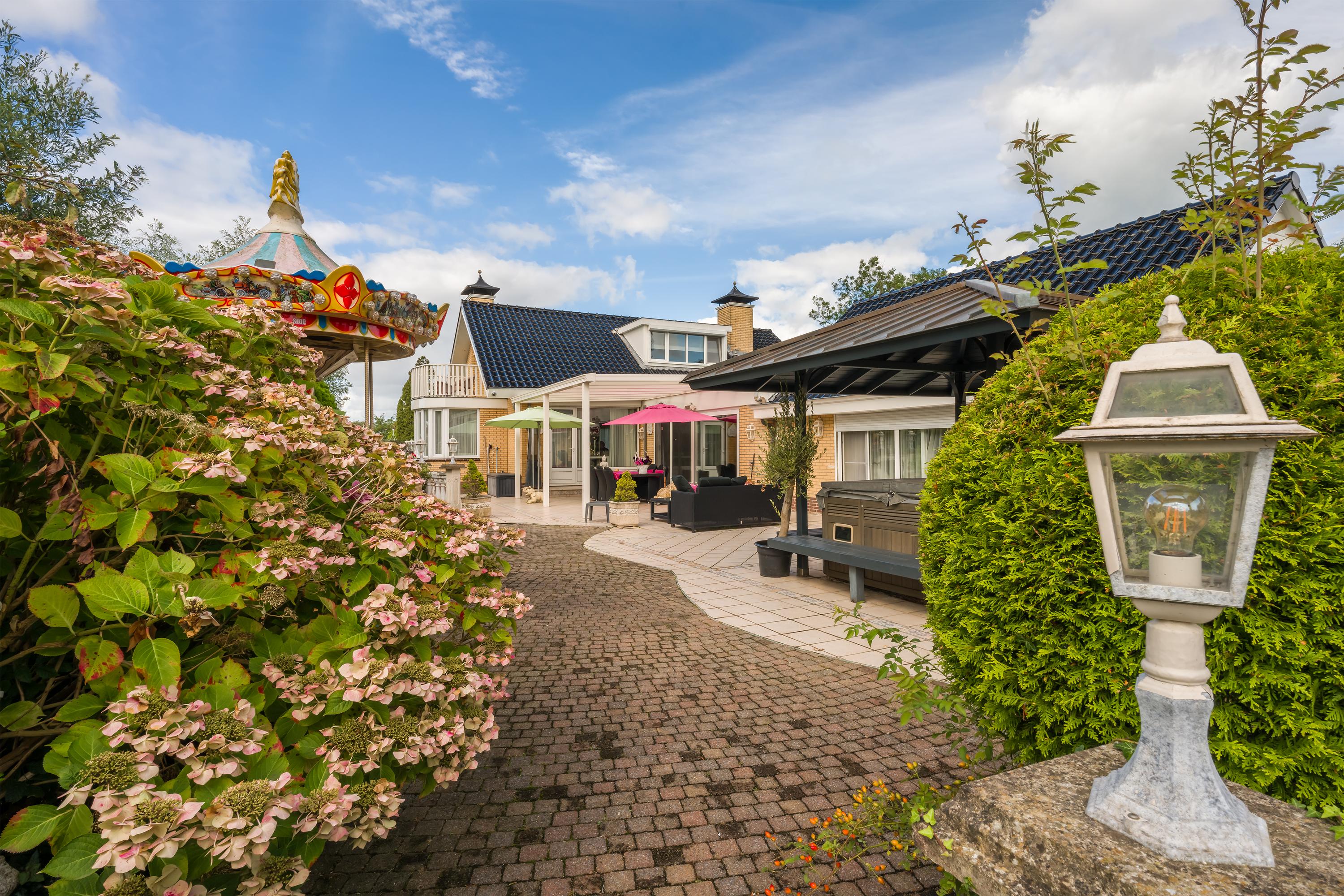 Een prachtig afgesloten privé domein ligt verscholen achter deze -slim op de kavel gesitueerde - vrijstaande woning met guesthouse. Het geheel geeft een grootse vibe, zodra je komt aanrijden. Je oog valt op de witte ijzeren hekken die het groene perceel accentueren, als je de poort benadert. Je reis vervolgt over de asfalt oprit, om achter op het erf te draaien en te parkeren op de rotonde. Vanaf hier kijk je naar de Amerikaans aandoende bungalow met onderheid terras, naar het ruime guesthouse, naar de bedrijfsruimte en de dierenverblijven, waar ooit flamingo's het Noord Hollandse landschap sierden.