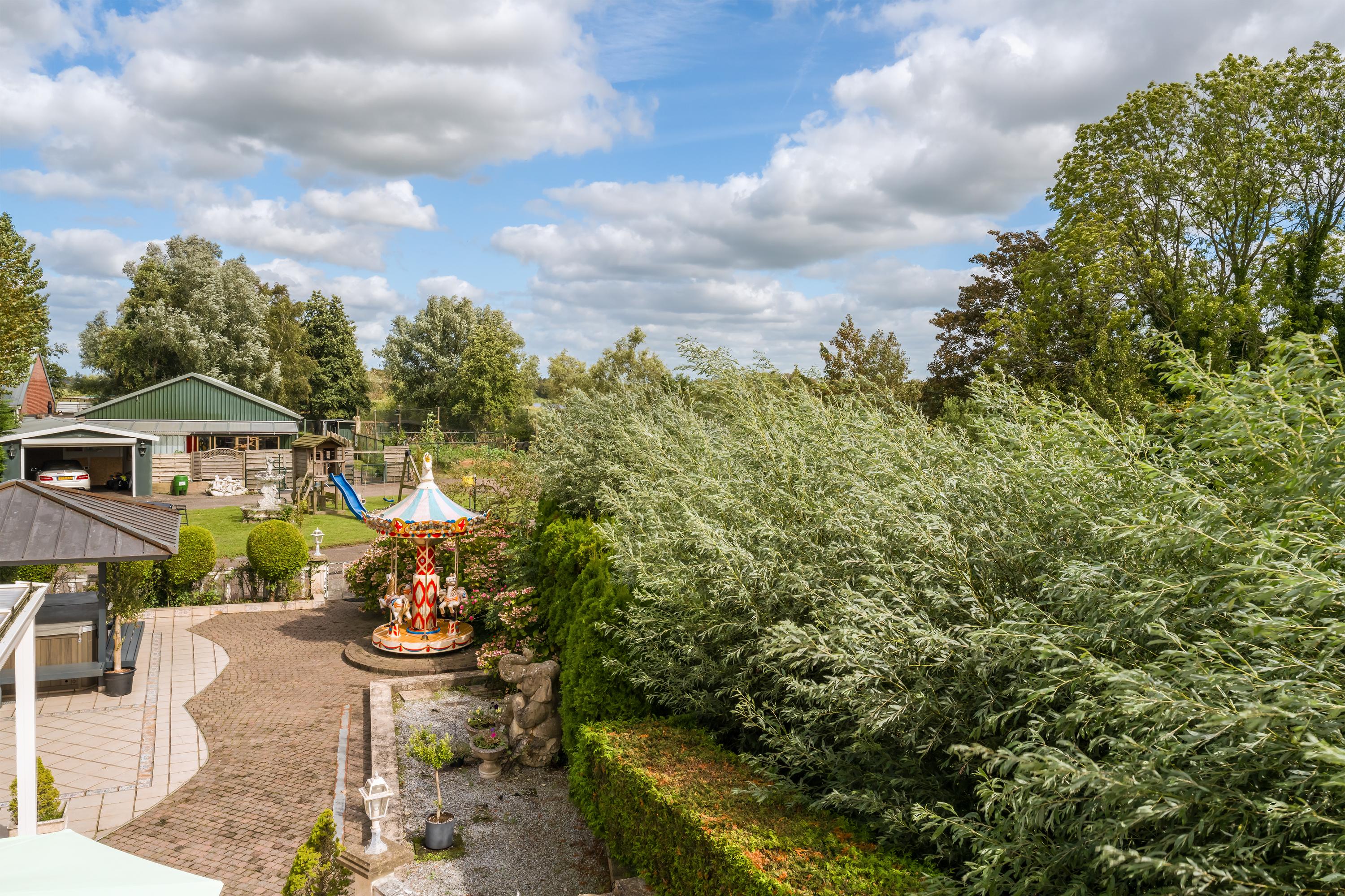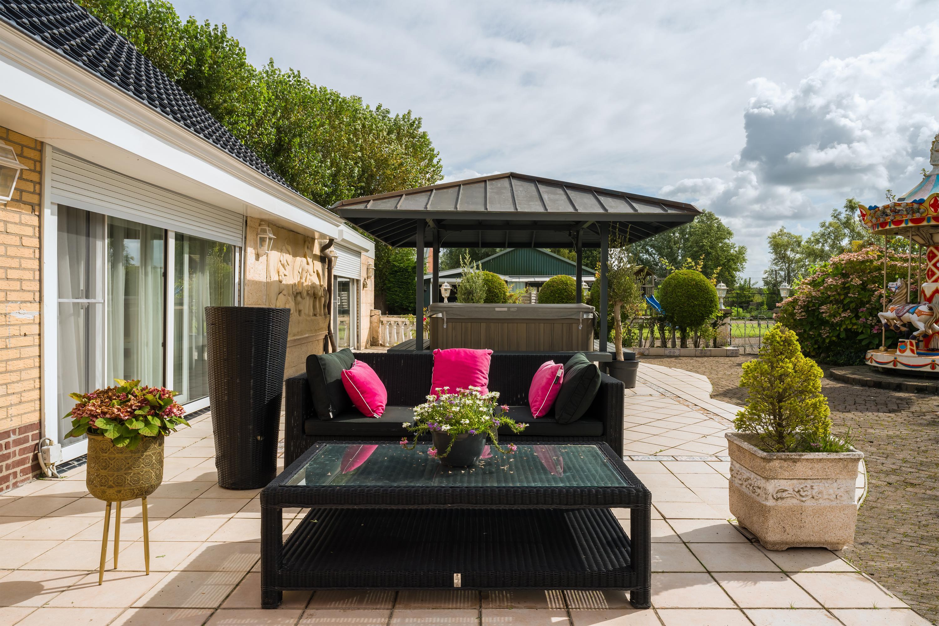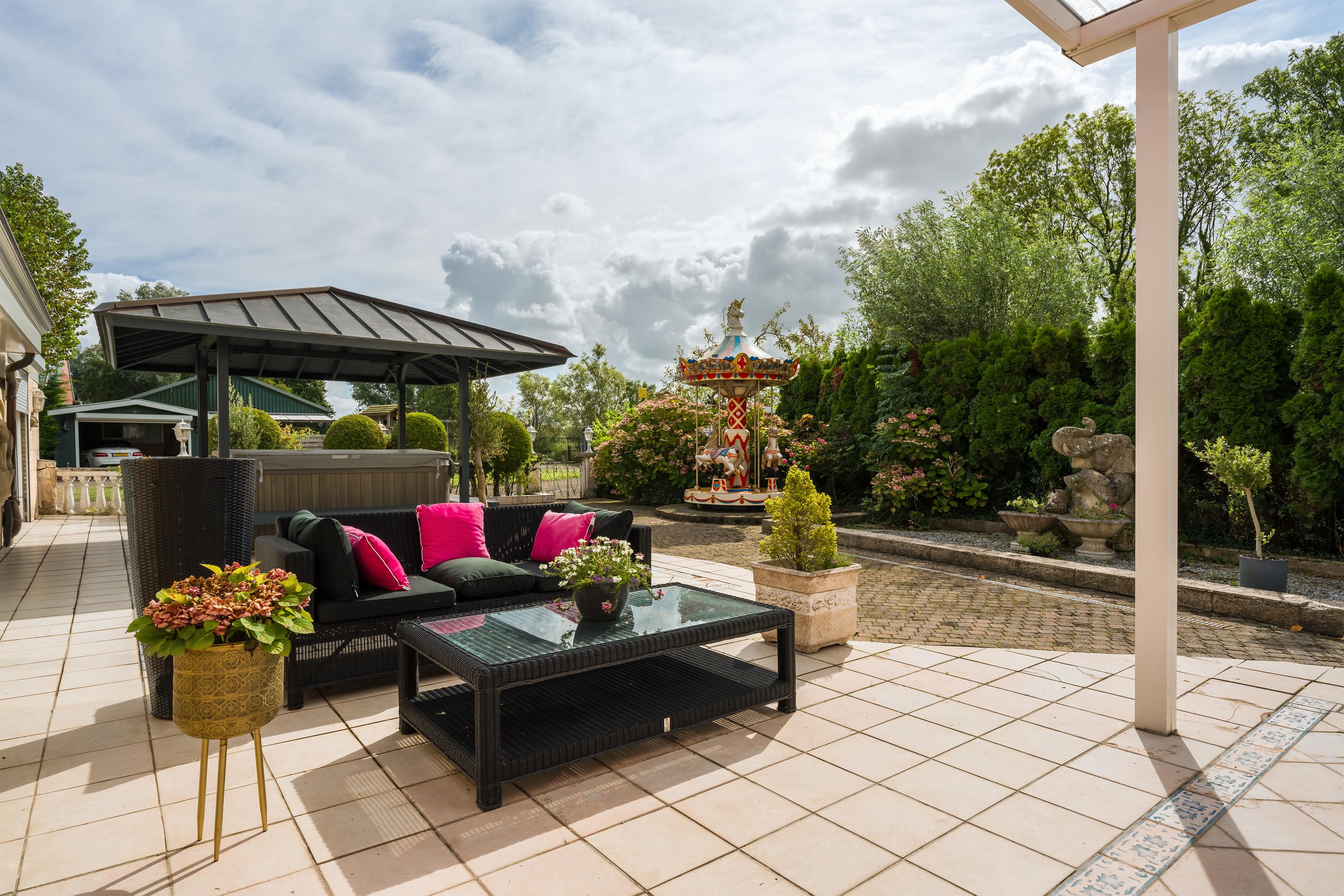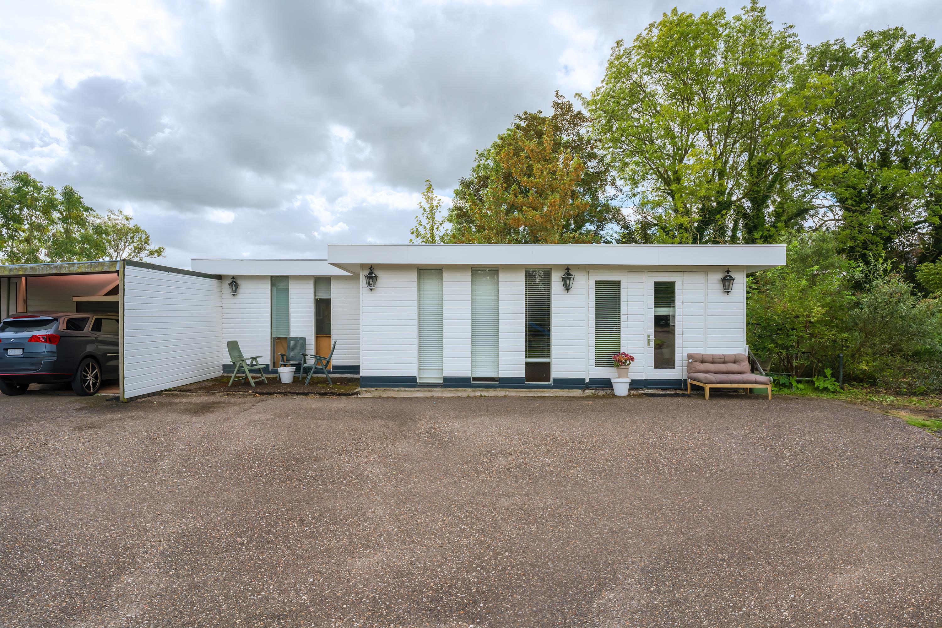 Een prachtig afgesloten privé domein ligt verscholen achter deze -slim op de kavel gesitueerde - vrijstaande woning met guesthouse. Het geheel geeft een grootse vibe, zodra je komt aanrijden. Je oog valt op de witte ijzeren hekken die het groene perceel accentueren, als je de poort benadert. Je reis vervolgt over de asfalt oprit, om achter op het erf te draaien en te parkeren op de rotonde. Vanaf hier kijk je naar de Amerikaans aandoende bungalow met onderheid terras, naar het ruime guesthouse, naar de bedrijfsruimte en de dierenverblijven, waar ooit flamingo's het Noord Hollandse landschap sierden.