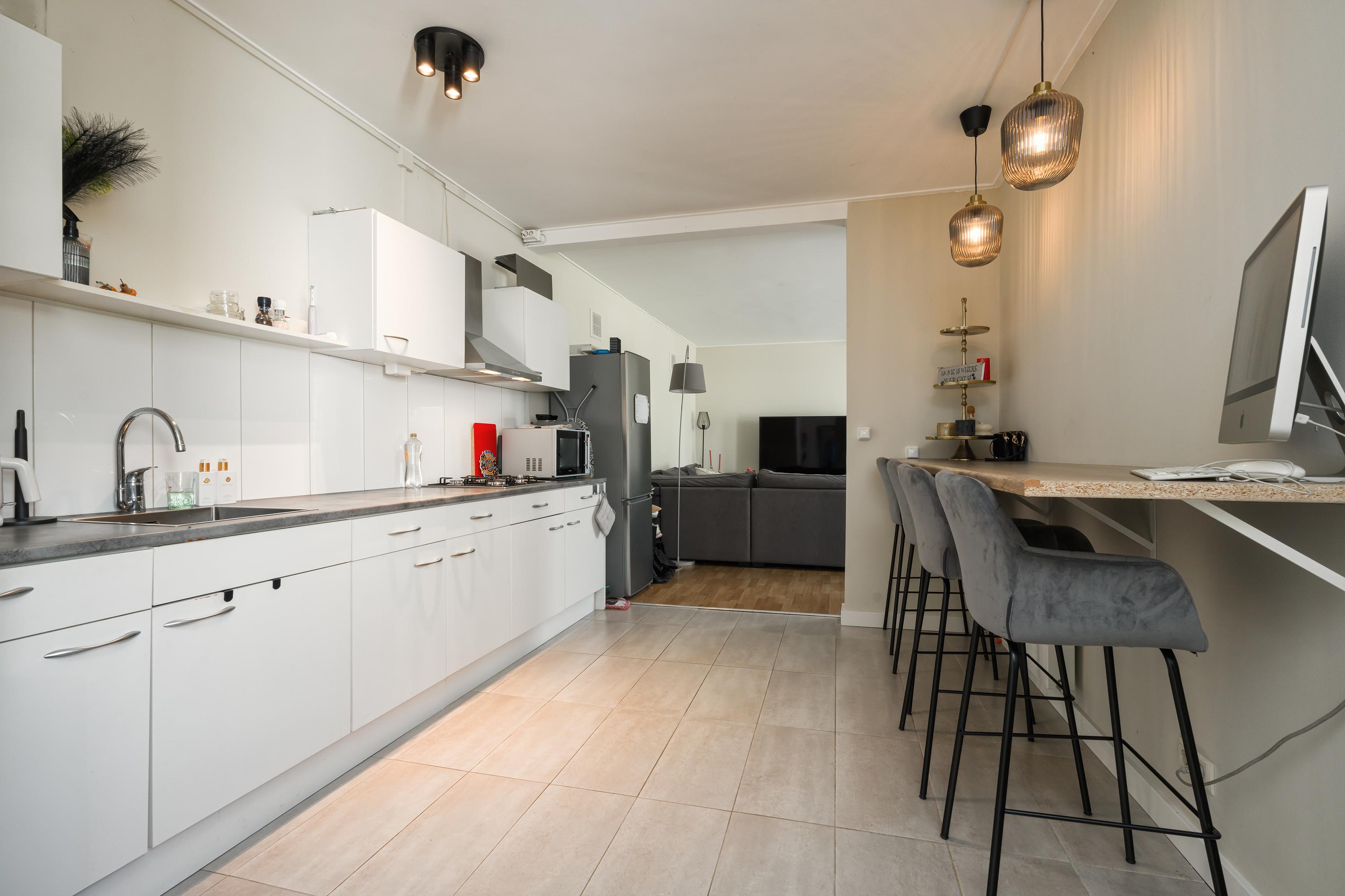 Zij entree, onder de dubbele carport, open keuken, douche, living, slaapkamer.