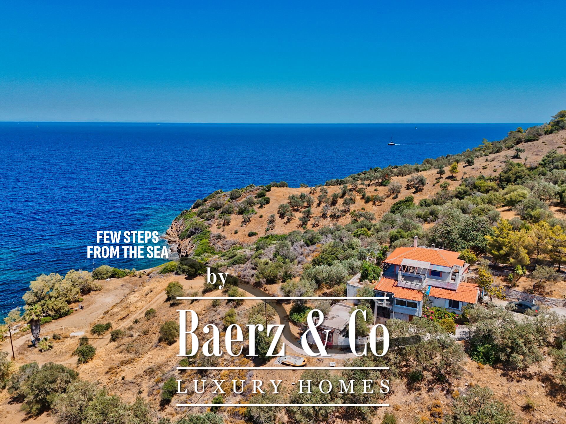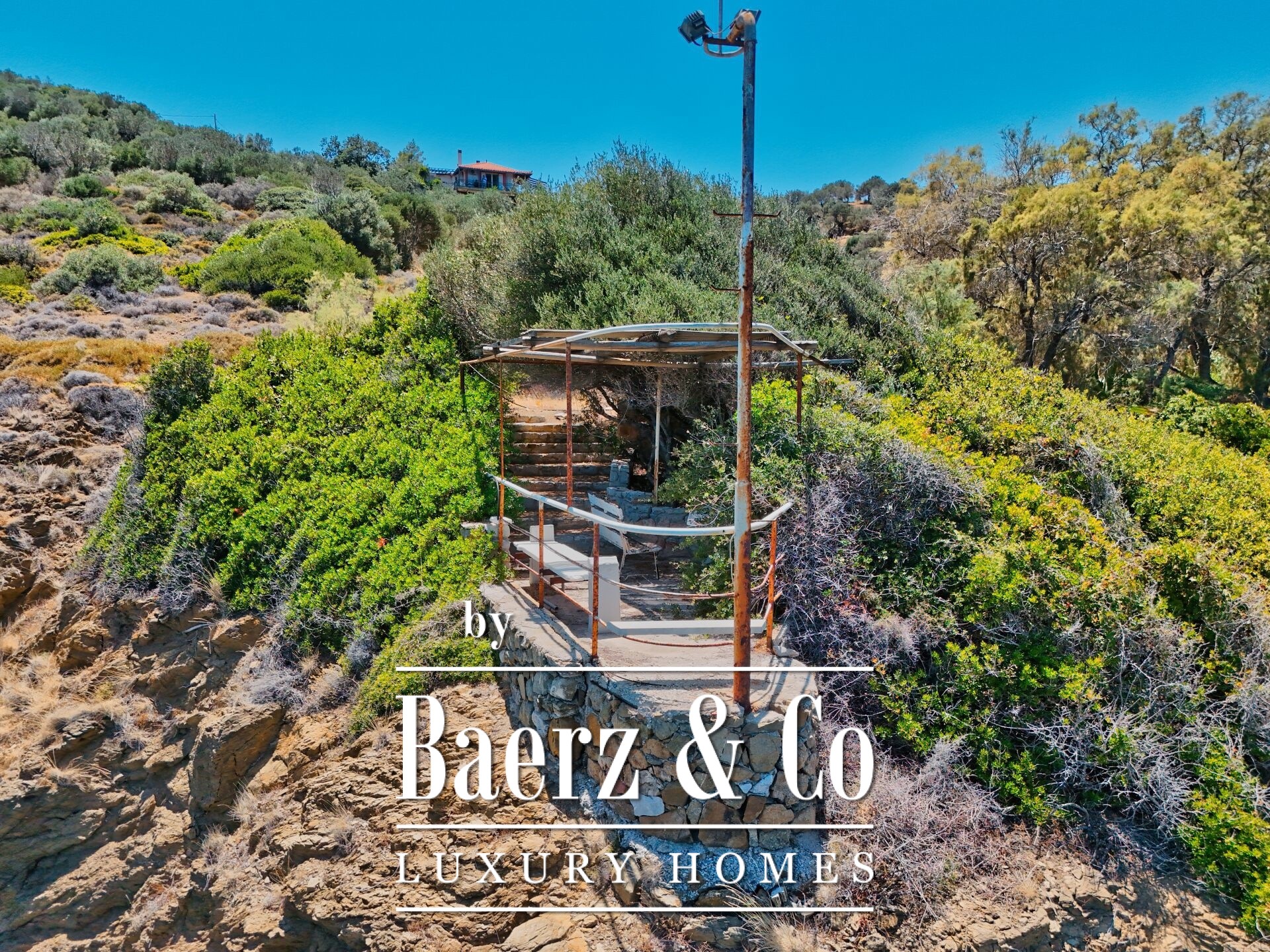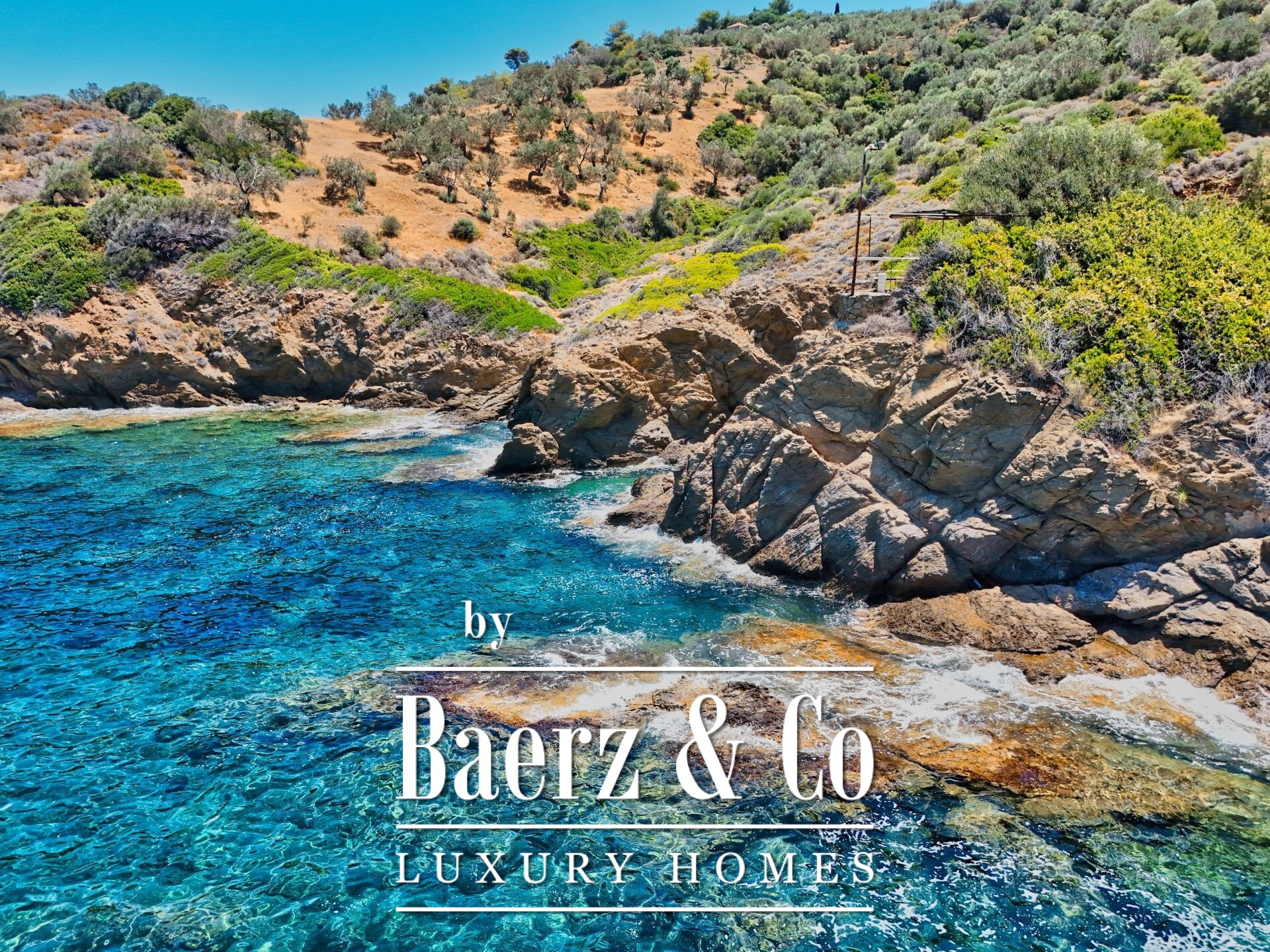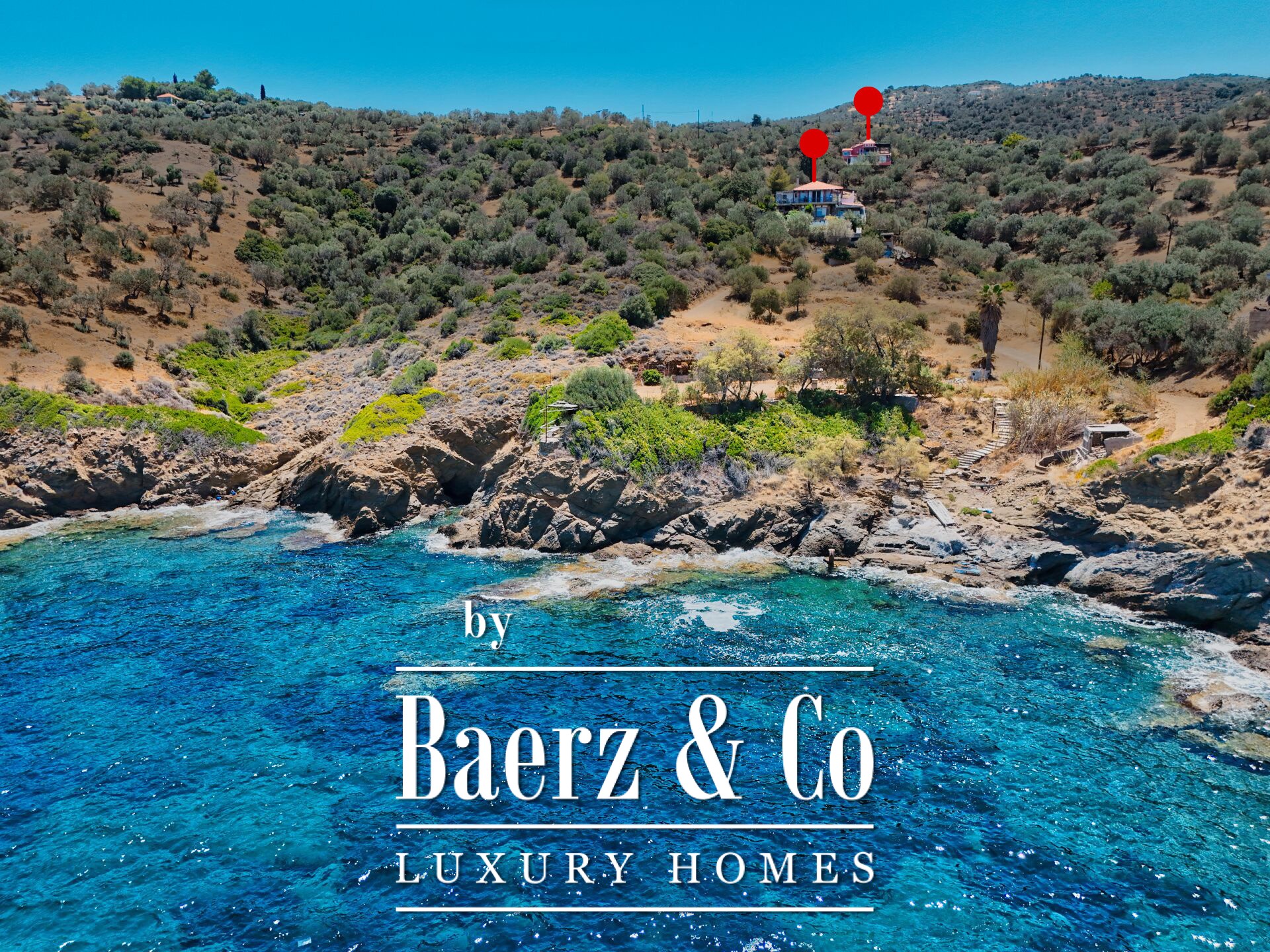 In an exceptionally beautiful and tranquil location, just 90 meters from the sea and a beach of wild, authentic beauty, a unified seaside plot of 12,997 sq.m. is available for sale, hosting two independent residences with a total surface of approximately 470 sq.m.