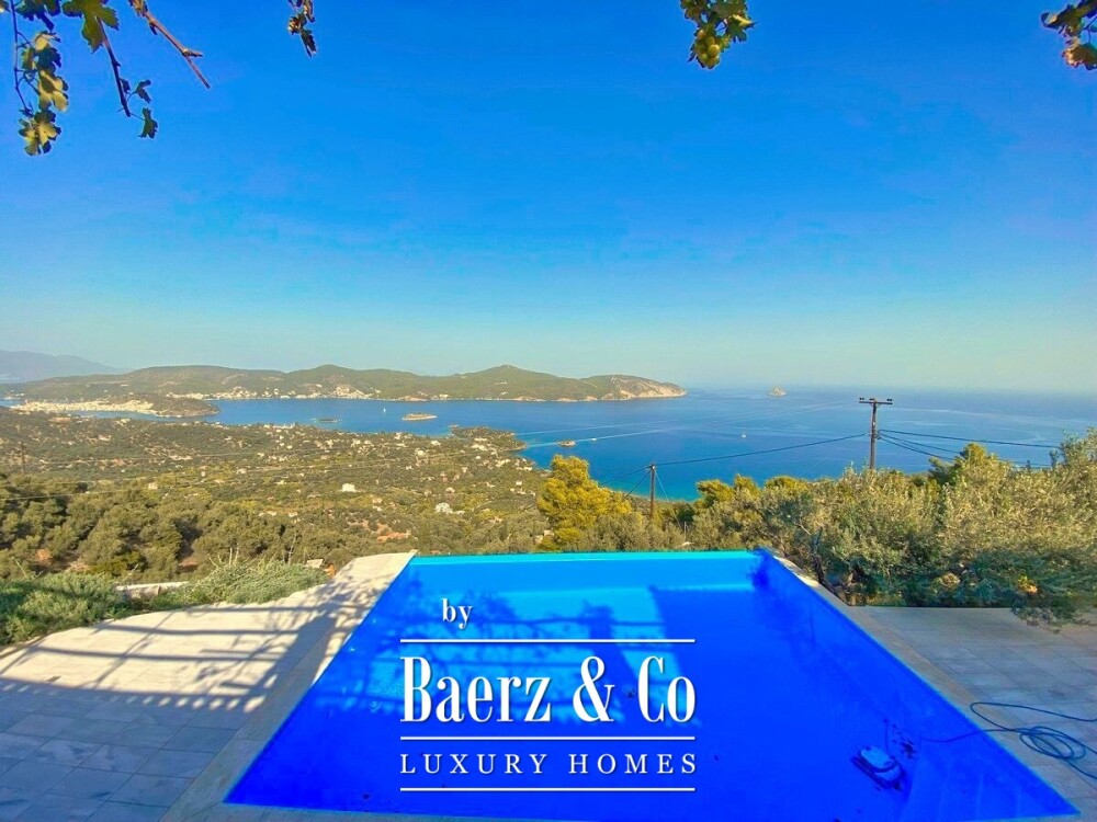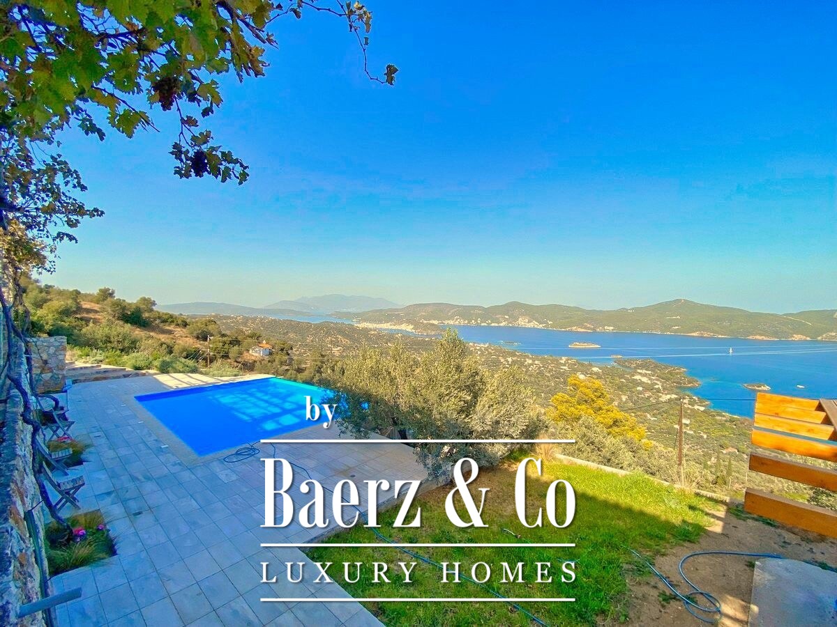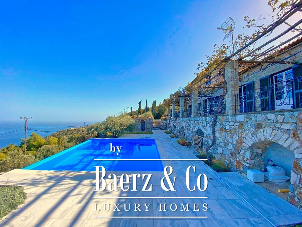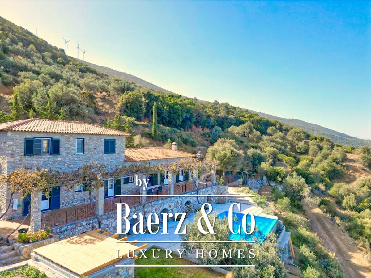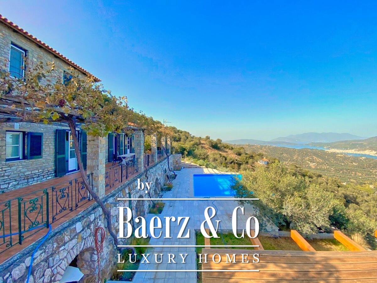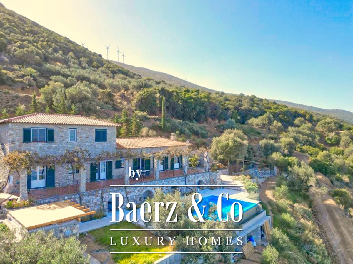 De stenen villa Galatas bevindt zich op een rustige heuvel en biedt panoramisch uitzicht over zee, waar traditionele Griekse architectuur samenkomt met subtiel modern comfort. De riante en lichte kamers in het 180 m² tellende interieur profiteren optimaal van het daglicht, met een centrale living die wordt gekenmerkt door een indrukwekkende stenen open haard. Elke ruimte, van de aparte keuken tot de drie slaapkamers en twee badkamers, is ontworpen met oog voor functionaliteit en ingetogen luxe.