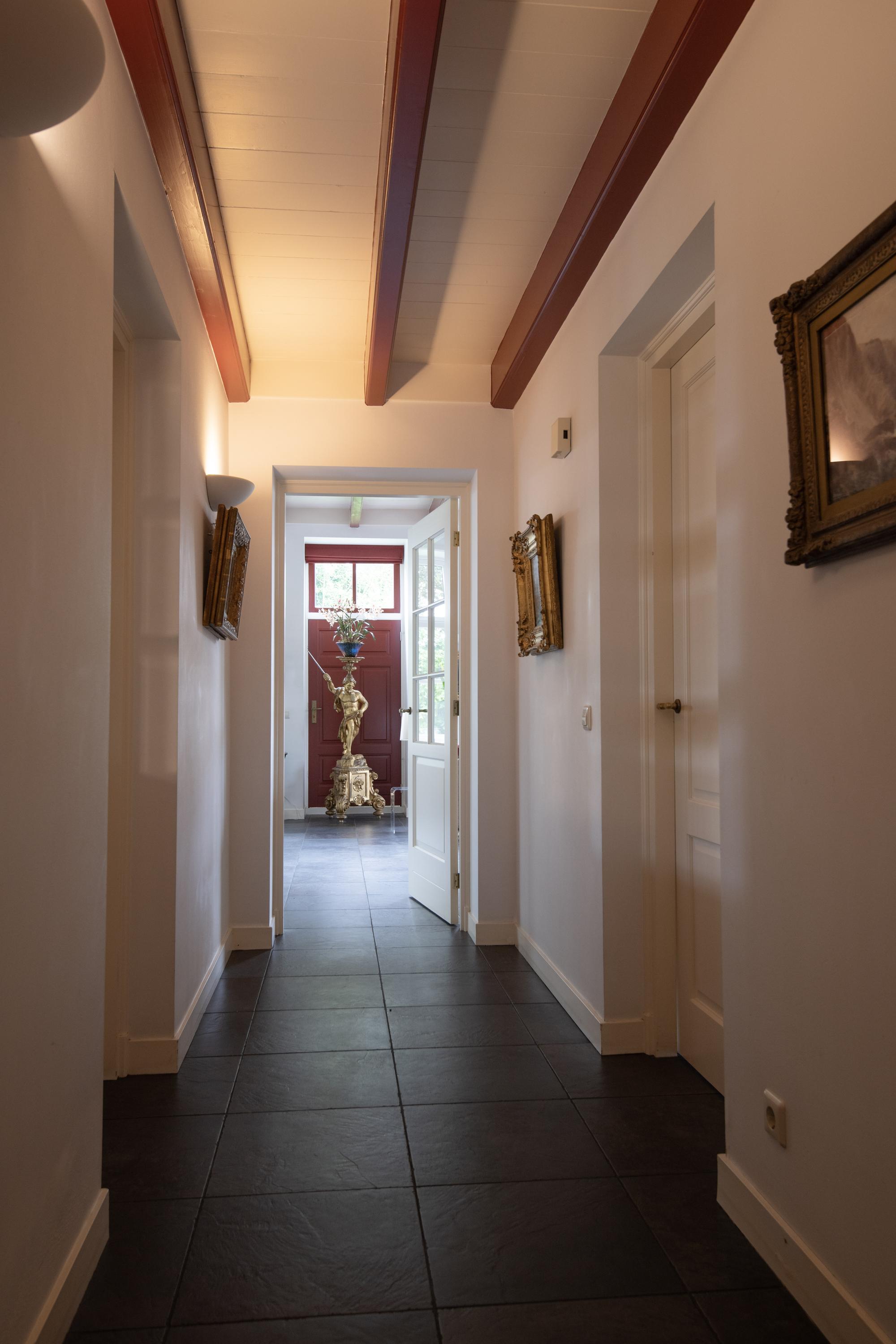 De oorspronkelijke voordeur bevindt zich centraal in het voorhuis maar deze wordt niet meer gebruikt. De dagelijkse entree is aan de opritzijde. De entree is ruim en ingericht met vaste kasten en een wc. Vanuit de aangrenzende gang is toegang tot de woonkamer. Deze zonnige ruimte met vele roederamen, geflankeerd door binnenluiken, ademt -met het bijna drie meter hoge balkenplafond- een aangename sfeer. Naast de luxe keramische vloer met vloerverwarming is er een natuurstenen schouw met een open gashaard. In de woonkamer zijn twee doorgangen die zicht bieden op de aangrenzende eetkeuken. Deze ruimte biedt via dubbele openslaande deuren toegang tot het terras op het zuiden. Drie volwassen Platanen fungeren er in de zomer als natuurlijke parasol.