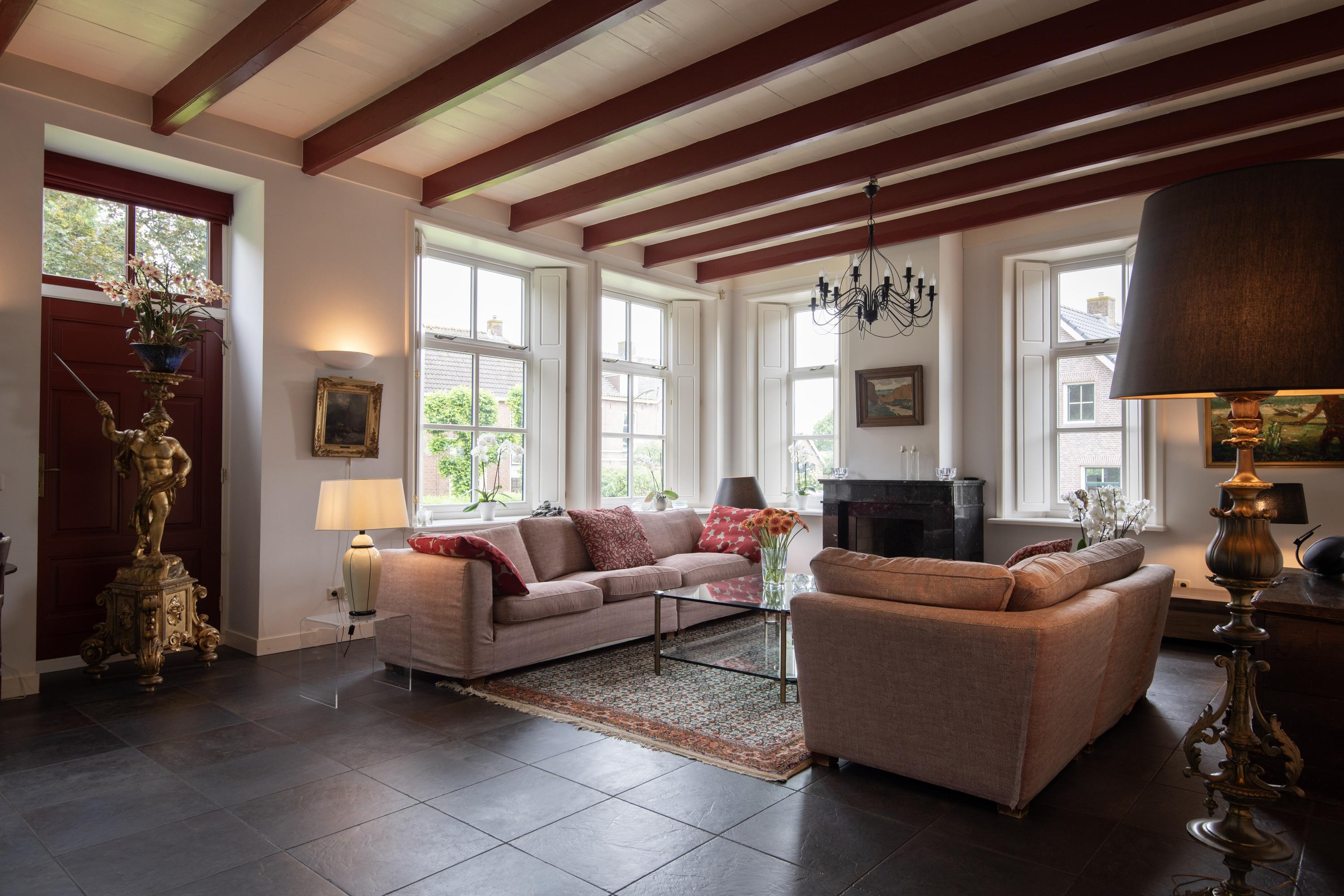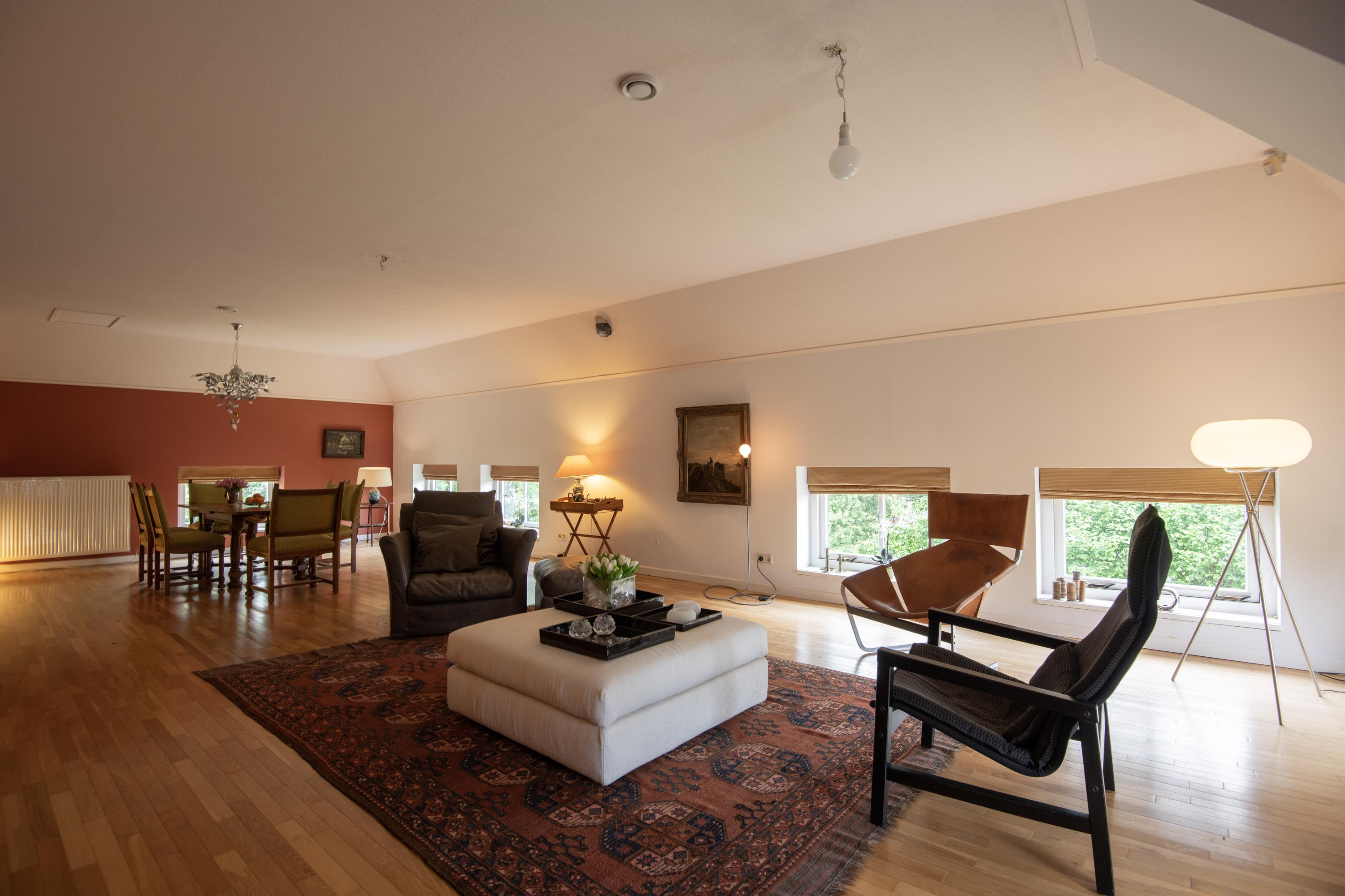 Een 2e woonkamer annex atelierruimte, bibliotheekkamer en een slaapkamer met aangrenzende 3e badkamer in het voorhuis en twee slaapkamers in het achterhuis op de eerste verdieping.