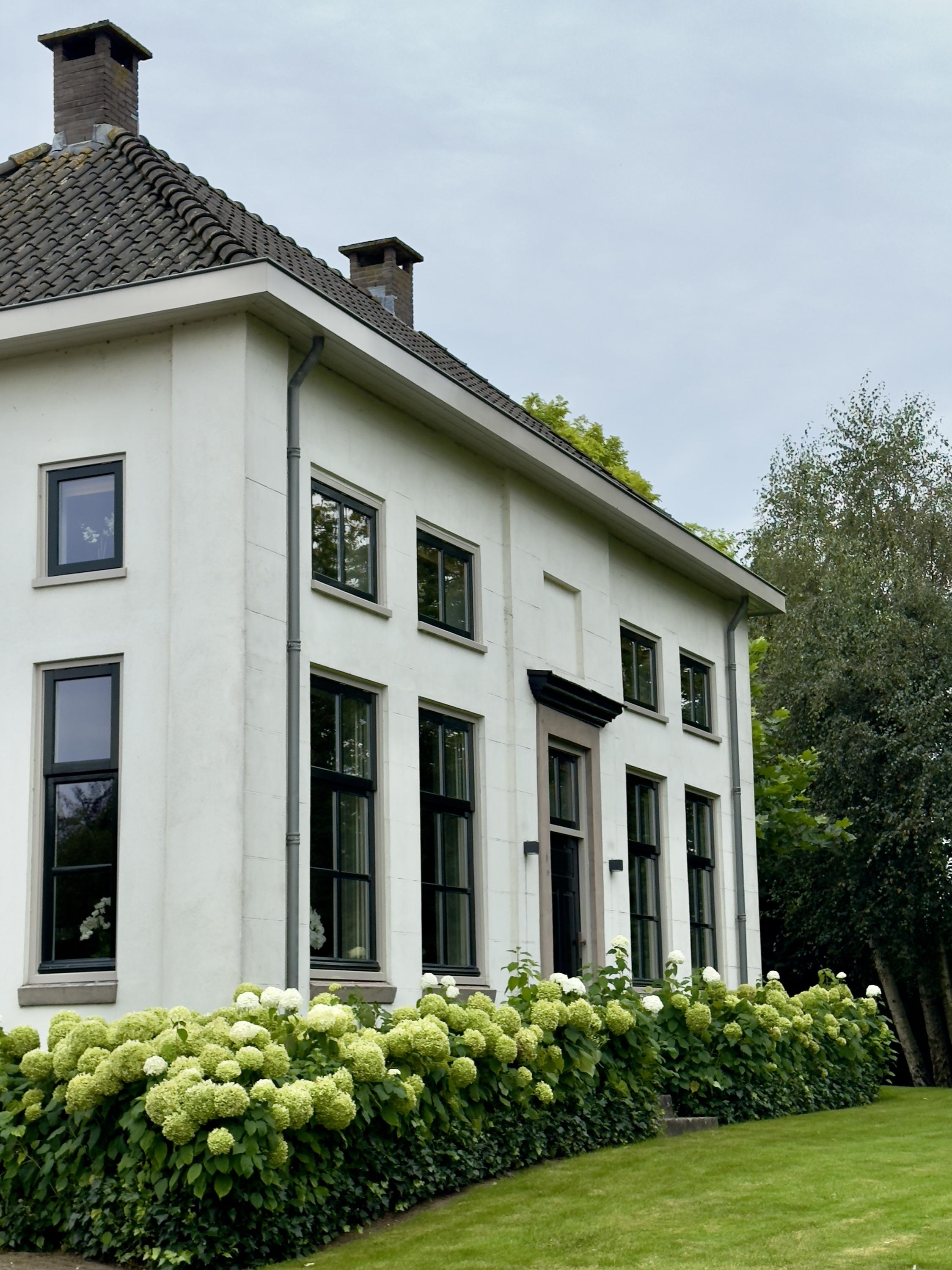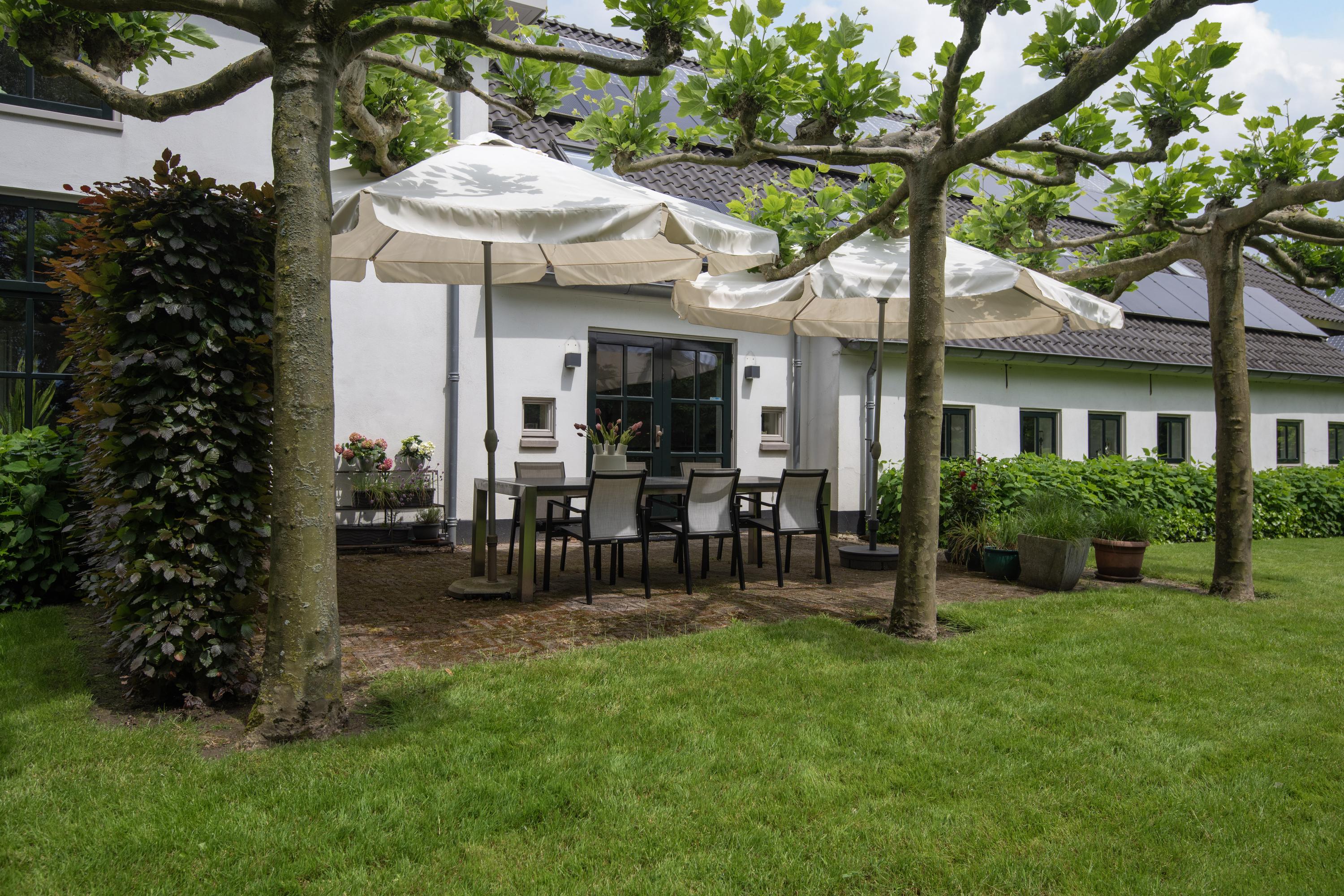 De onderhoudsvriendelijke tuin is ingericht met grote terrassen op het zuiden en oosten, een groot gazon met volwassen (fruit)bomen, hagen en bloeiende bodembedekkers. Langs de boerderij zijn grote borders met weelderig witbloeiende ‘Annabellen’.