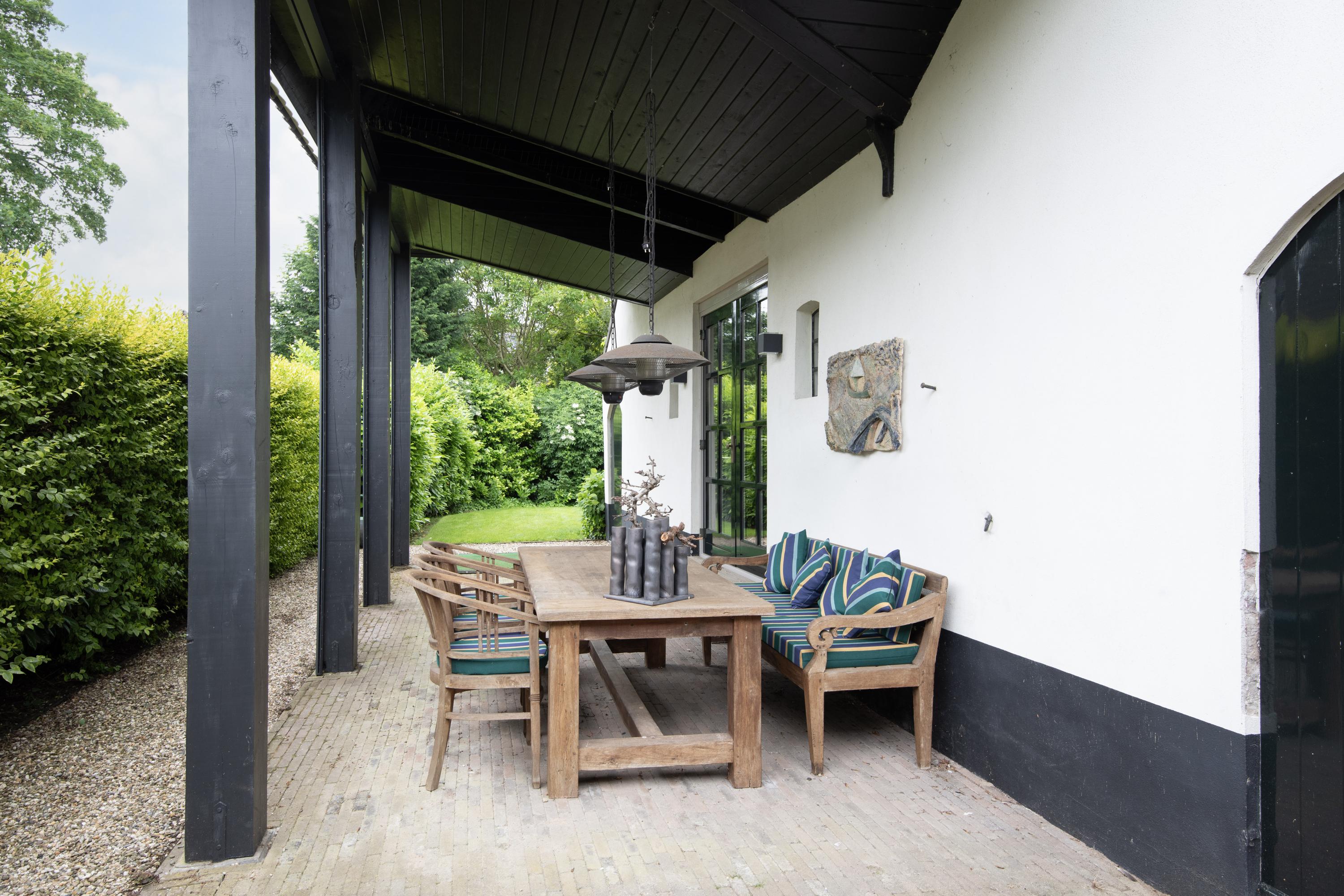 Aan een centrale gang die het achterhuis in tweeën deelt, zijn aan het einde twee openslaande deuren die uitkomen onder de Gelderse overstek. Het beschut gelegen terras is de favoriete plek om de dag in de ochtendzon te starten.
