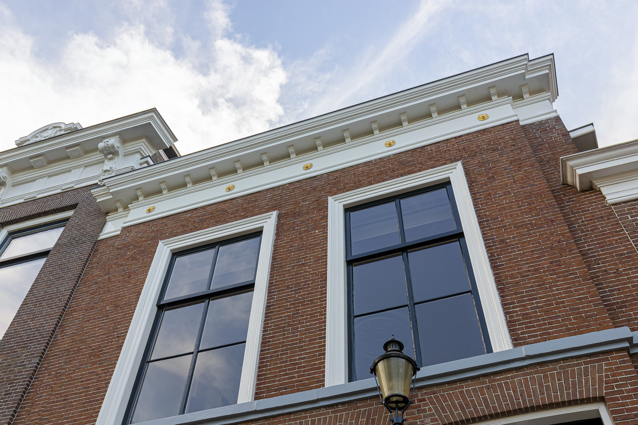 Op de eerste verdieping bevindt zich de imposante woonkamer met kamerhoge ramen, originele schuifmechanieken en een weids uitzicht over de haven, het raadhuis en de Leeuwenbrug. Een schouwspel dat door de getijden van eb en vloed voortdurend verandert, met als levendig decor de passanten met hun plezier- en zeiljachten. Aan de achterzijde liggen de eetkamer en de authentieke keuken, voorzien van fraaie Friese witjes en granieten werkbladen.