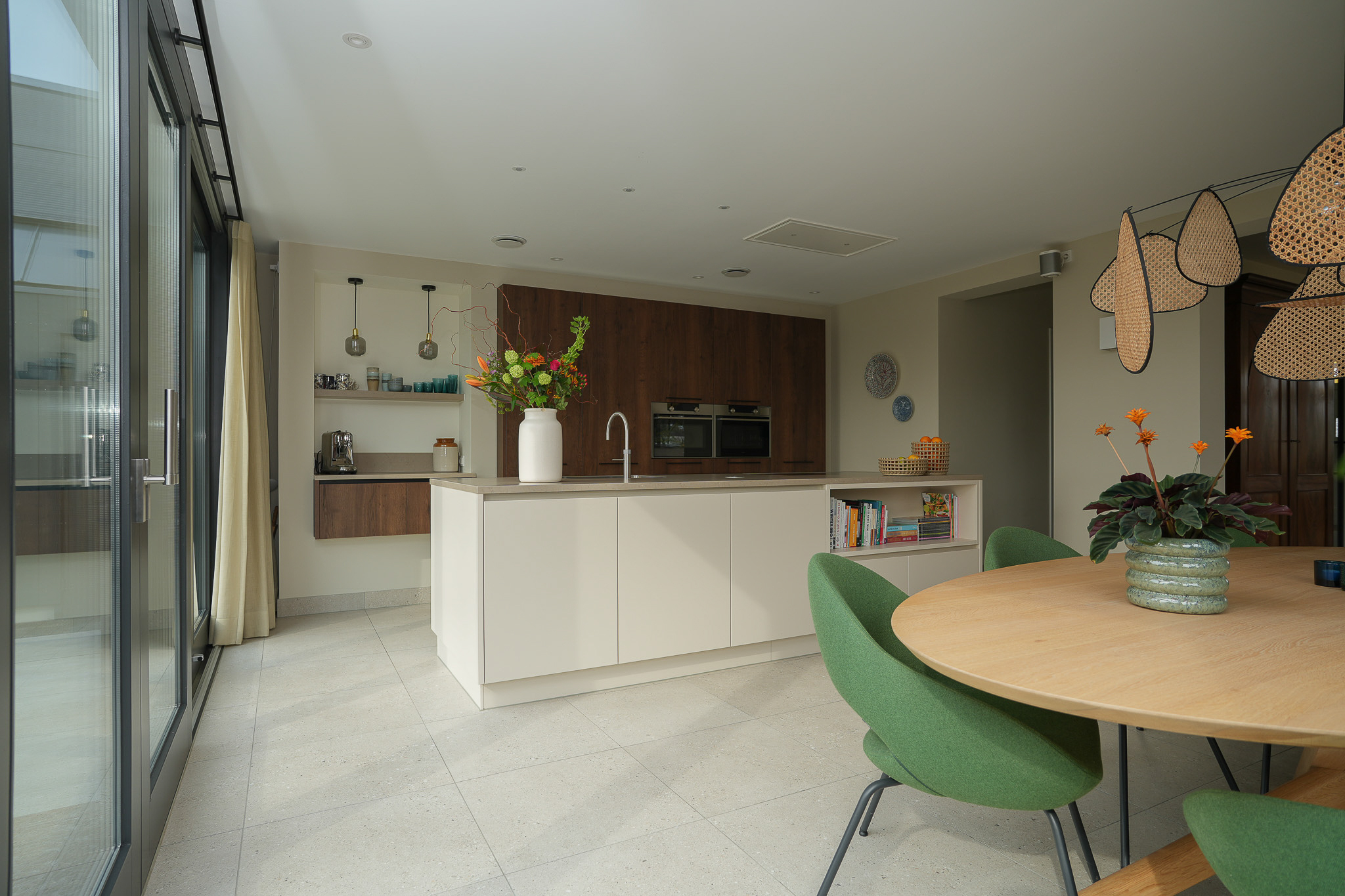 De begane grond voelt als één geheel, waarin de verschillende leefruimtes op een vanzelfsprekende manier in elkaar overlopen — een plek waar het dagelijks leven zich moeiteloos afspeelt, met aandacht voor detail en gevoel voor verhoudingen.