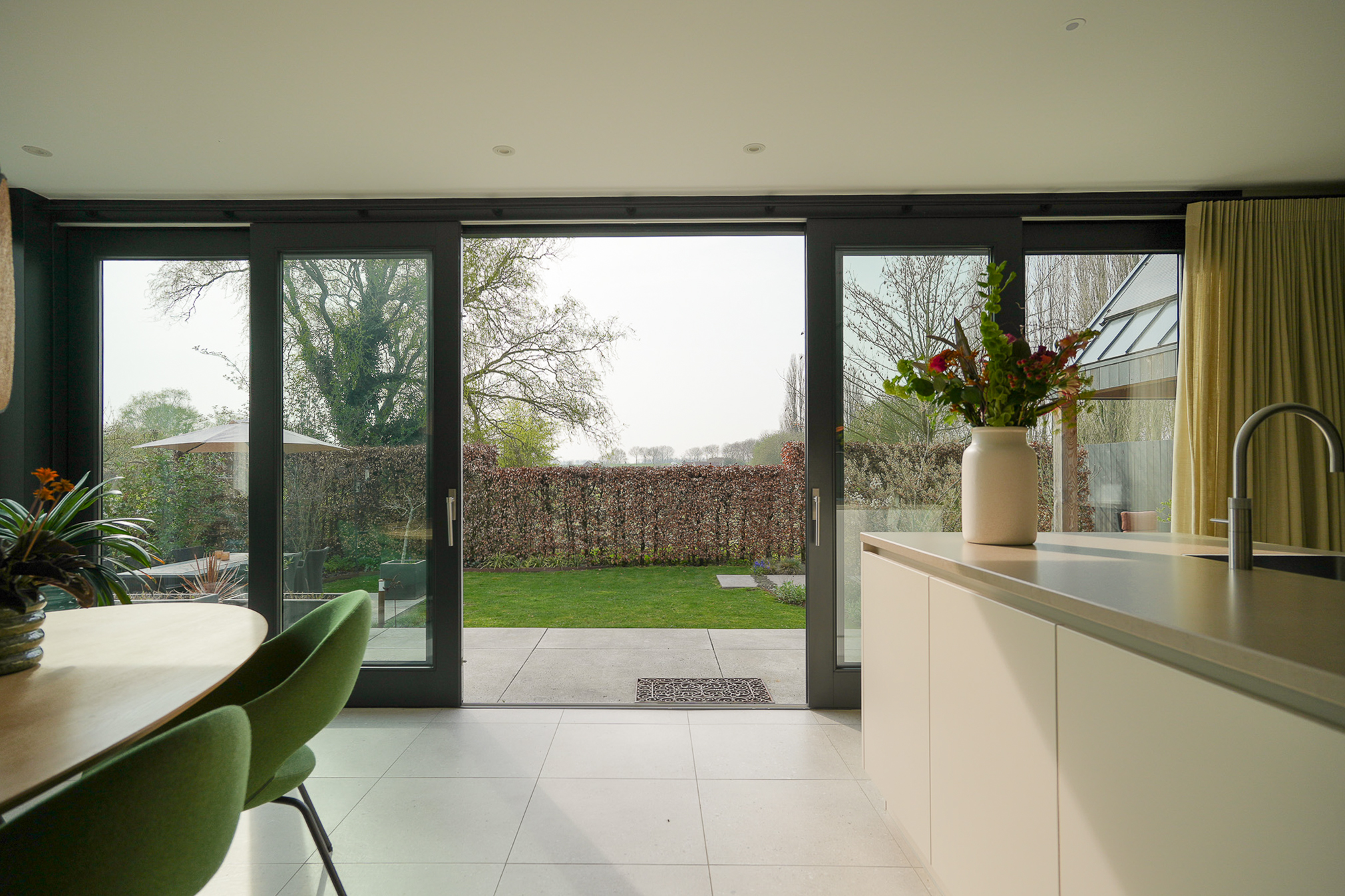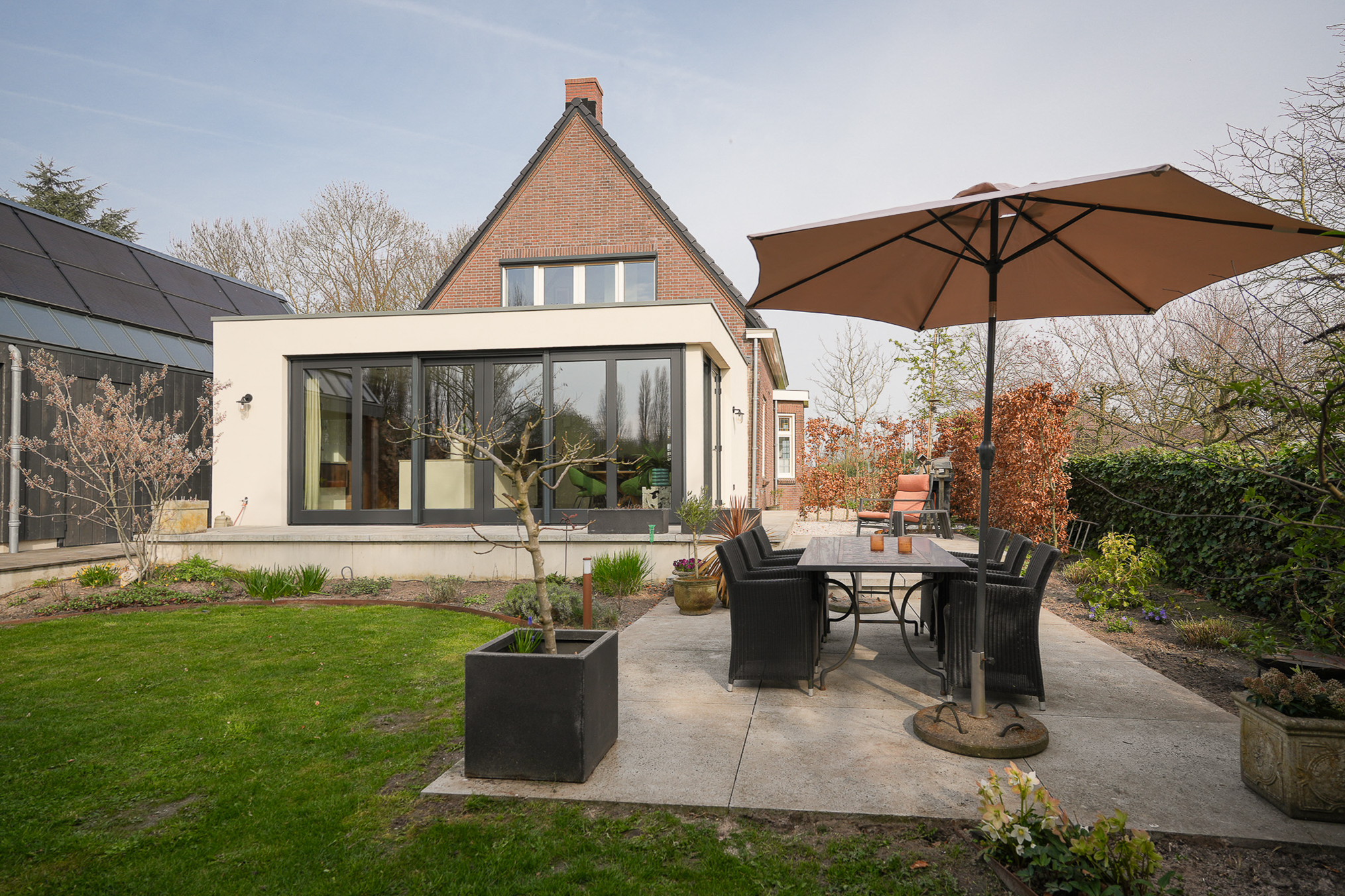 Aan de achterzijde is over de volle breedte een moderne aanbouw gerealiseerd, waardoor een royale woonkeuken is ontstaan waarin de binnen-buitenbeleving centraal staat. De grote schuifpui zorgt voor een directe verbinding met de onder architectuur aangelegde tuin.