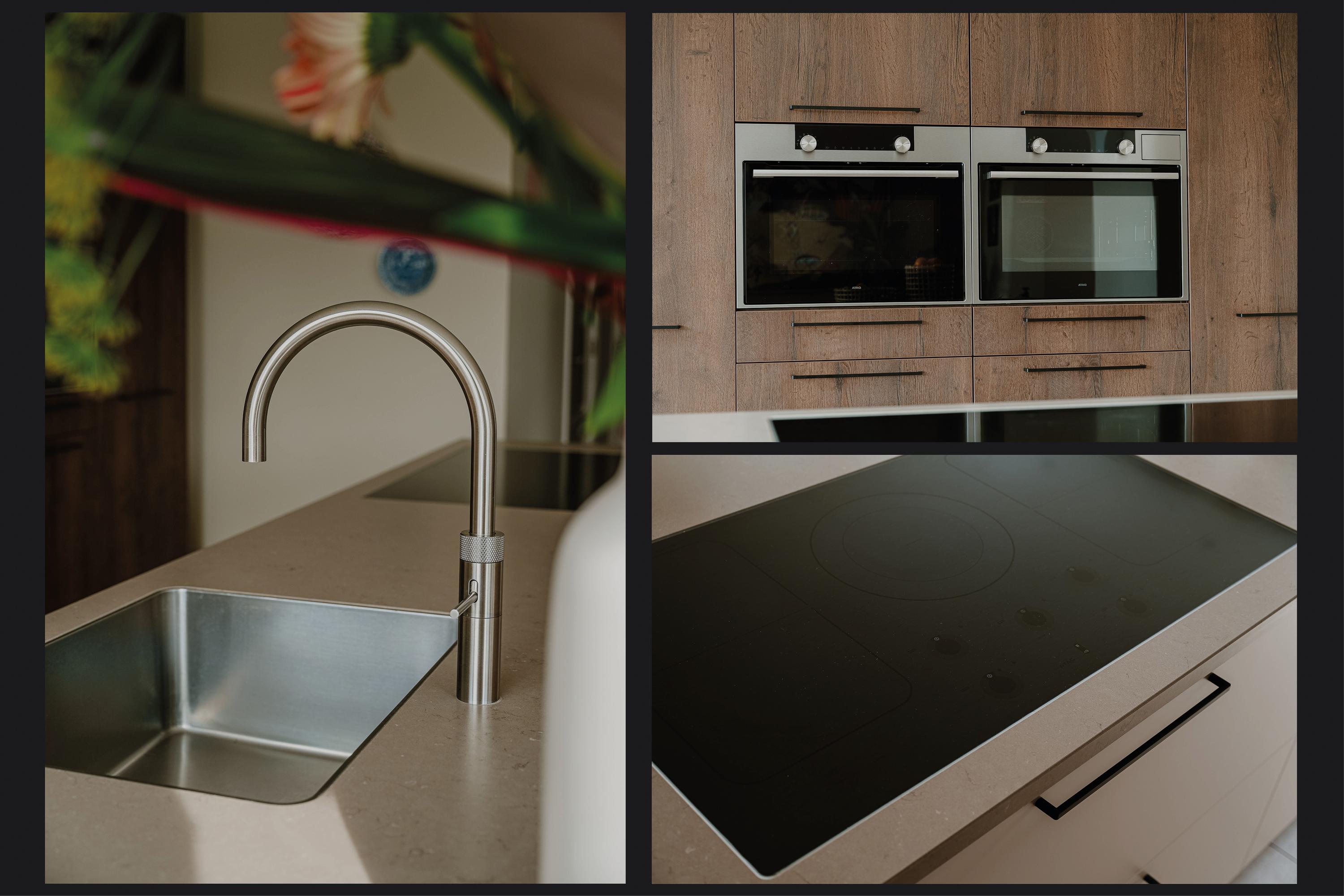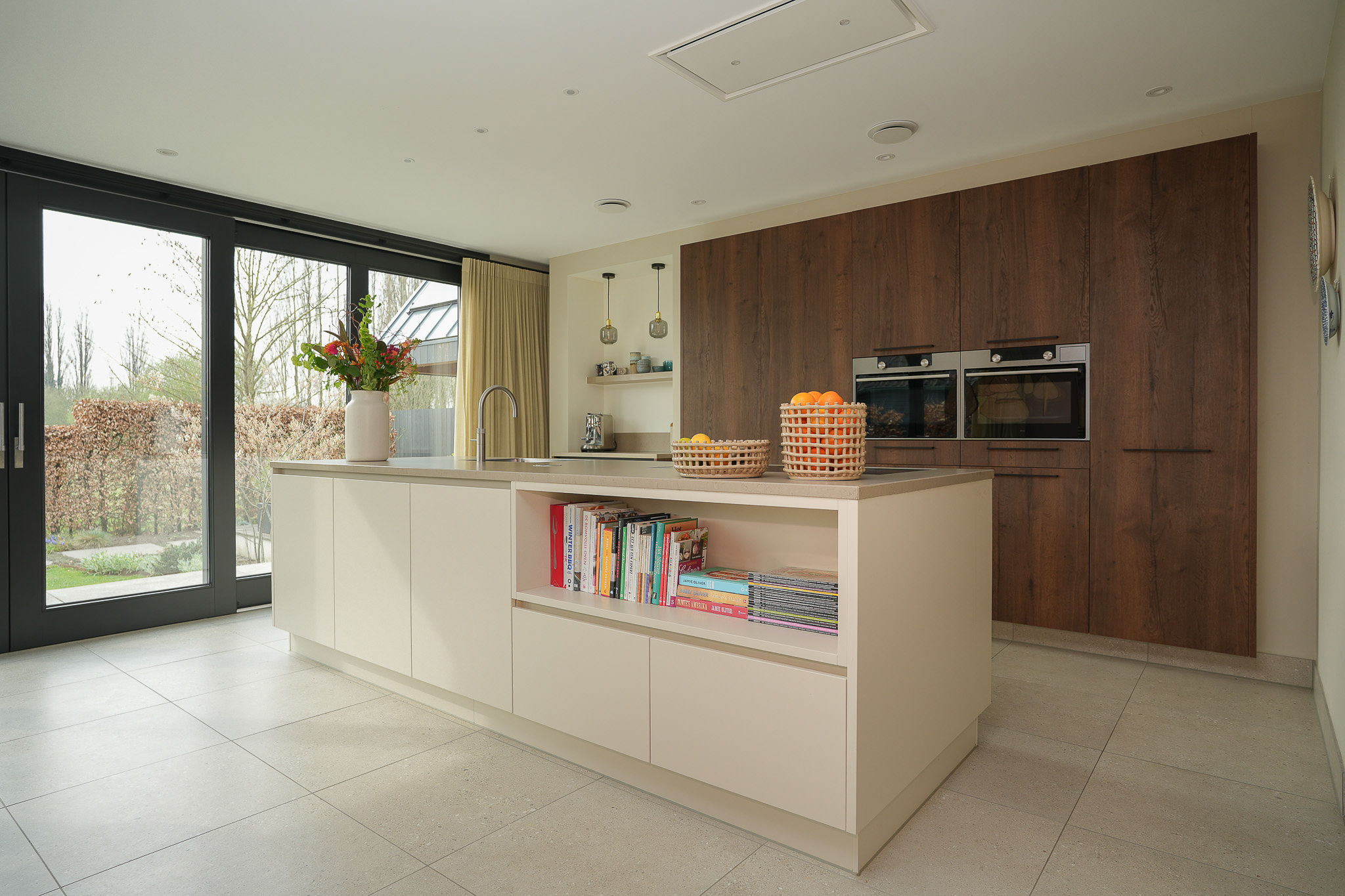 Het kastmeubel valt deels weg in de wand en is voorzien van hoogwaardige inbouwapparatuur, waardoor rust en eenheid in het geheel ontstaan. De aanwezige koffiecorner vormt een prettig en doordacht detail. Er is volop werk- en bergruimte, met daarnaast alle ruimte voor een royale eettafel.
