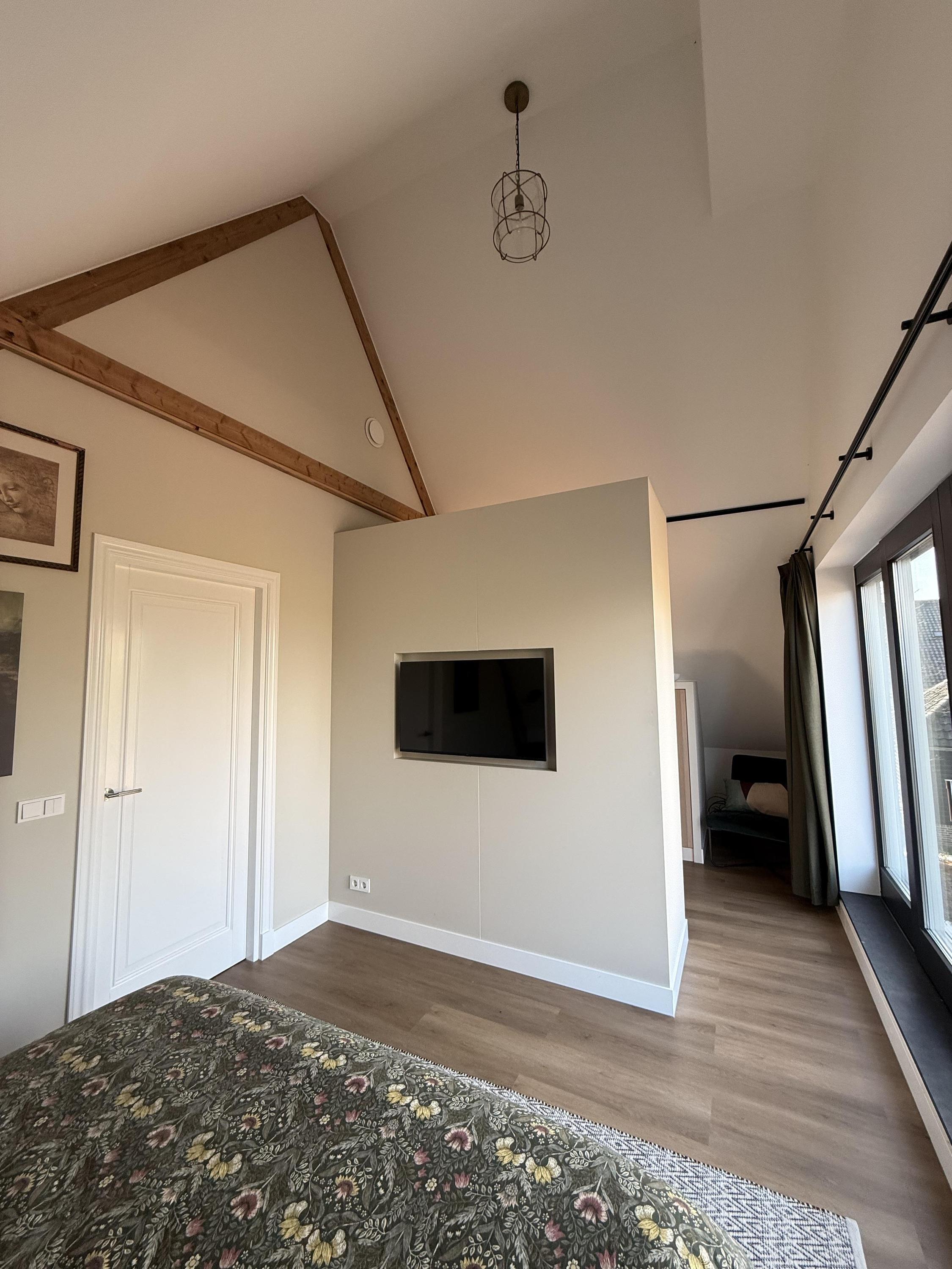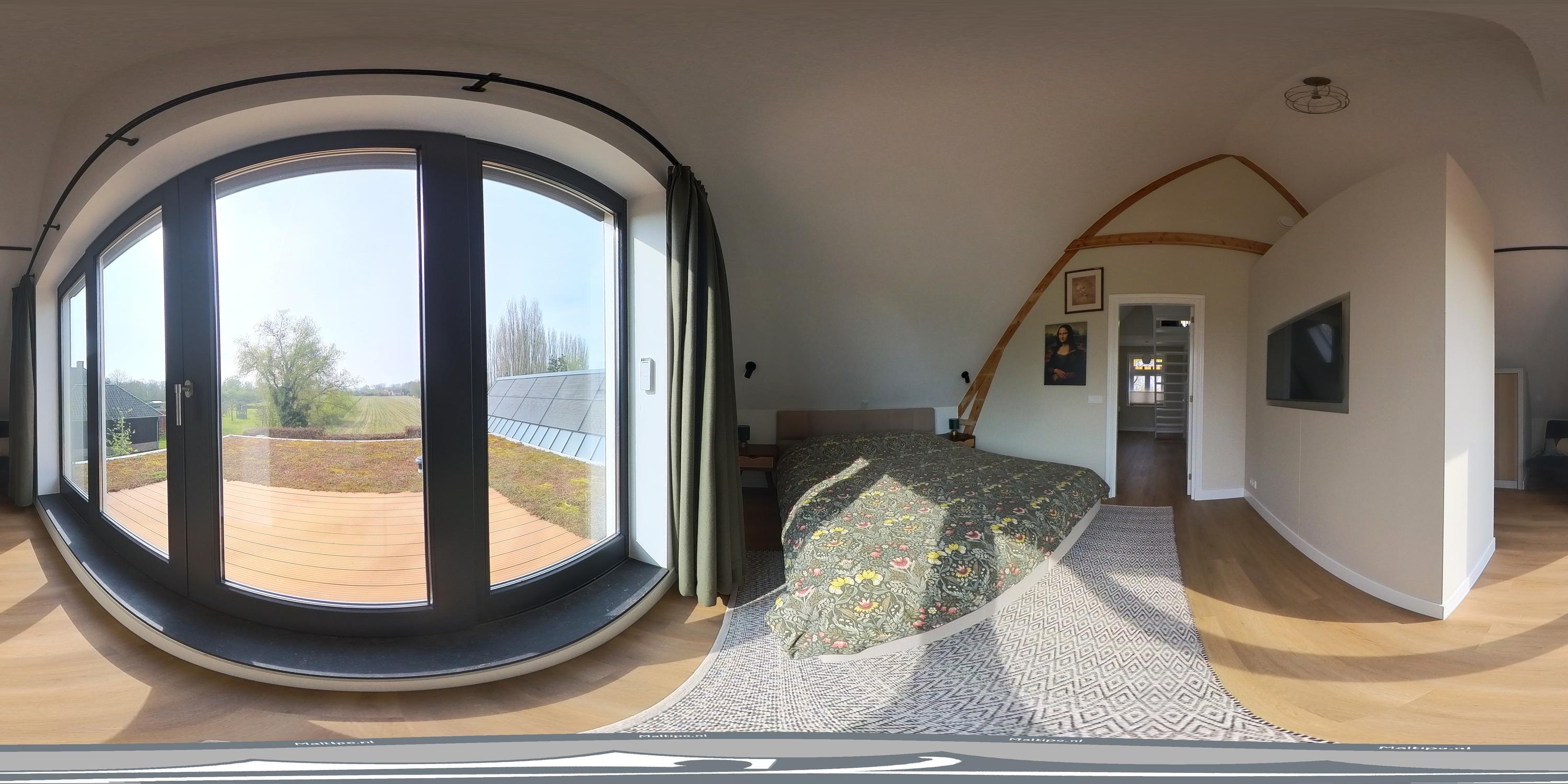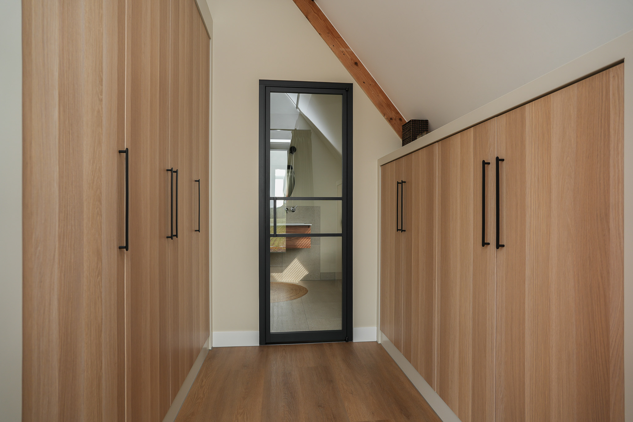 Aan de achterzijde ligt de hoofdslaapkamer, een rustige en lichte ruimte met vrij uitzicht over de achterliggende landerijen en de dijk. Aangrenzend bevindt zich de walk-in closet, uitgevoerd met maatwerkkasten. Vanuit hier geeft een zwarte stalen deur toegang tot de badkamer. Bovendien is er vanuit de slaapkamer toegang tot het met sedum belegde platte dak van de woonkeuken, waar een terras is gerealiseerd: een beschutte plek met vrij uitzicht over het groen.