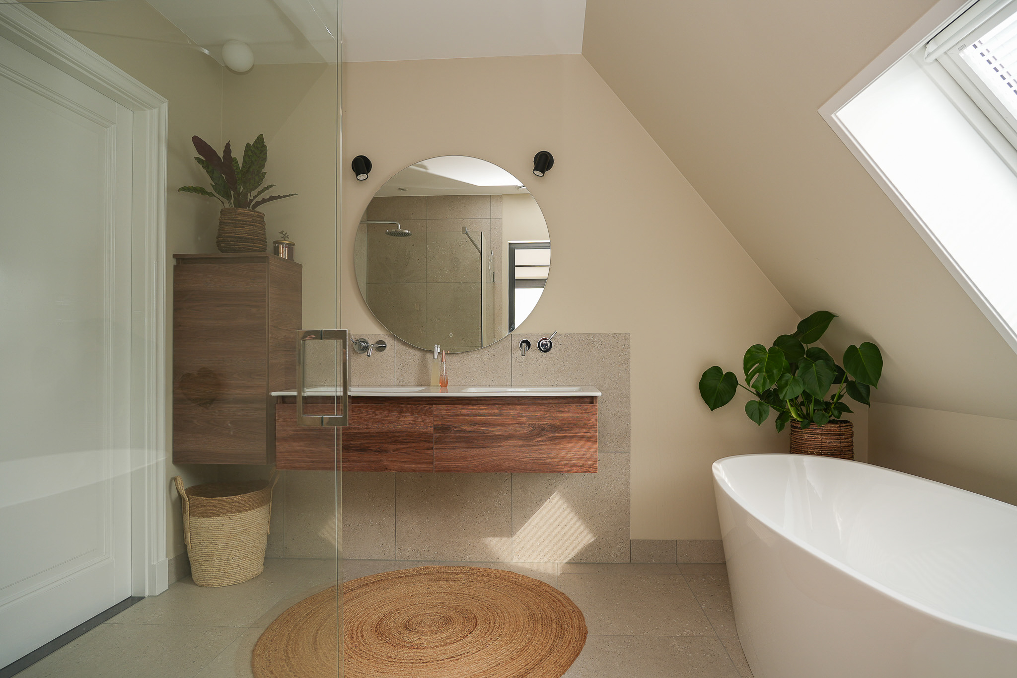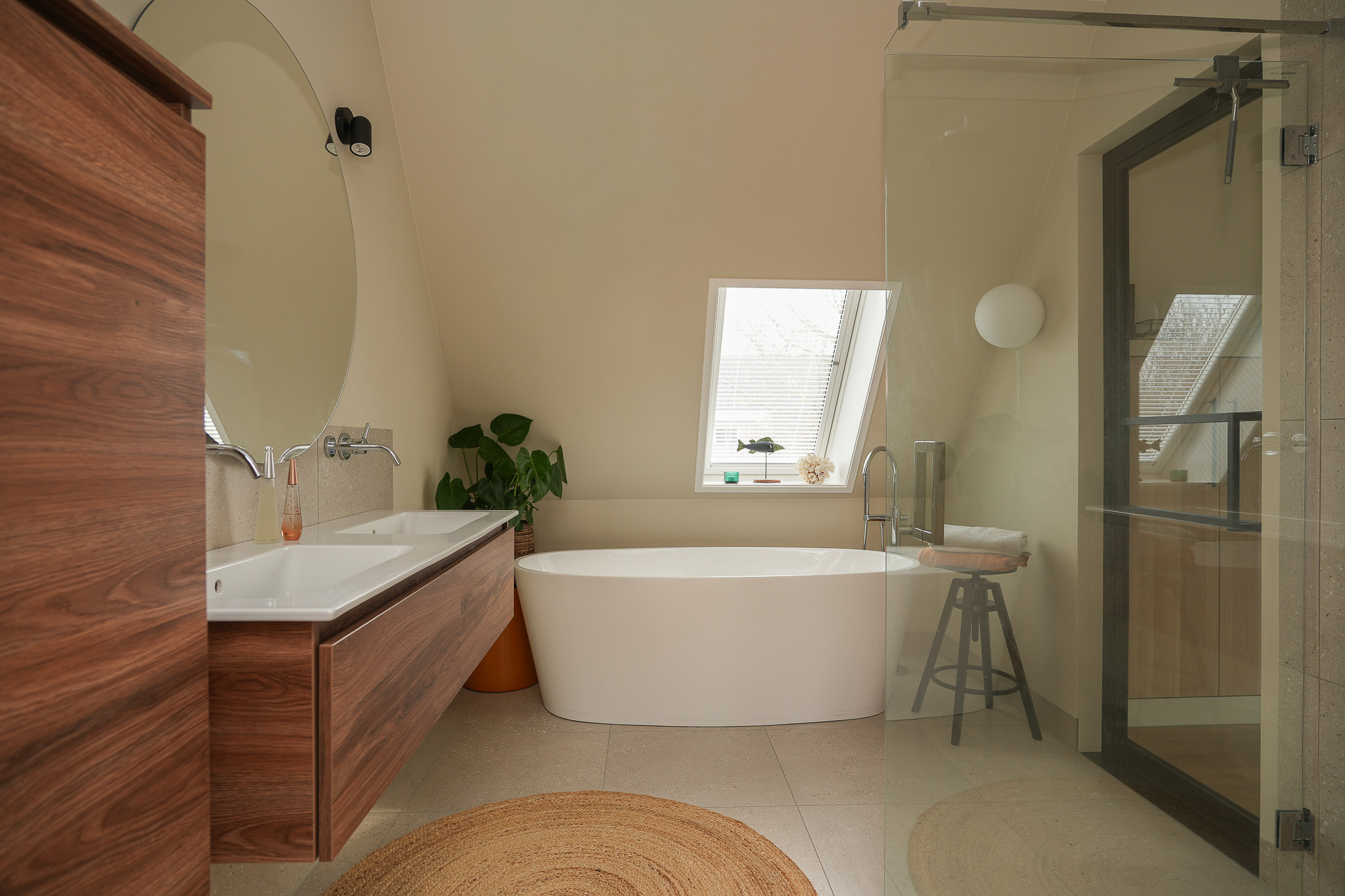De badkamer is eveneens bereikbaar vanaf de overloop en ingericht in een tijdloze stijl met grote wand- en vloertegels en verfijnd sanitair. Hier bevinden zich een vrijstaand ligbad, een inloopdouche met regendouche en een dubbel wastafelmeubel.