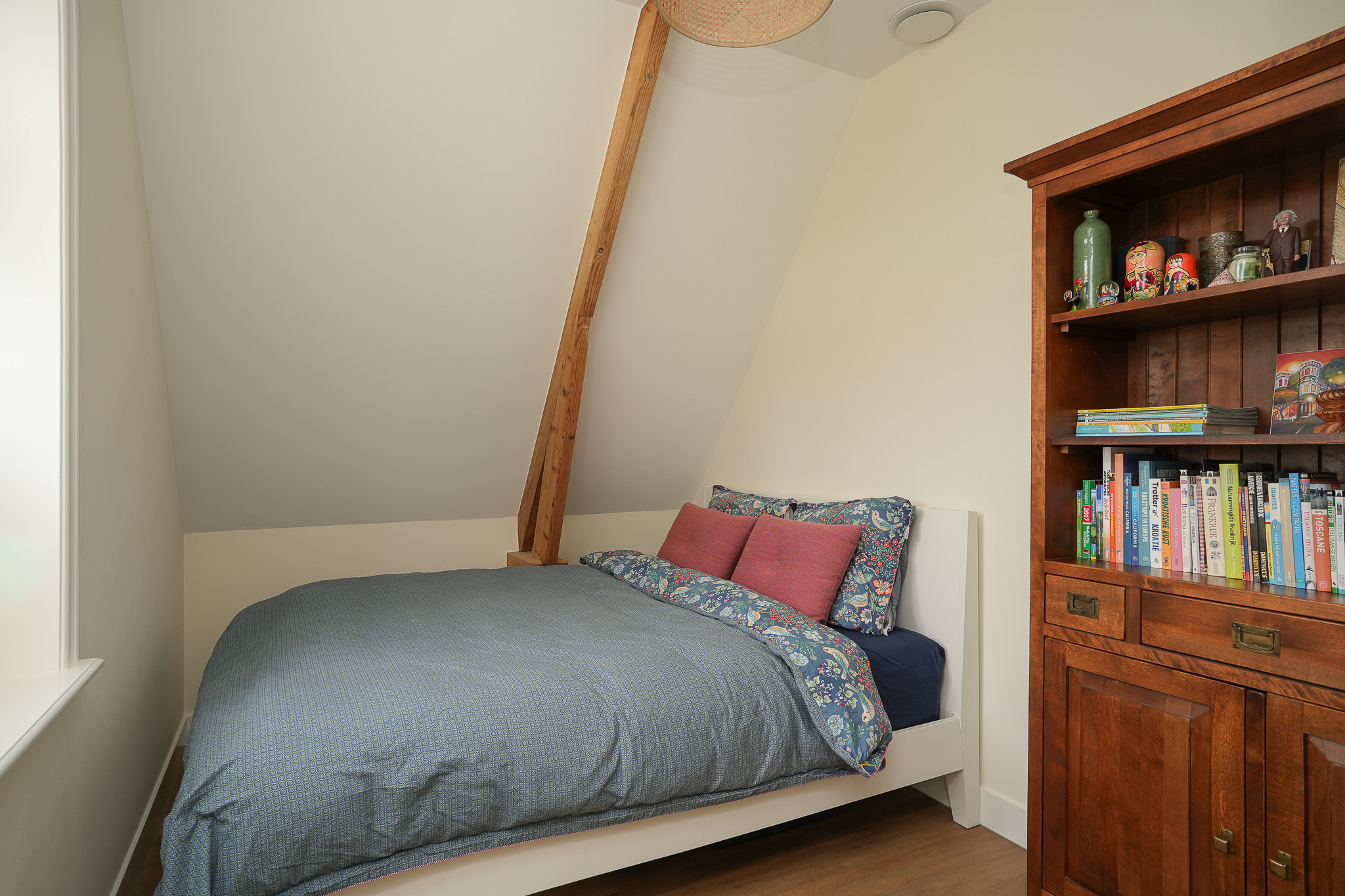 De overloop is aangenaam licht door de dakvensters in de geïsoleerde kap en biedt ruimte voor een werkplek. De open vide versterkt het gevoel van hoogte en verbinding binnen de woning.