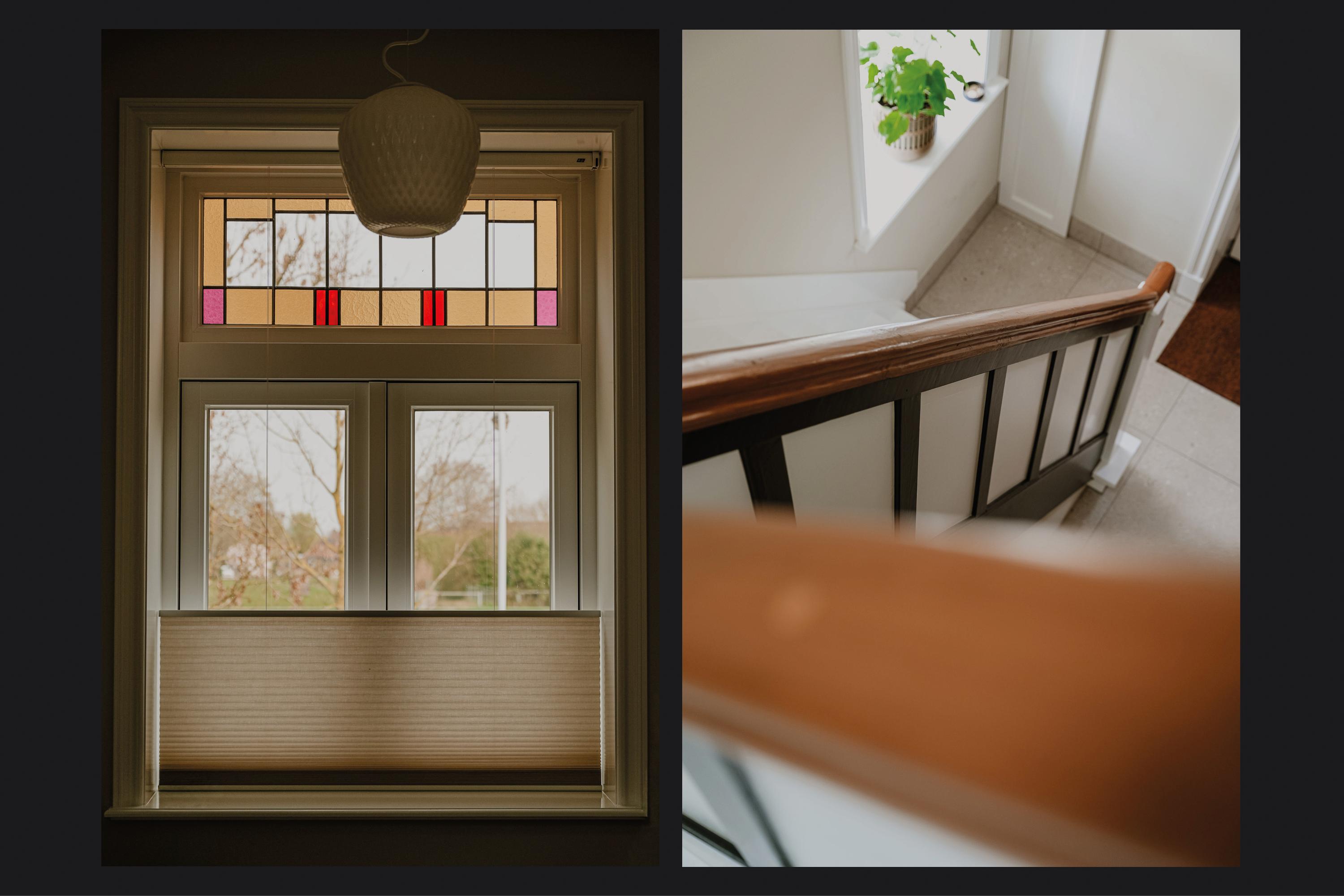 De originele trap leidt naar de eerste verdieping, waar direct de ruimtelijkheid opvalt.