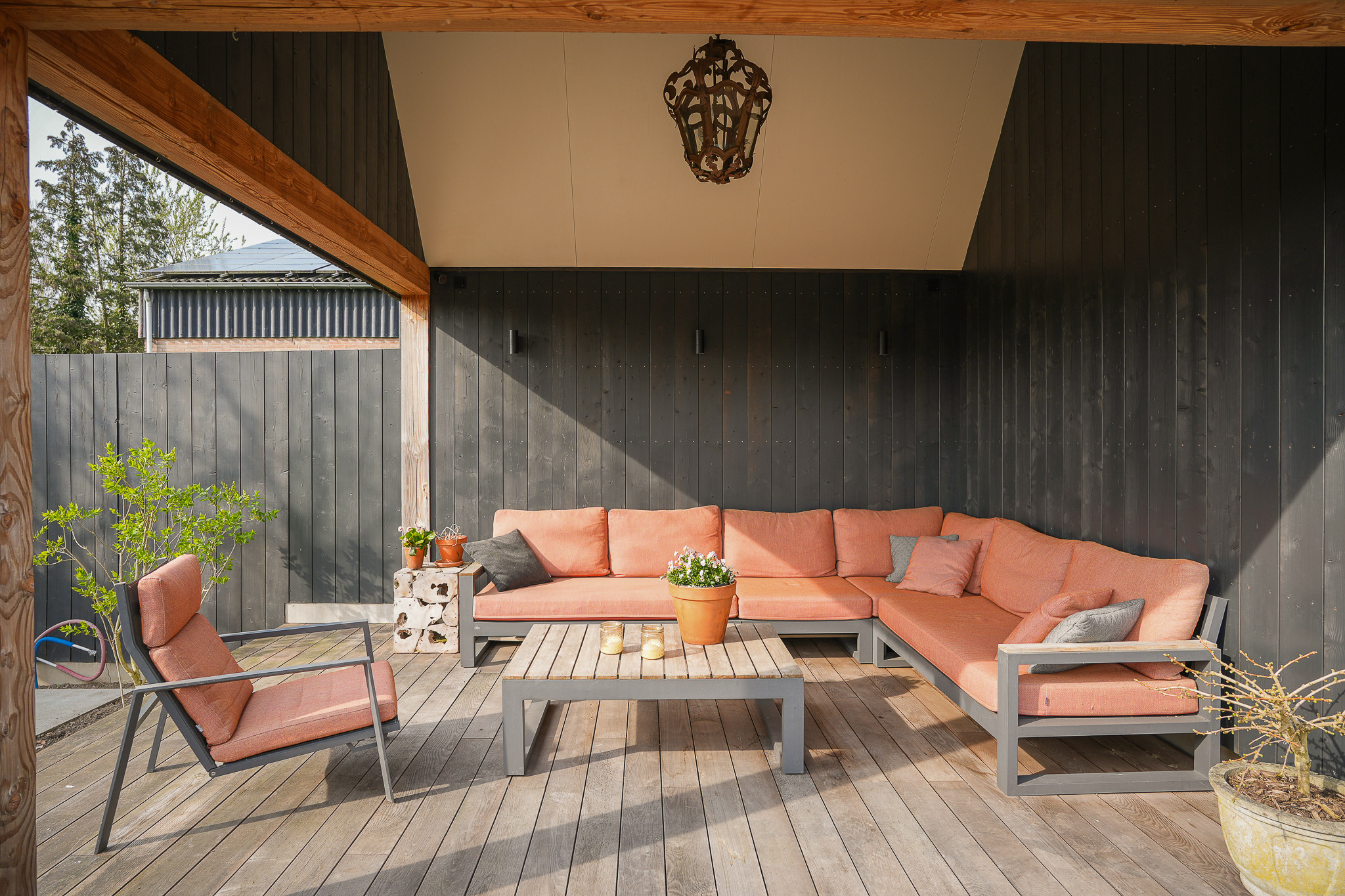 Naast de woning bevindt zich het bijgebouw, dat zich in de lengterichting uitstrekt langs de tuin en daarmee op natuurlijke wijze onderdeel vormt van het geheel. Aan de tuinzijde grenst een veranda, waar momenteel een comfortabele loungehoek is gecreëerd.