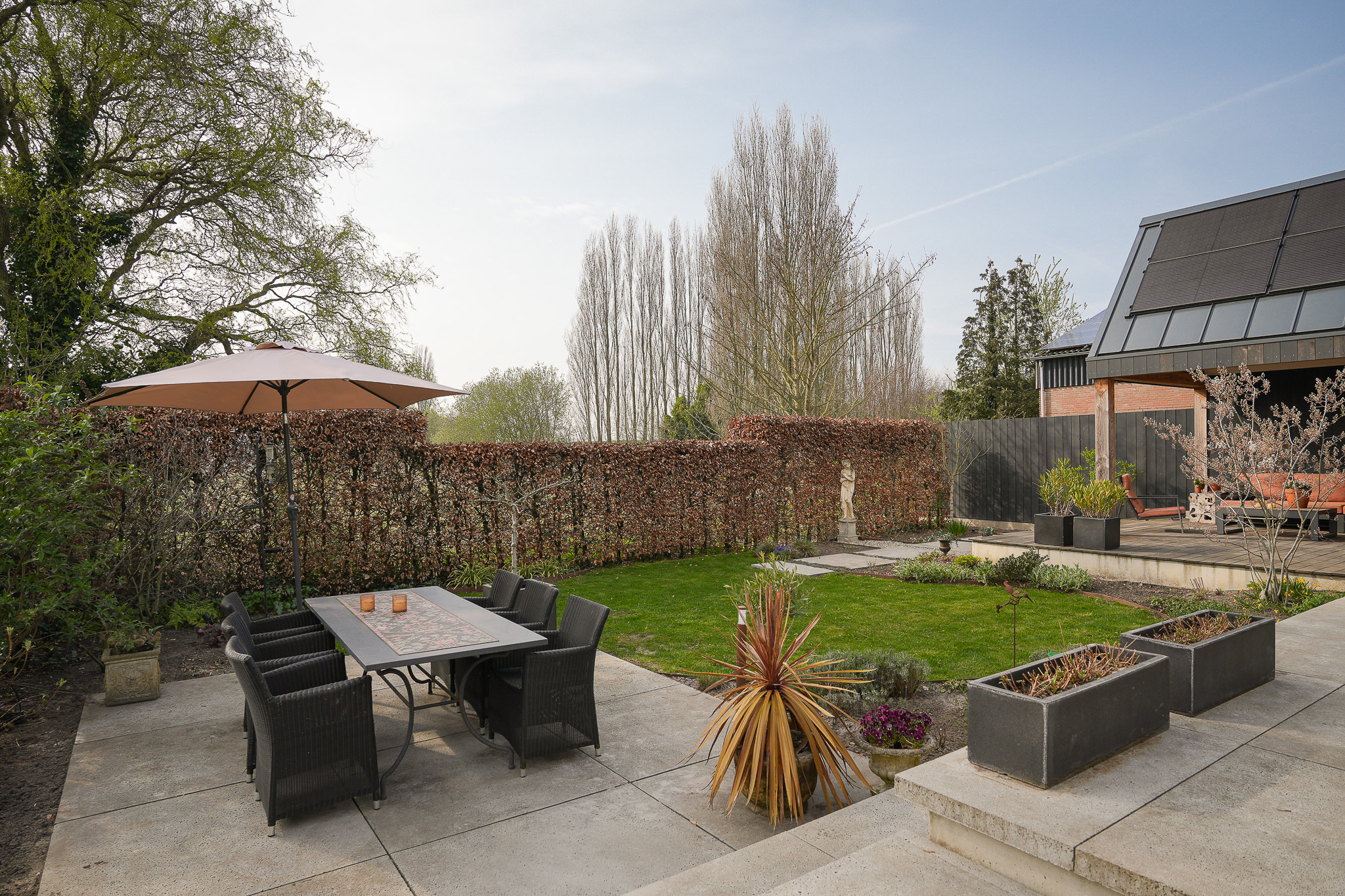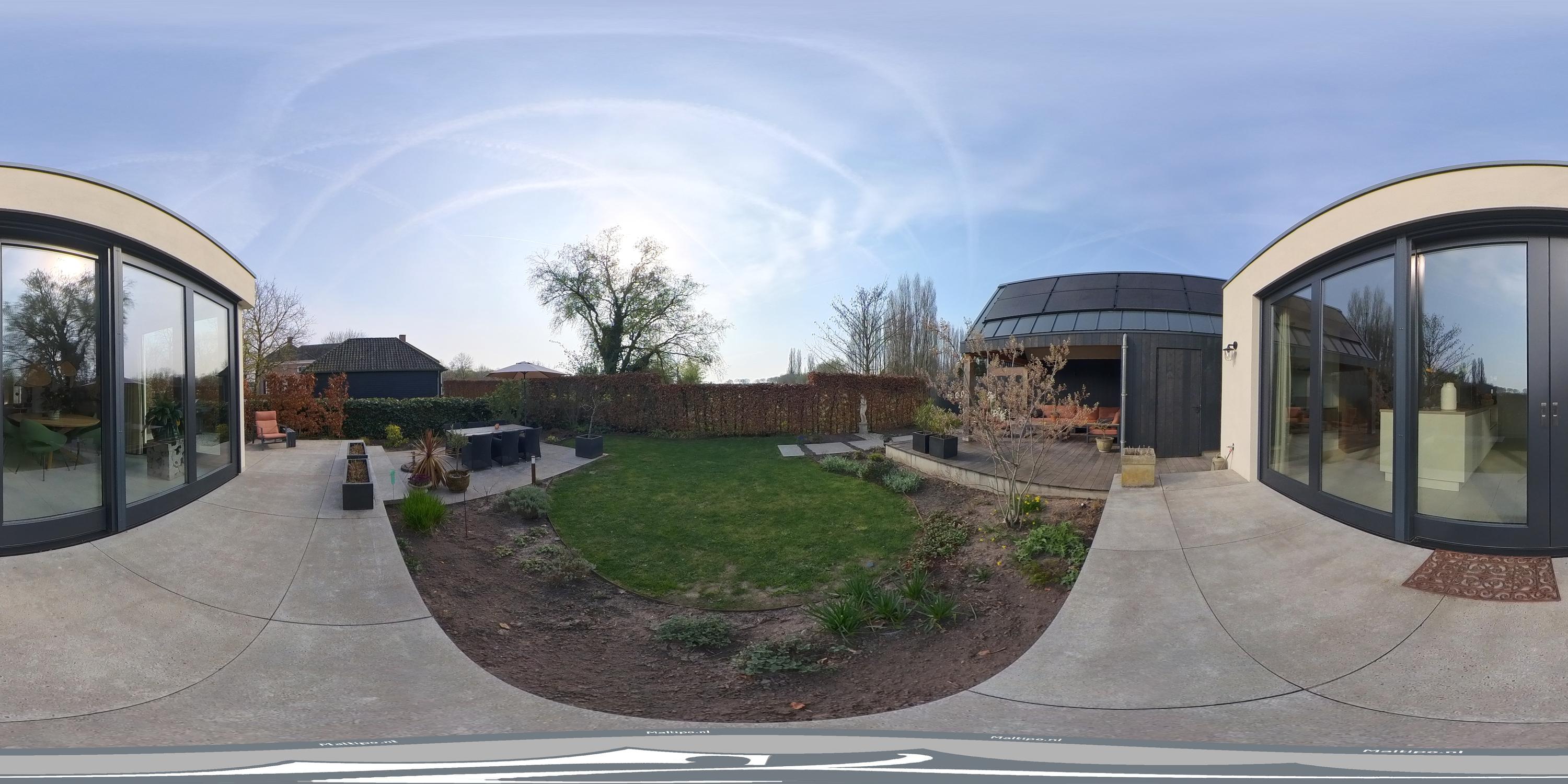 De onder architectuur aangelegde tuin ligt op het zuidwesten, met zon van de vroege ochtend tot in de avonduren. De tuin is met zorg vormgegeven, met meerdere terrassen, groenborders en een prettige afwisseling tussen openheid en beschutting. Direct aan de woning bevindt zich een zonnig terras, terwijl verderop in de tuin verschillende plekken zijn gecreëerd om op elk moment van de dag van zon of schaduw te genieten.