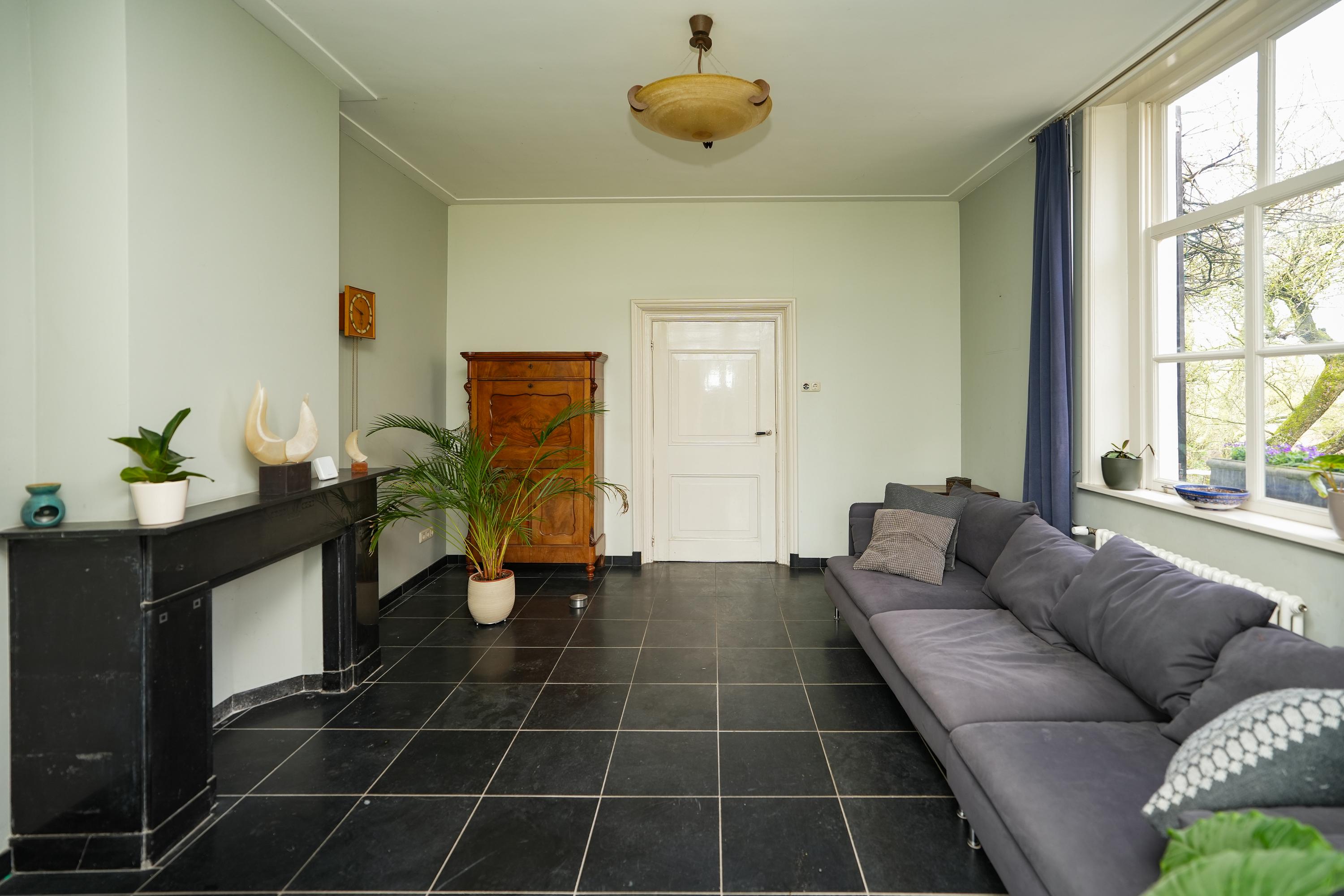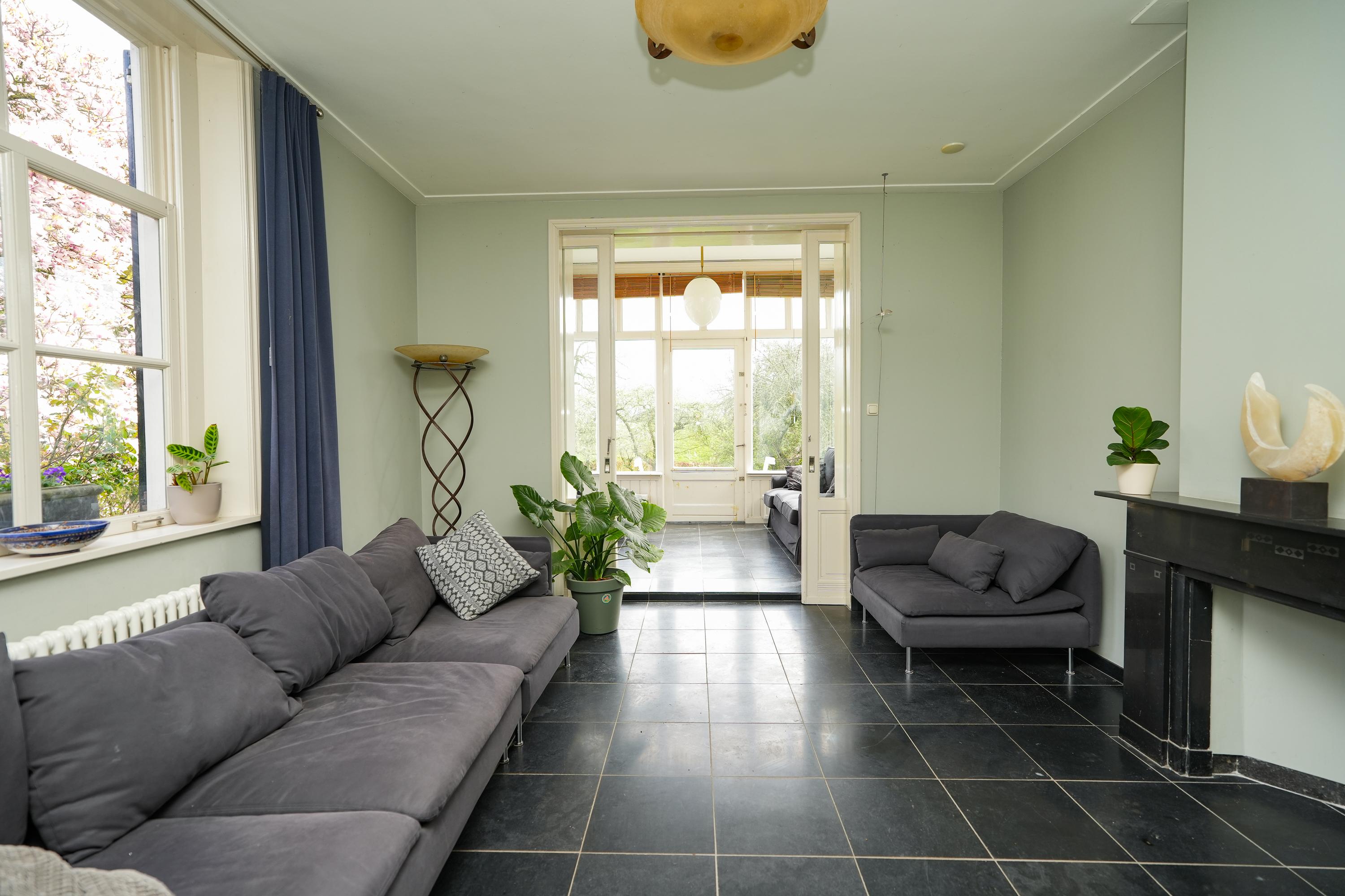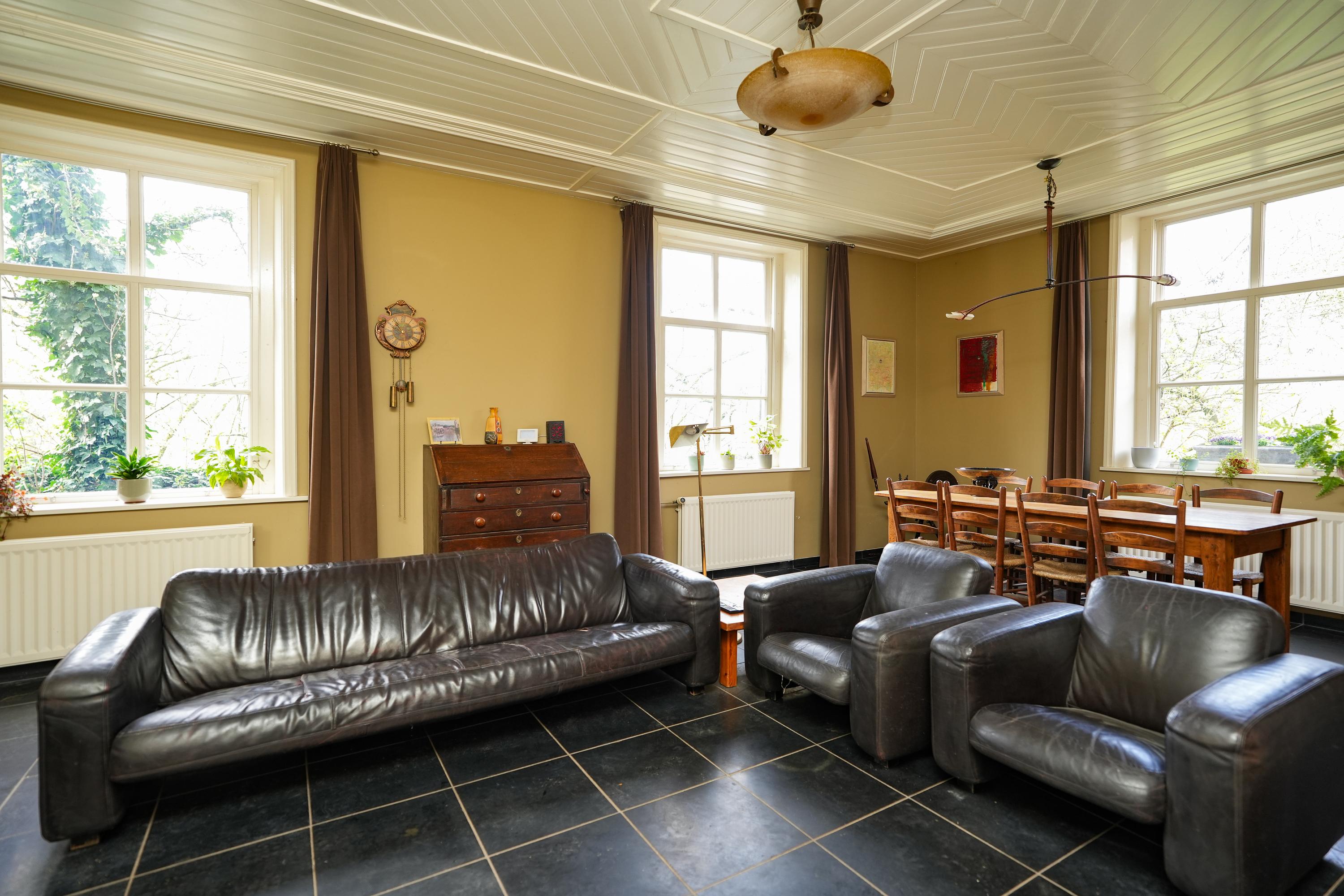 Entree, toegang tot de hal, twee woonkamers, twee werkkamers en een keuken/bijkeuken. Vrijwel de gehele begane grond is voorzien van een natuurstenen vloer met vloerverwarming. Aan de voorzijde van de woning bevinden zich twee woonkamers. De kleinere woonkamer grenst aan de serre en staat hiermee in directe verbinding via schuifdeuren. De serre heeft een deur naar de boomgaard. De grotere woonkamer is via dubbele toegangsdeuren bereikbaar en biedt veel leefruimte. Beide woonkamers beschikken over een sfeervolle schouw. De hal geeft toegang tot een kleine werkkamer en een grotere werkkamer, twee separate toiletten (beide met fonteintje), een inbouwkast, en de keuken. De keuken is voorzien van een AGA met vier ovens. Er zijn twee praktische inbouwkasten en een grote voorraadkast met daarin de trap naar de kelder. Verder heeft de keuken openslaande deuren naar een prachtige terras dat aan de zijde van het natuurgebied om het huis heen loopt. Aansluitend bevindt zich de bijkeuken, in dezelfde stijl uitgerust. De bijkeuken beschikt over een trapje, naar de boomgaard. Aan de bijkeuken grenst een slaapkamer, bereikbaar via enkele traptreden. Deze slaapkamer beschikt over een eigen badkamer met tweede toilet, fonteintje en een douche. Door deze indeling leent dit deel van de woning zich bij uitstek voor gebruik als zelfstandige leefruimte, bijvoorbeeld voor inwoning, gastenverblijf of werken aan huis.