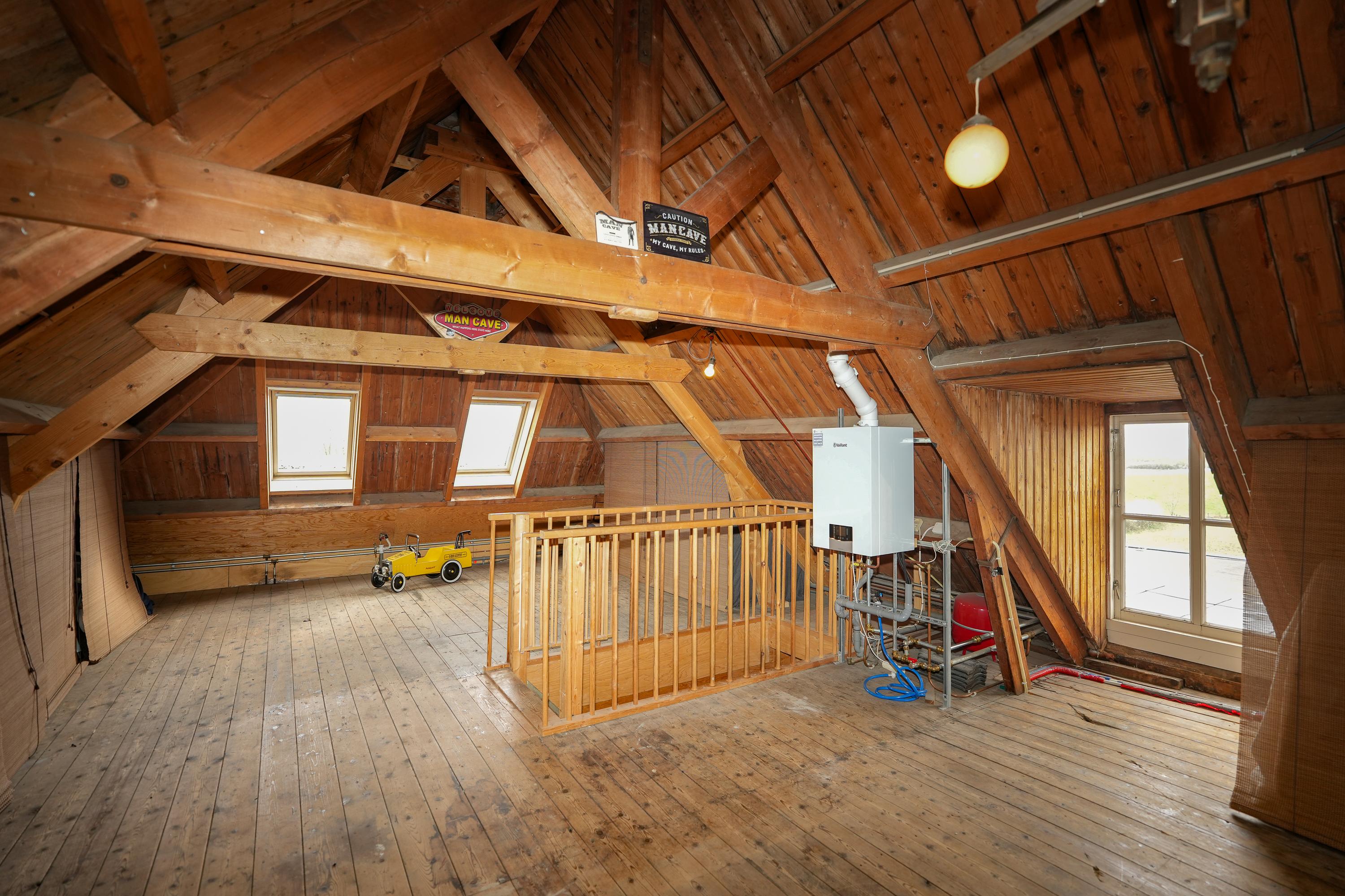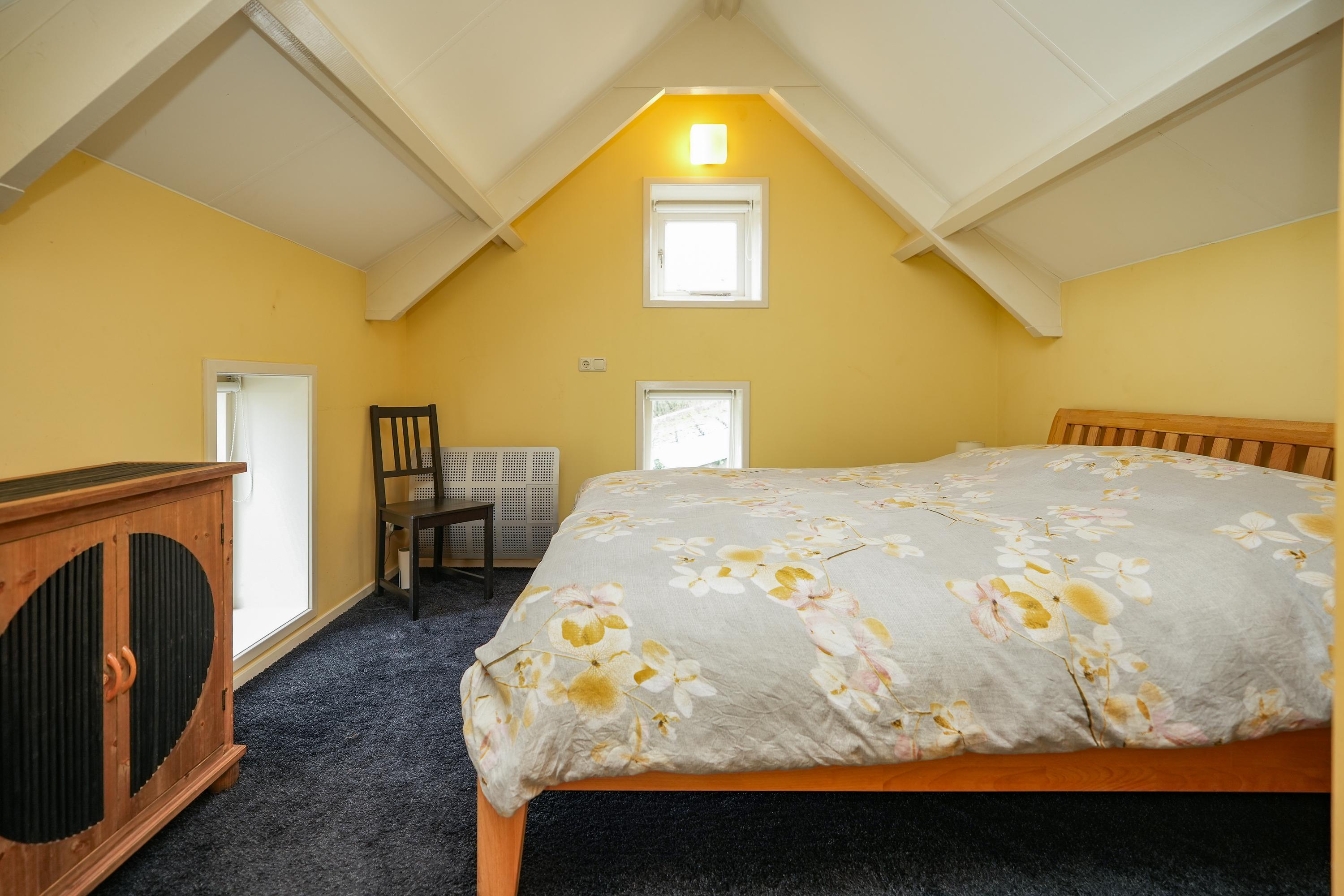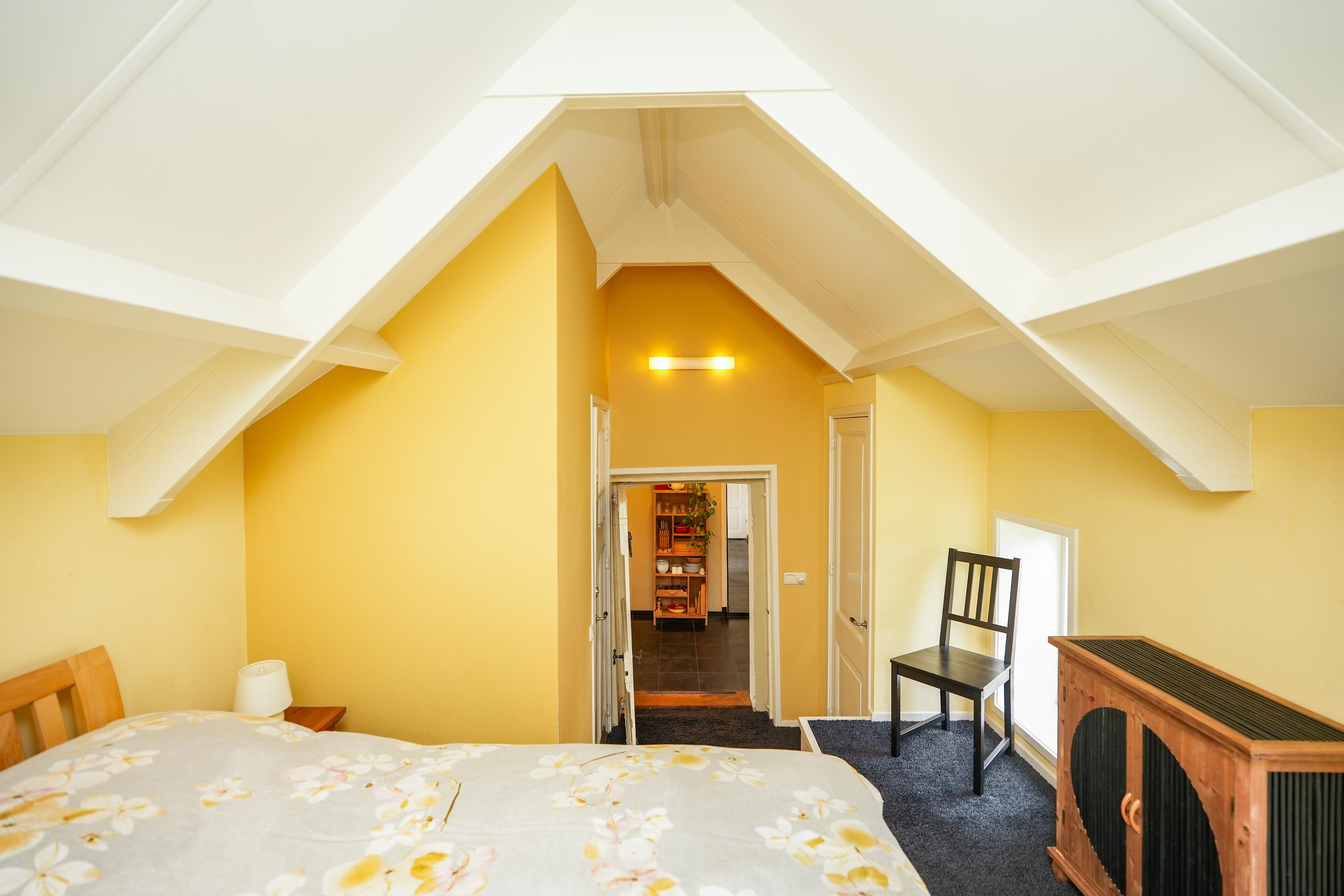 Via een vaste trap is de zolderverdieping bereikbaar, deze strekt zich uit over het voorhuis. Het achterhuis is voorzien van een plat dak. De zolder biedt toegang tot het dak aan de weiland zijde.