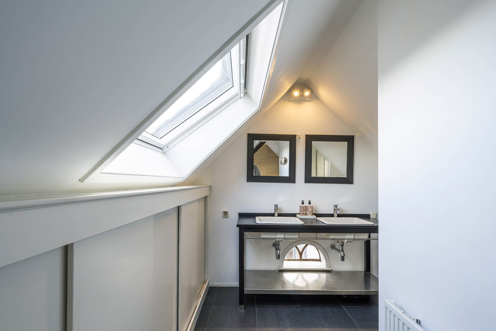 Op de eerste verdieping bevinden zich drie ruime slaapkamers waarvan één wordt gebruikt als waskamer, een moderne badkamer met bad, wastafelmeubel en toilet. Via een vaste trap bereik je de tweede verdieping, waar de ouderslaapkamer met vaste kasten en eigen badkamer een heerlijke privéverdieping vormt.