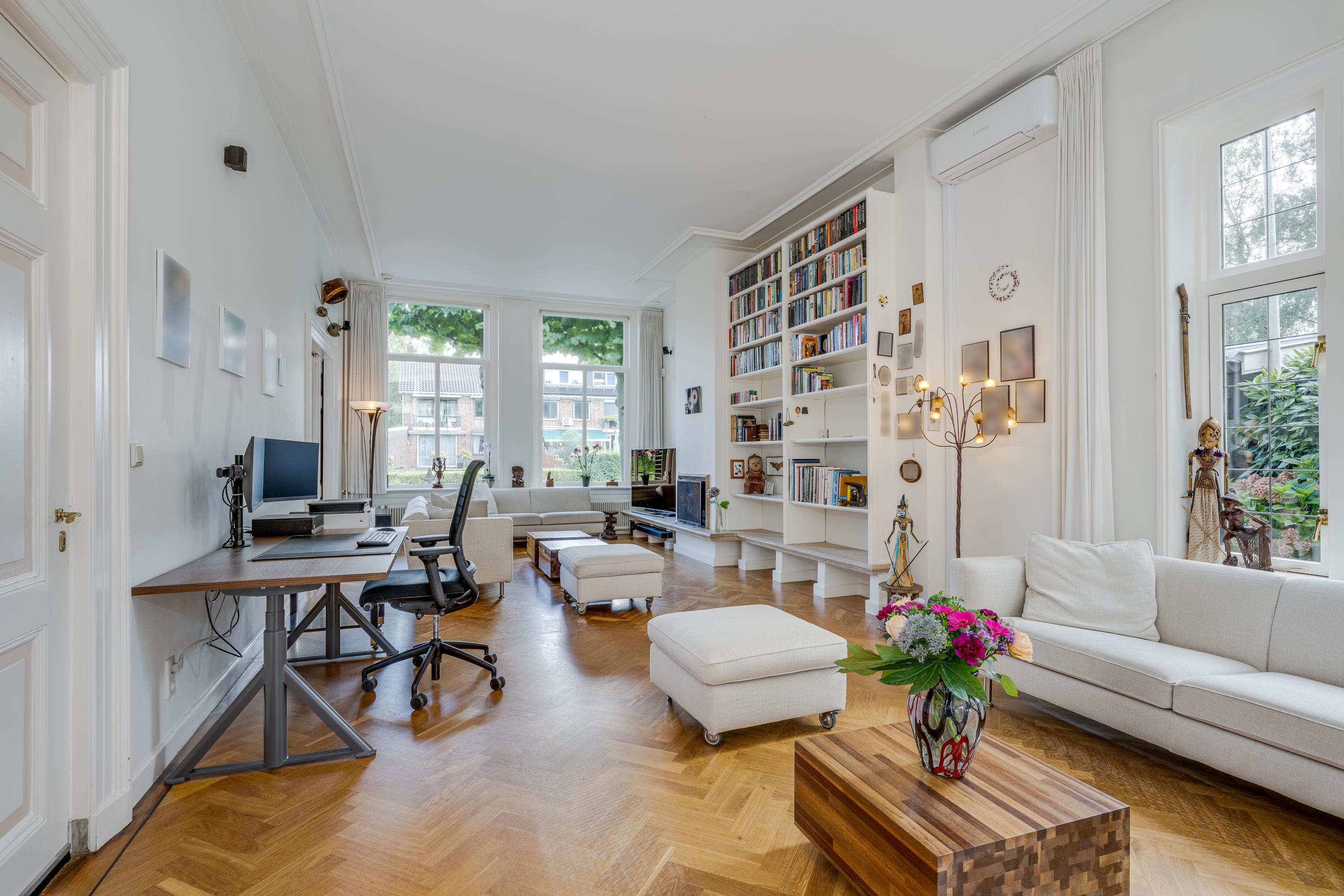 Nadat je het elektrische hek van het poortgebouw achter je hebt gesloten waan je je direct in een andere omgeving en komt de rust over je heen. Een centraal gazon met eeuwenoude plataan (1820) vormt het hart van de binnentuin. Bijzonder is de kas met mandarijnenboom naast de boom, waar je op een zonnige dag in hartje winter nog heerlijk kunt zitten. Zowel links als rechts van het gazon loopt een grindpad, waar je eventueel met de auto direct voor het huis kunt komen. Nu zijn er enkele hoekjes en zitjes waar je op verschillende momenten van de dag kan genieten van zon of schaduw. Iets verderop ligt een vijver die van een waterleidingsysteem met Rijnwater is voorzien, met daarachter de entree van de woning, links geflankeerd door een veranda en rechts een zonrijke serre. Ook hier zijn het alle jaargetijden genieten van deze grote tuin.