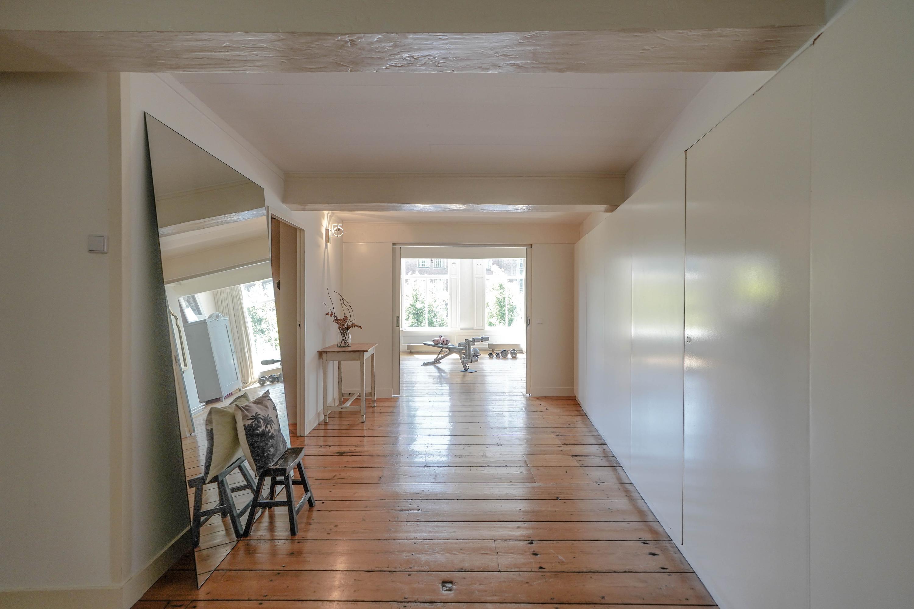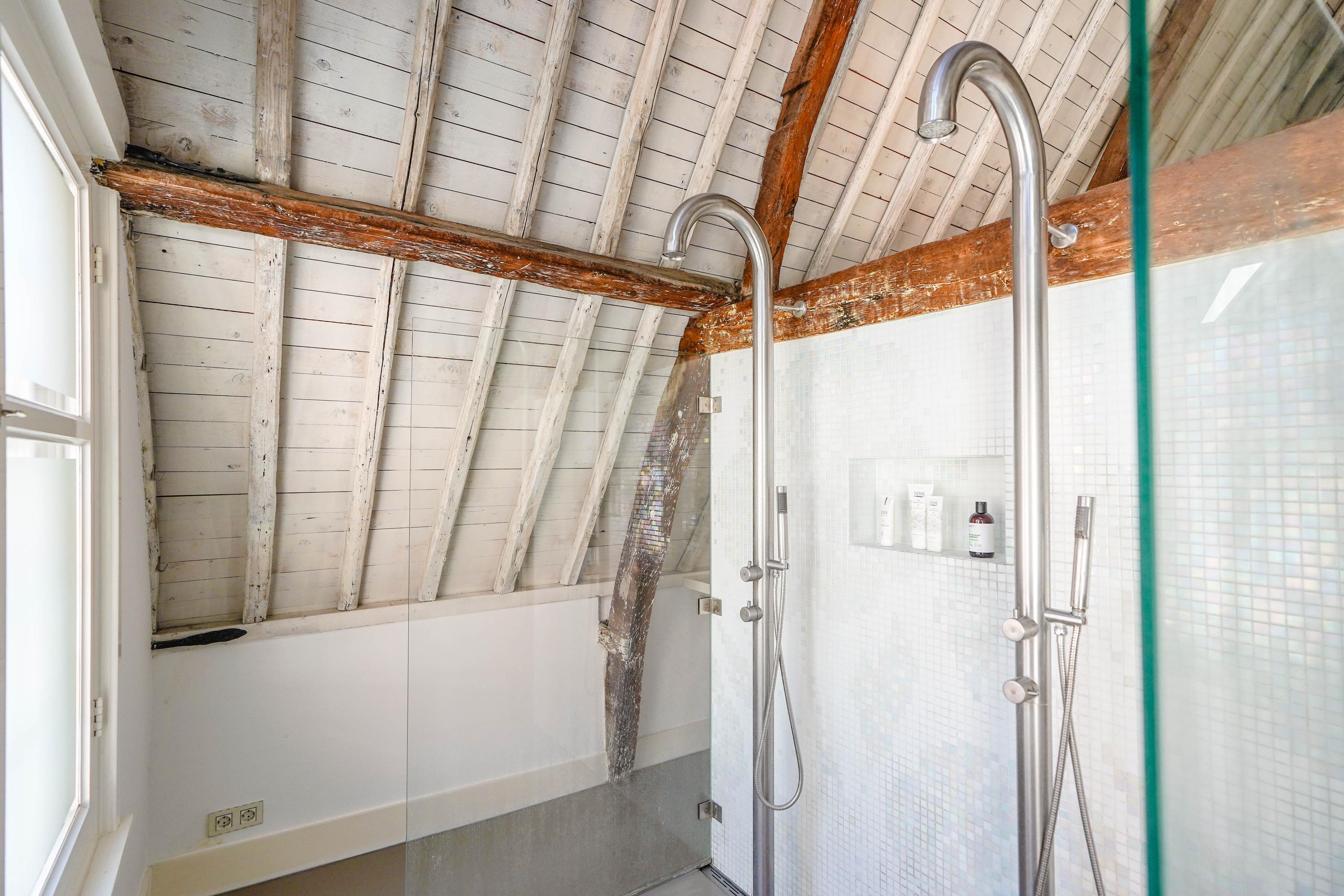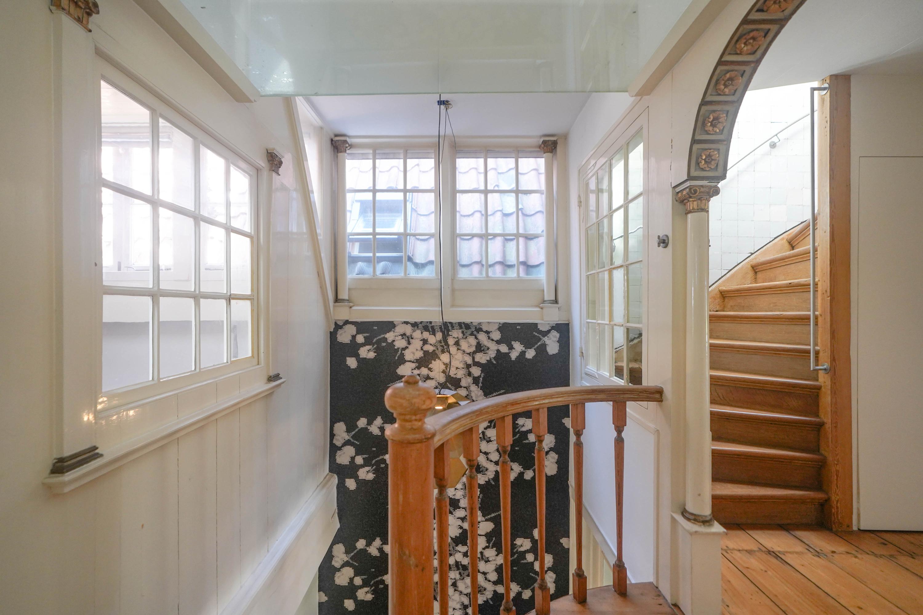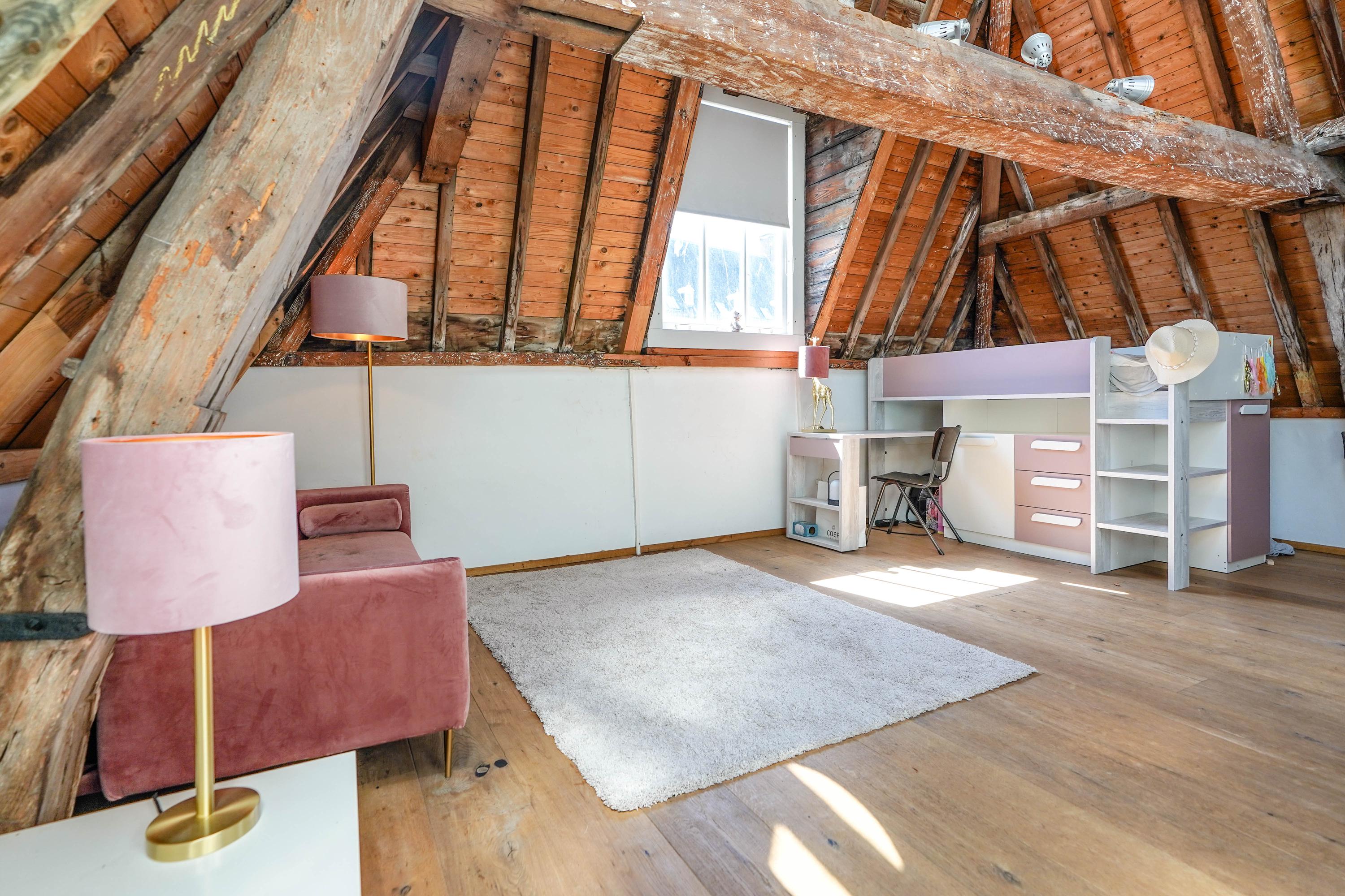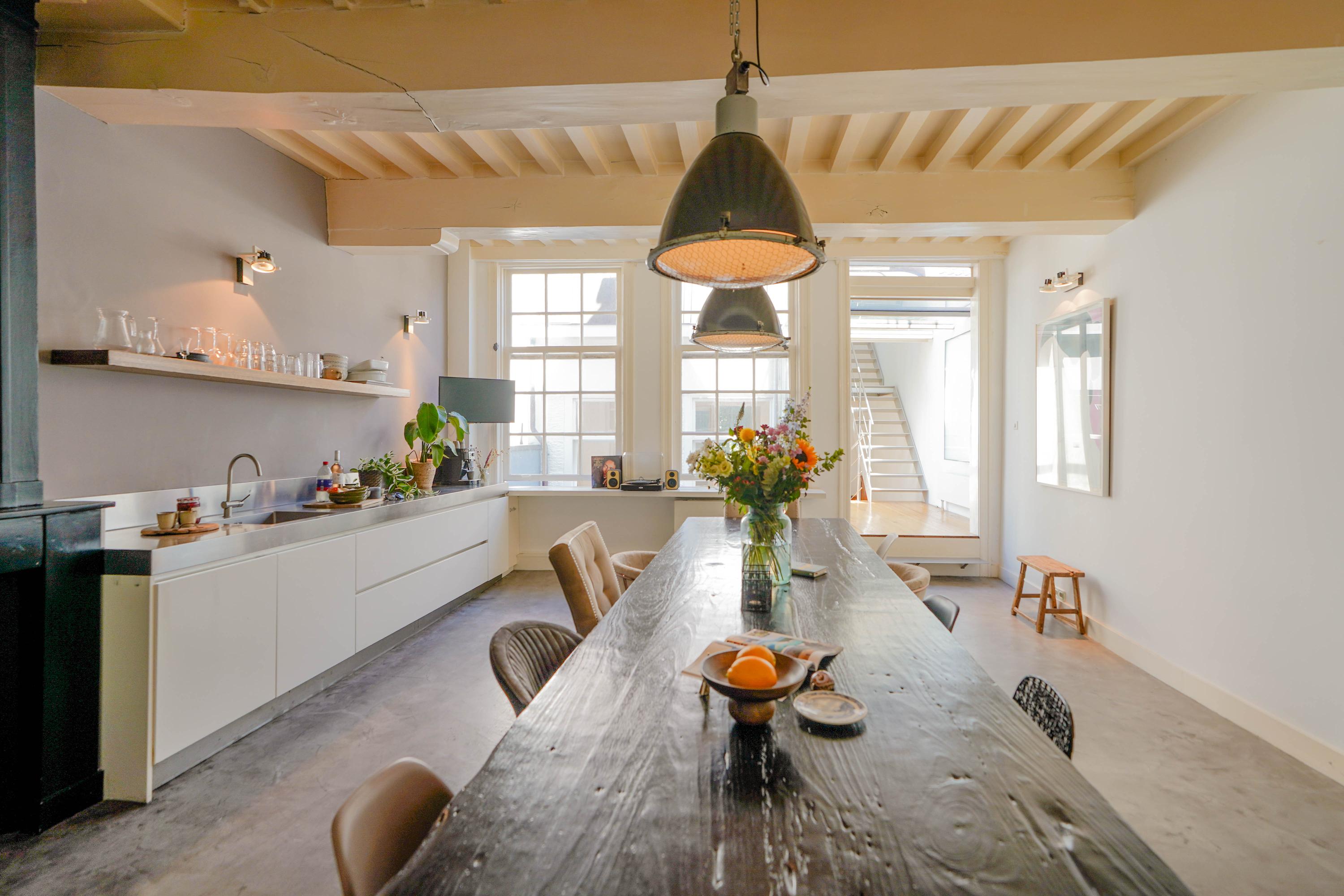 Het voorhuis is het oorspronkelijke hoofdhuis. Op de begane grond is een winkel gevestigd (kan in verhuurde staat worden gekocht) en hier vindt je nu op de 1e etage de woonkamer van maar liefst 70 m² van waar je uitkijkt over de Rijn en het Stadhuisplein. Aan de achterzijde ligt de woonkeuken met ruimte. Veel ruimte. Met 50 m², lange werkbladen en een eettafel met plek voor 12 is dit nu het hart van het huis. Vanuit hier is ook een van de doorgangen naar het achterhuis langs de binnenplaats wat voor veel lichtinval zorgt. Een etage hoger zijn de slaapverdiepingen. Hier is de woning afgepeld tot de structuur met de prachtige houten sporenkap vol in het zicht. Tussen de sporen zijn hoge Velux ramen aangebracht die zorgen voor een fraaie lichtinval op elk moment van de dag. Aan voorzijde vindt je verdeeld over twee verdiepingen drie slaapkamers, een badkamer en vooral veel bergruimte met inbouwkasten en een linnenkamer. Aan achterzijde beslaat de master bedroom met badkamer ensuite de gehele kap met een nok van maar liefst 8 meter hoog.
