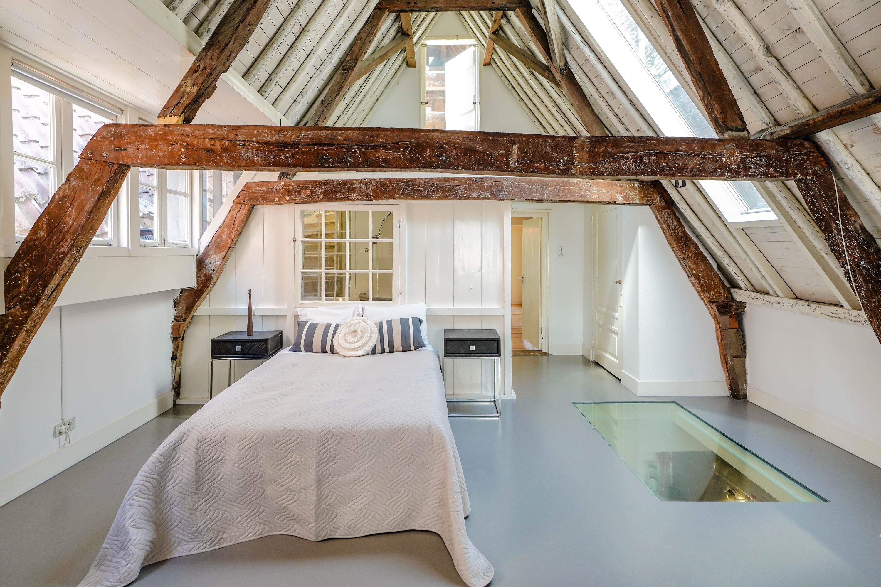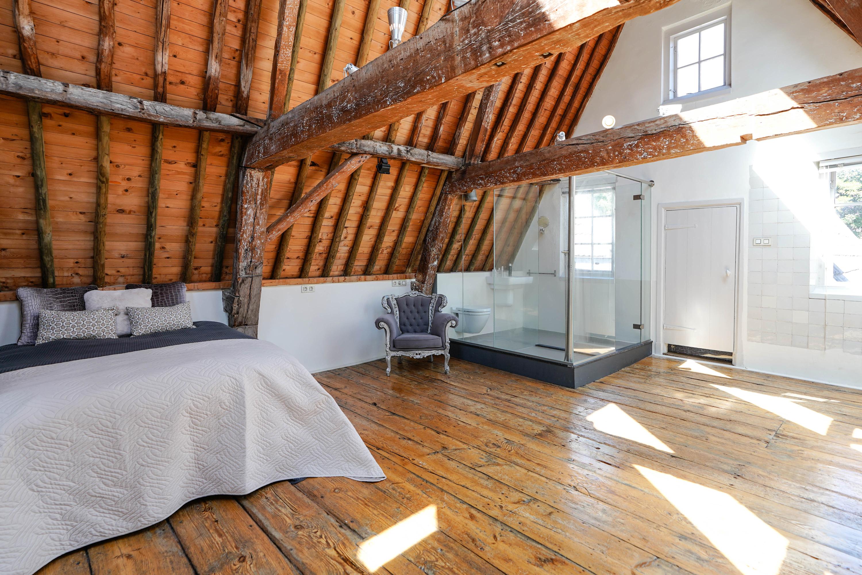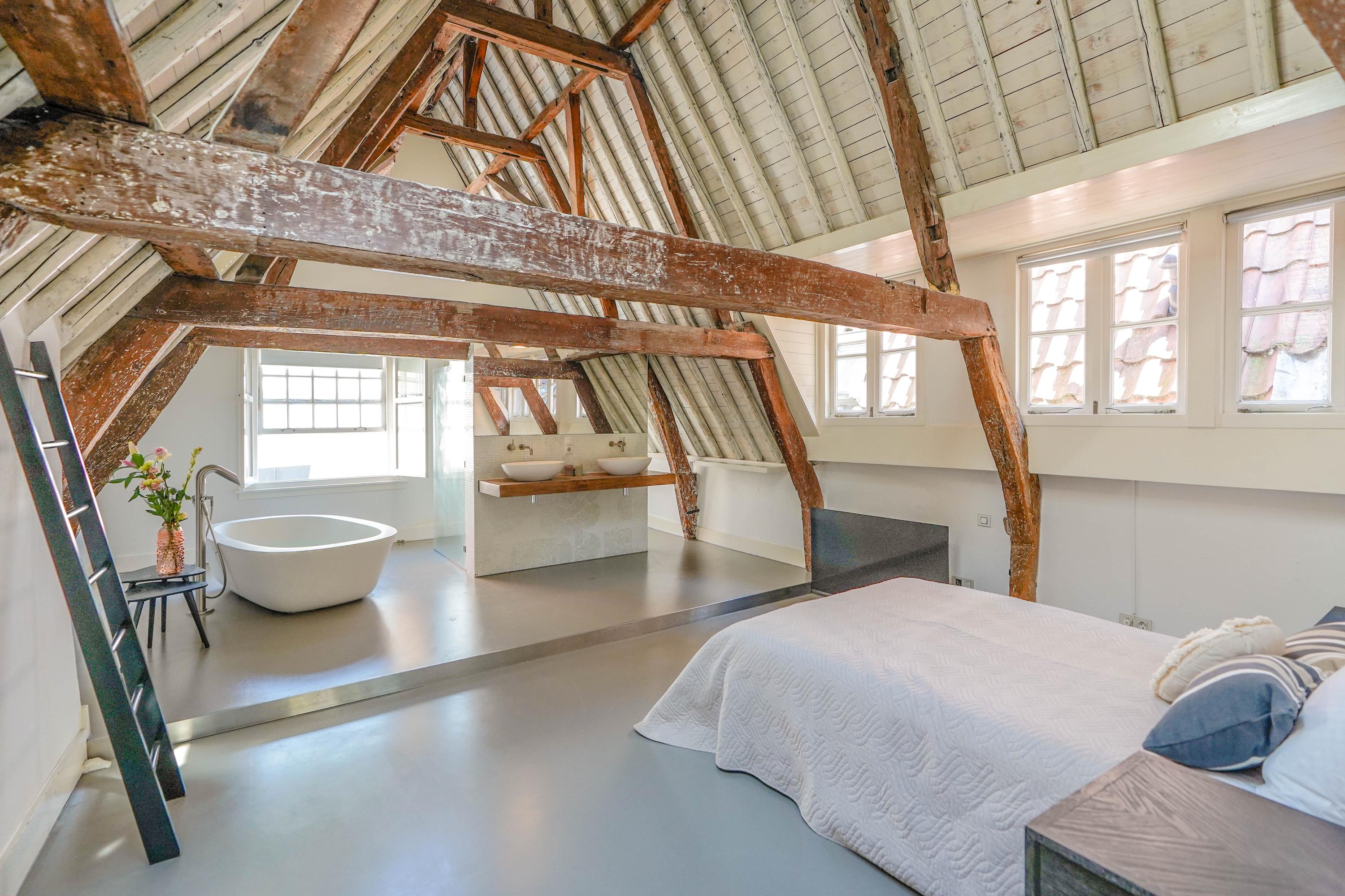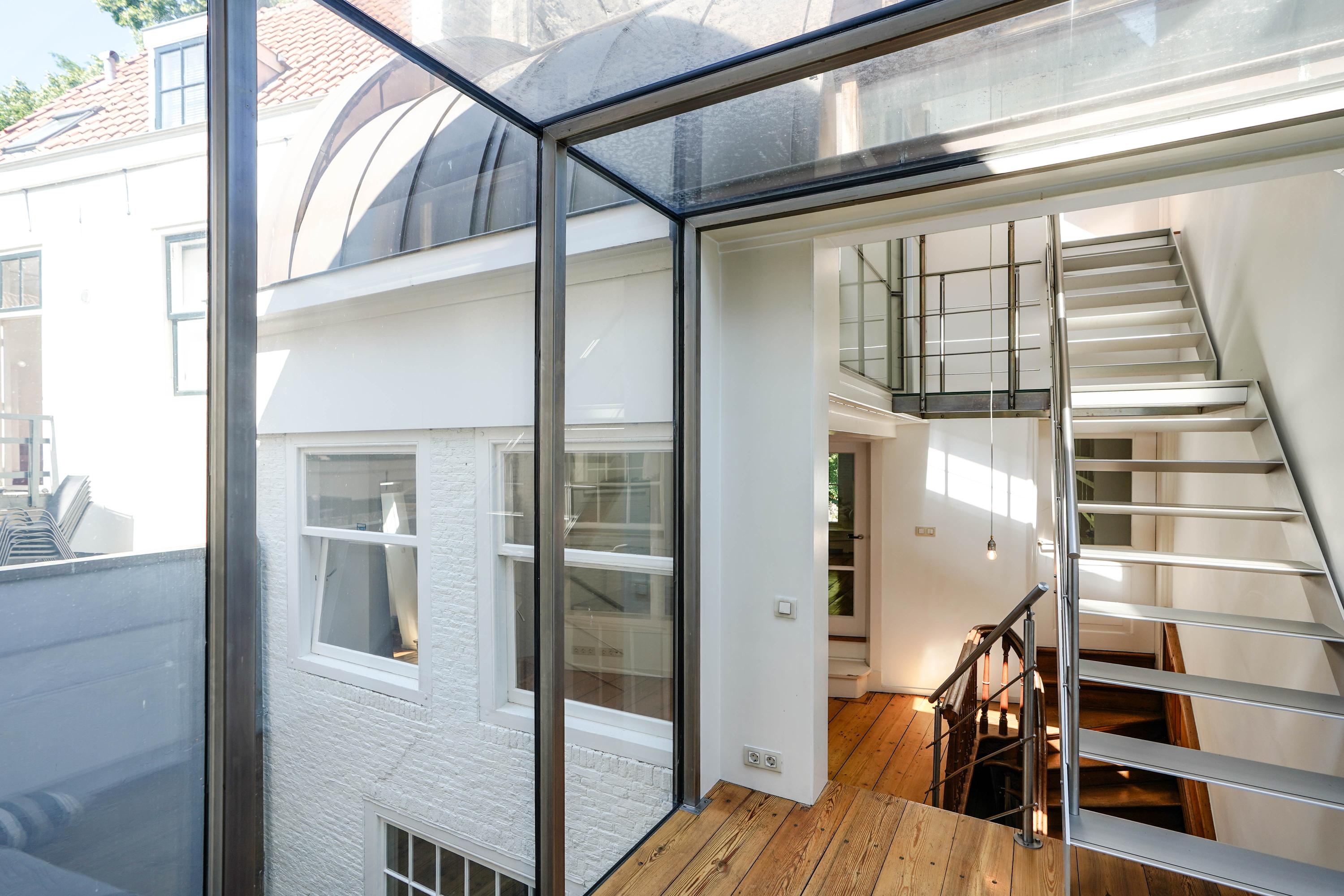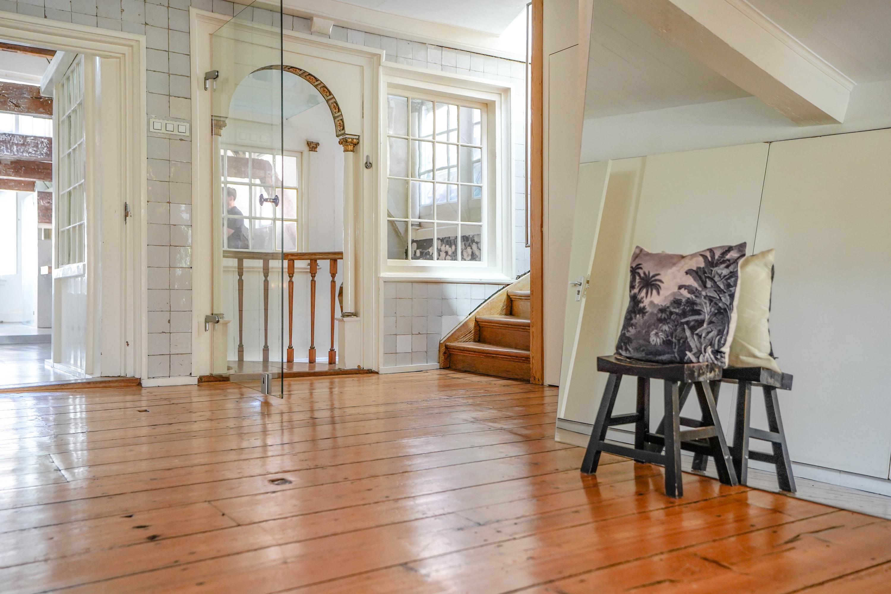 Het voorhuis is het oorspronkelijke hoofdhuis. Op de begane grond is een winkel gevestigd (kan in verhuurde staat worden gekocht) en hier vindt je nu op de 1e etage de woonkamer van maar liefst 70 m² van waar je uitkijkt over de Rijn en het Stadhuisplein. Aan de achterzijde ligt de woonkeuken met ruimte. Veel ruimte. Met 50 m², lange werkbladen en een eettafel met plek voor 12 is dit nu het hart van het huis. Vanuit hier is ook een van de doorgangen naar het achterhuis langs de binnenplaats wat voor veel lichtinval zorgt. Een etage hoger zijn de slaapverdiepingen. Hier is de woning afgepeld tot de structuur met de prachtige houten sporenkap vol in het zicht. Tussen de sporen zijn hoge Velux ramen aangebracht die zorgen voor een fraaie lichtinval op elk moment van de dag. Aan voorzijde vindt je verdeeld over twee verdiepingen drie slaapkamers, een badkamer en vooral veel bergruimte met inbouwkasten en een linnenkamer. Aan achterzijde beslaat de master bedroom met badkamer ensuite de gehele kap met een nok van maar liefst 8 meter hoog.