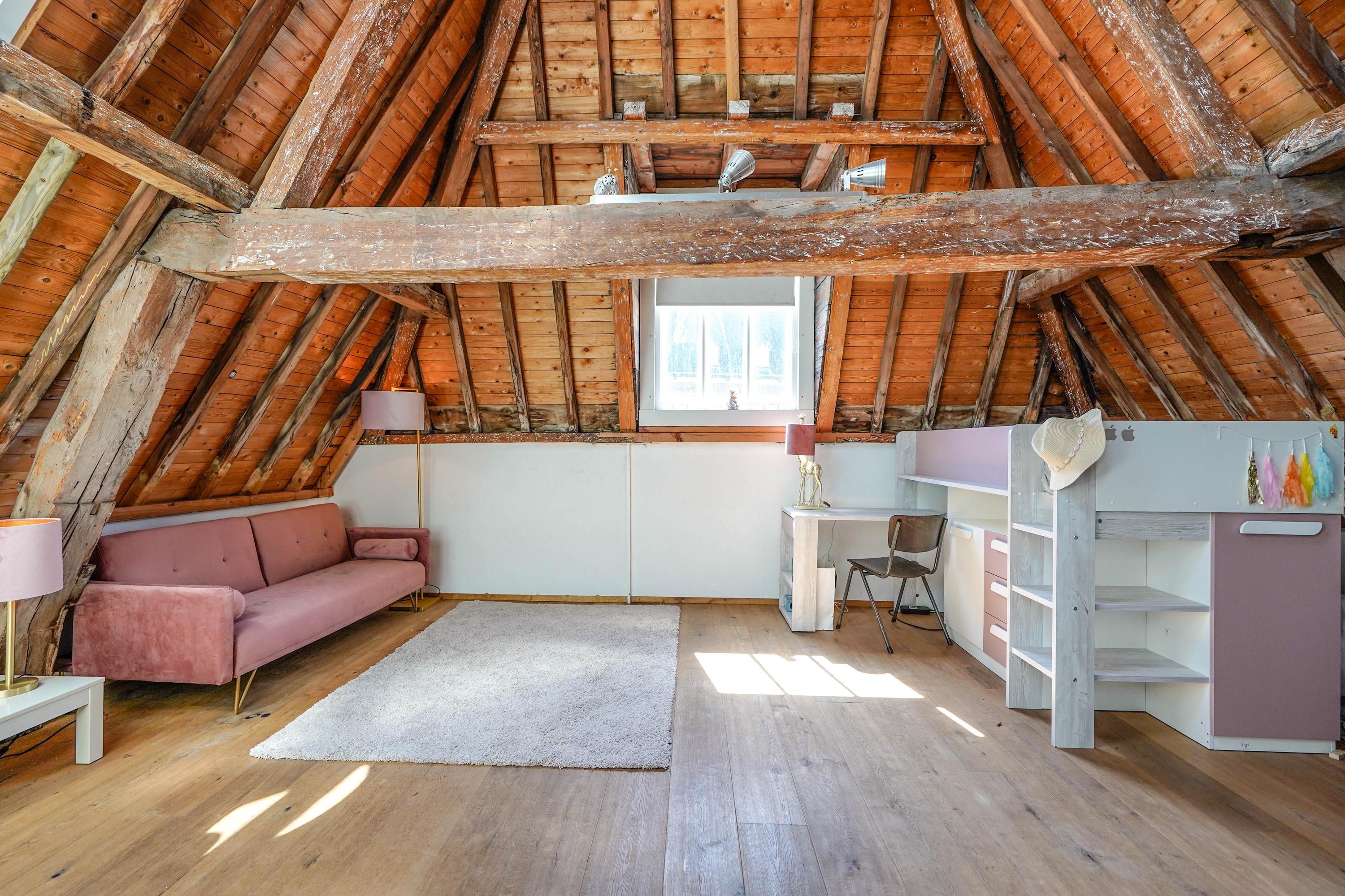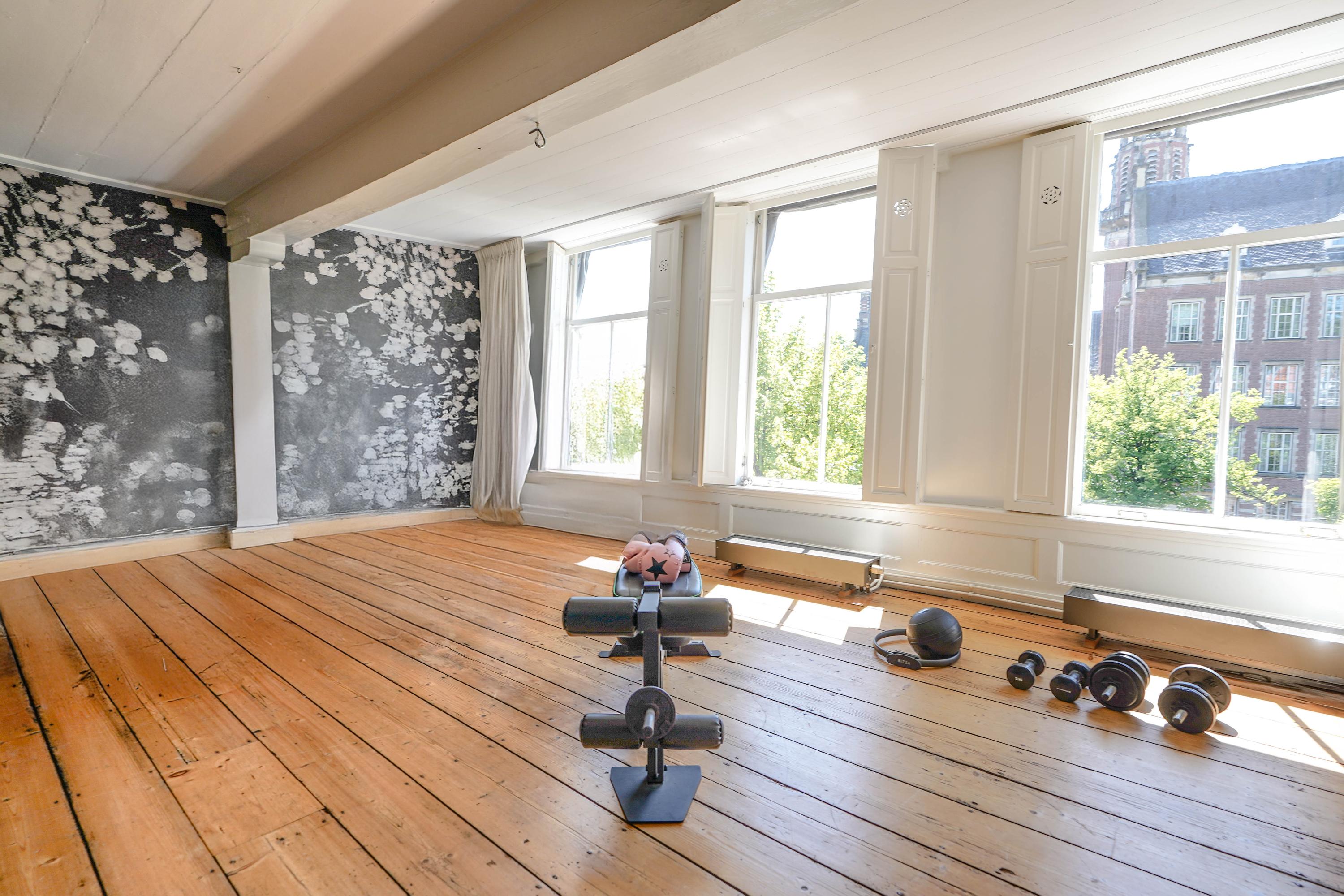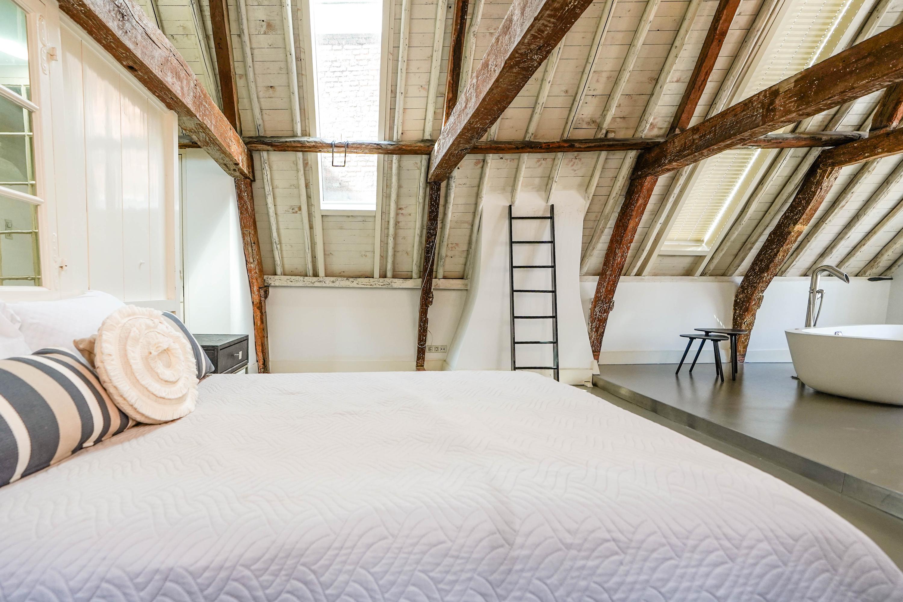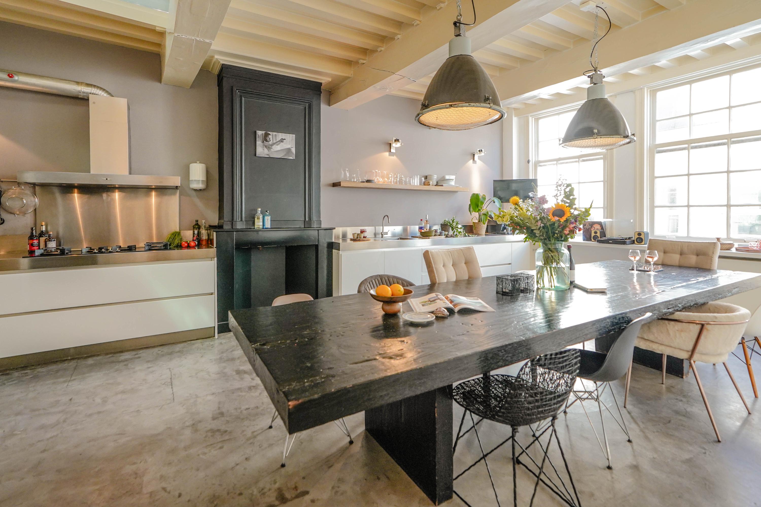 Het voorhuis is het oorspronkelijke hoofdhuis. Op de begane grond is een winkel gevestigd (kan in verhuurde staat worden gekocht) en hier vindt je nu op de 1e etage de woonkamer van maar liefst 70 m² van waar je uitkijkt over de Rijn en het Stadhuisplein. Aan de achterzijde ligt de woonkeuken met ruimte. Veel ruimte. Met 50 m², lange werkbladen en een eettafel met plek voor 12 is dit nu het hart van het huis. Vanuit hier is ook een van de doorgangen naar het achterhuis langs de binnenplaats wat voor veel lichtinval zorgt. Een etage hoger zijn de slaapverdiepingen. Hier is de woning afgepeld tot de structuur met de prachtige houten sporenkap vol in het zicht. Tussen de sporen zijn hoge Velux ramen aangebracht die zorgen voor een fraaie lichtinval op elk moment van de dag. Aan voorzijde vindt je verdeeld over twee verdiepingen drie slaapkamers, een badkamer en vooral veel bergruimte met inbouwkasten en een linnenkamer. Aan achterzijde beslaat de master bedroom met badkamer ensuite de gehele kap met een nok van maar liefst 8 meter hoog.