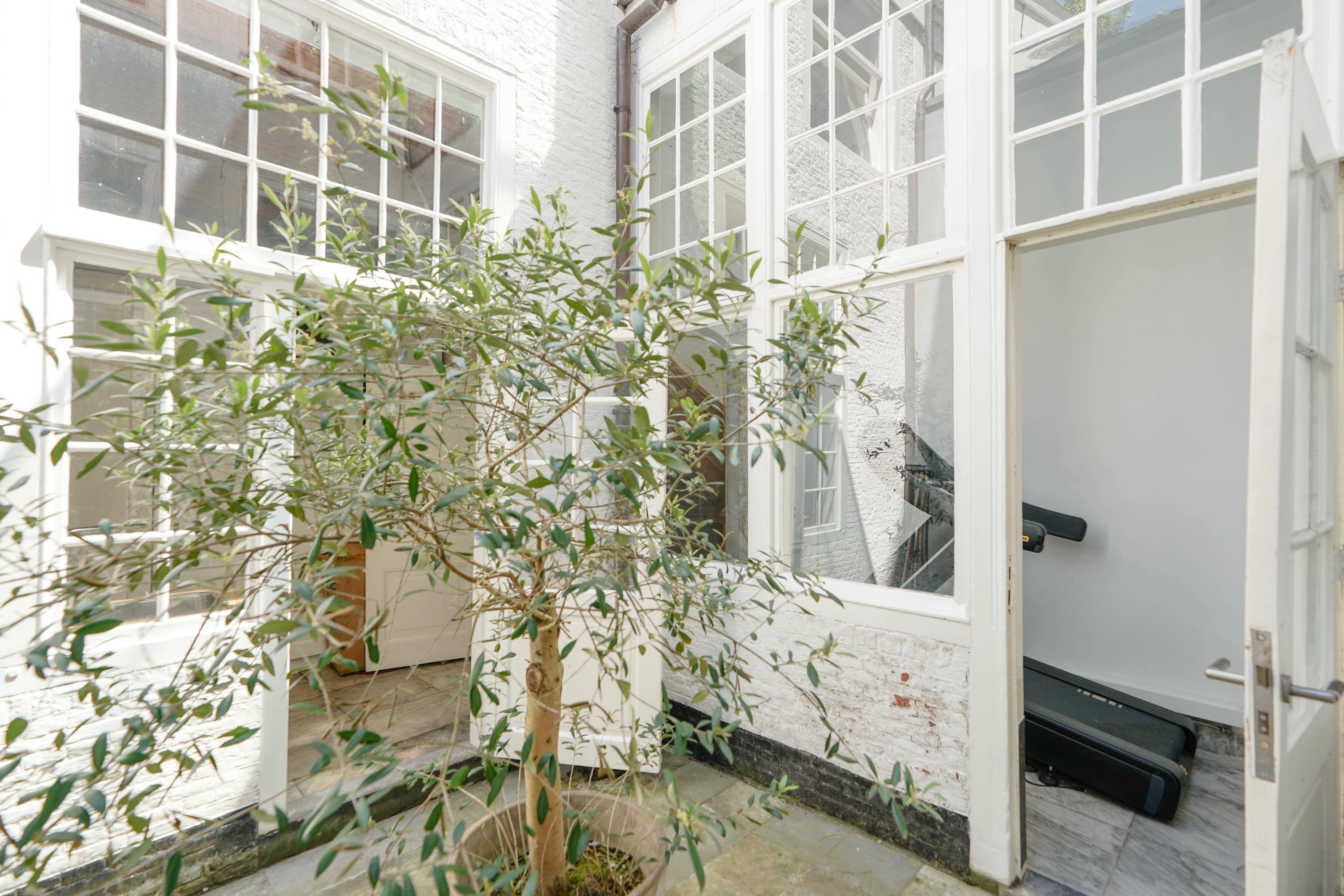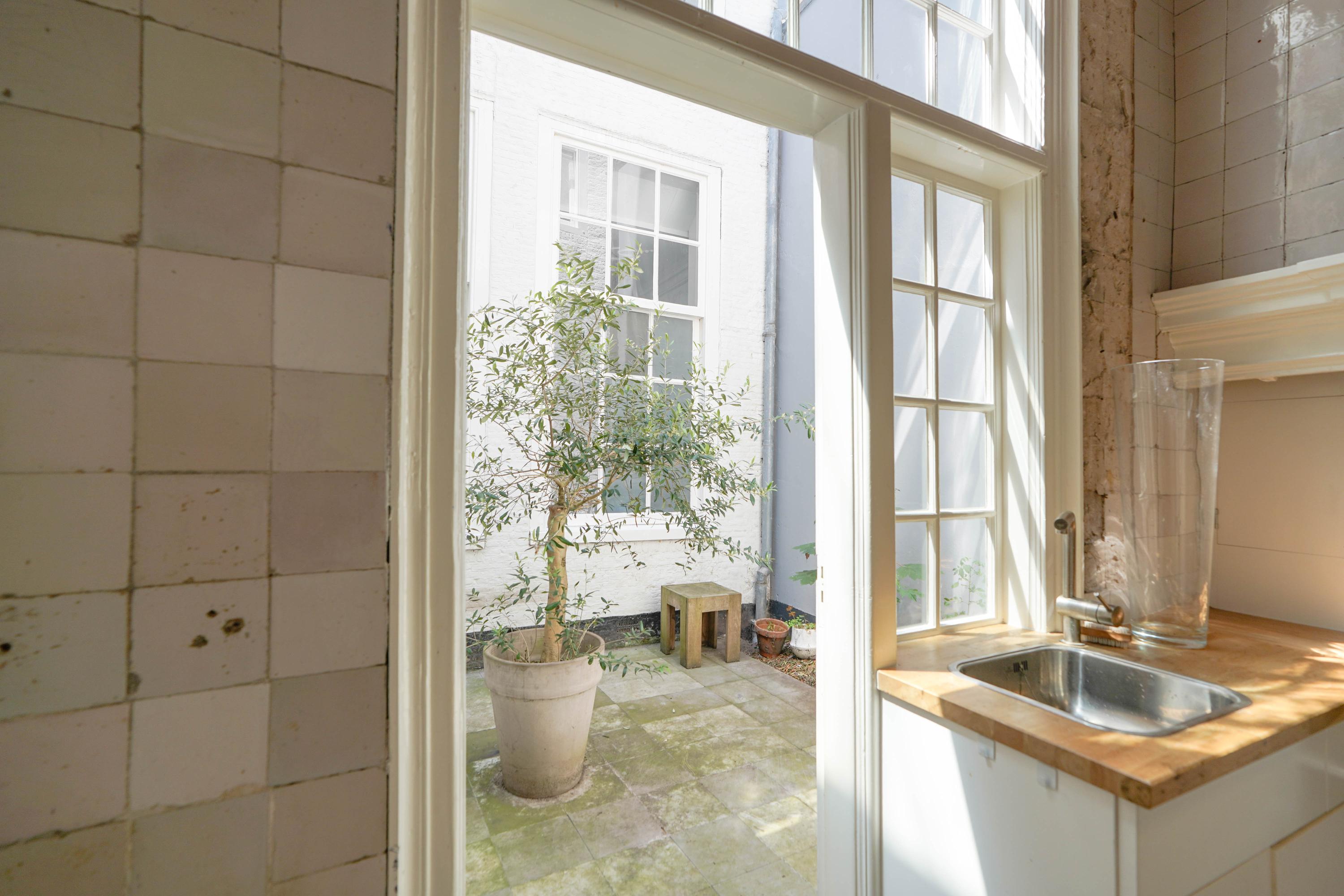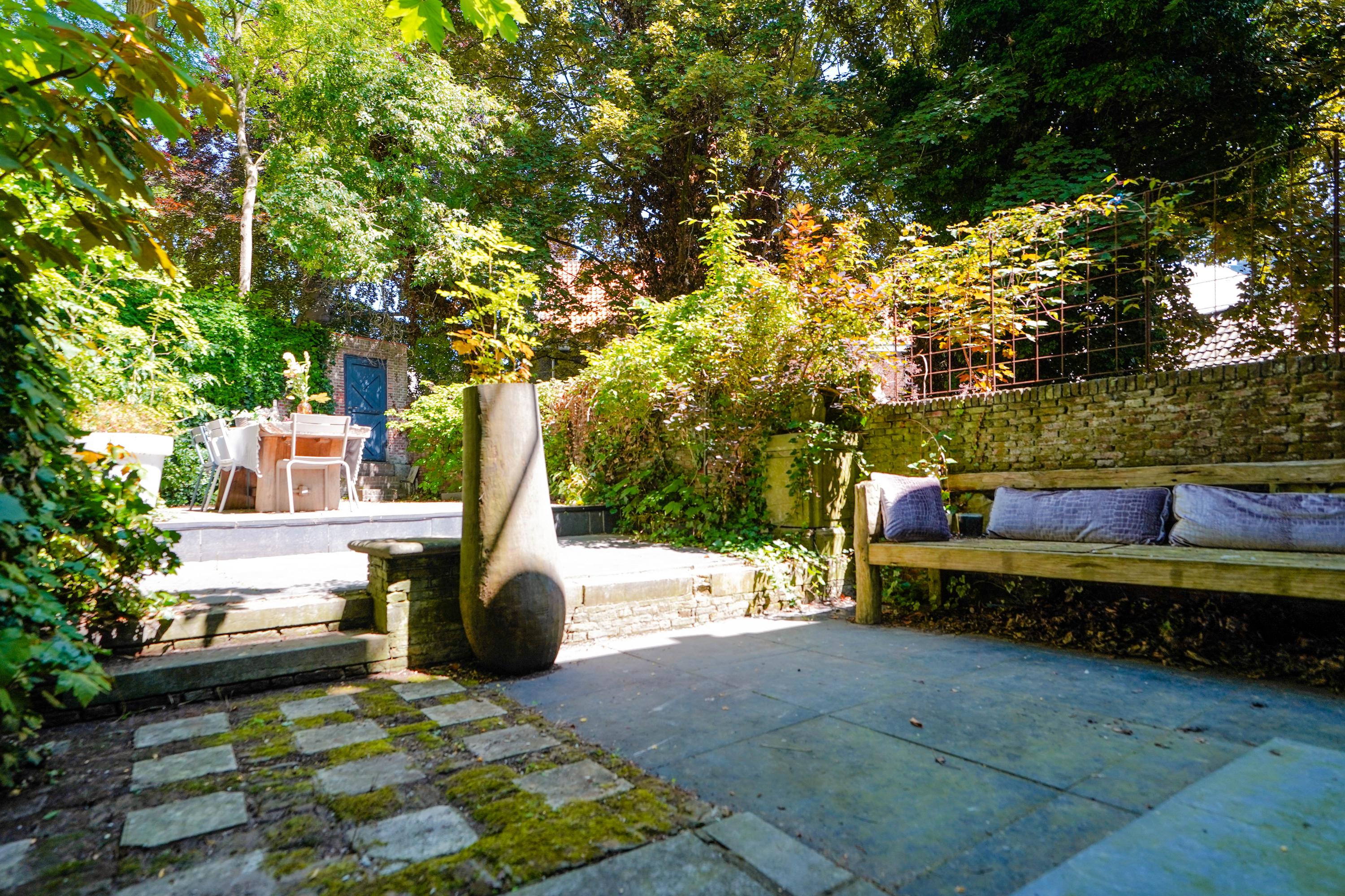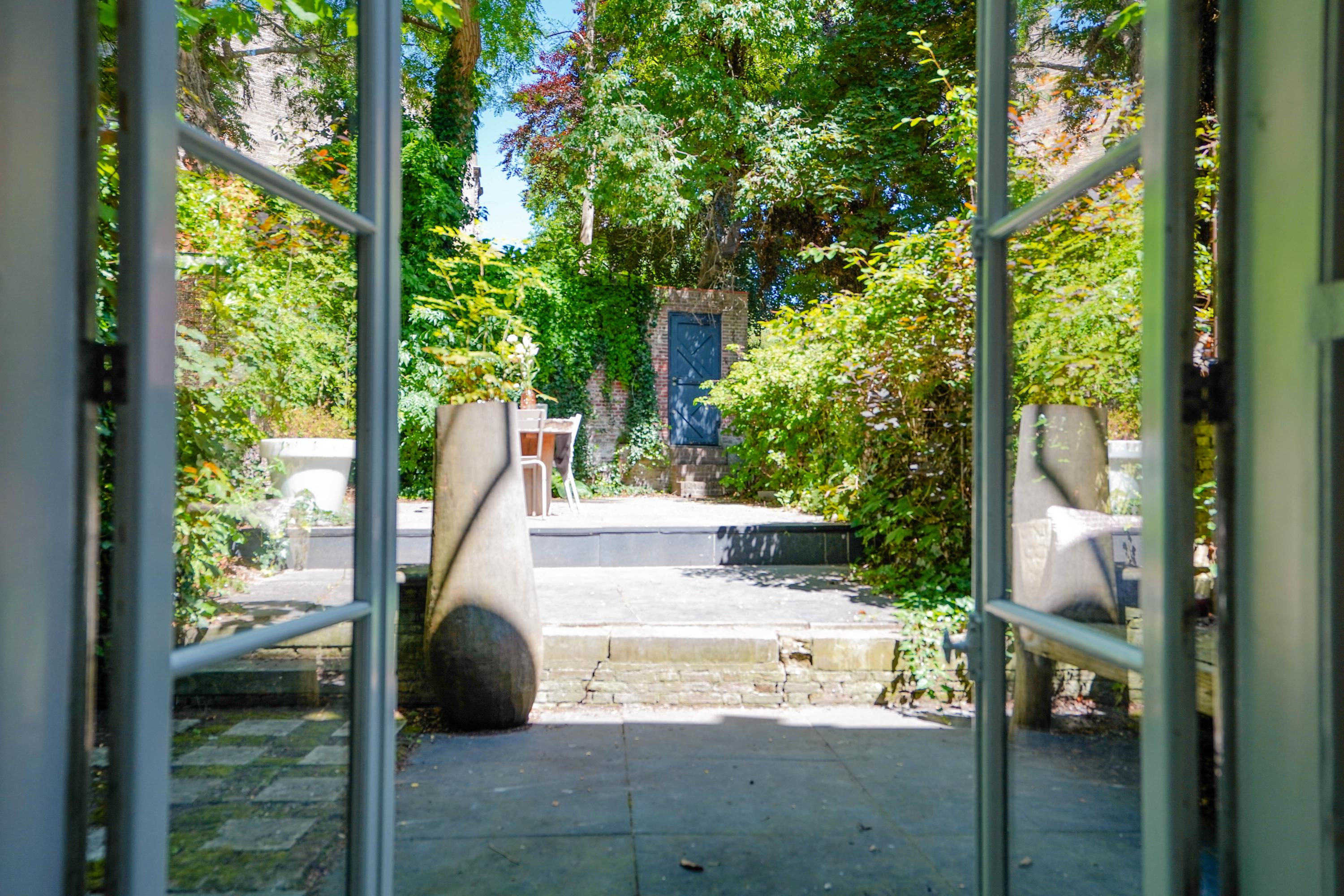 Het achterhuis is gericht op de tuin en de burchtheuvel. Vanuit de verschillende ruimtes zie je het oude onderkomen van de Burggraaf door mooie hoge raampartijen: een 800 jaar oude oase van groen midden in de binnenstad. Hier heeft de huidige eigenaar op de begane grond een tuinkamer met daarbij een extra keuken. Deze heb je ook wel nodig, want om elke keer het hele pand weer door te moeten voor een hapje of drankje als je in de tuin zit is wel wat veel gevraagd. Het zijn nogal afstanden die je hier kan afleggen. Op de 1e etage bevindt zich nu een tweede woonkamer. met hoge plafonds, een haard en het beste zicht op de Burcht. Het zou ook een heerlijk kantoor of een bibliotheek kunnen zijn. Boven is een apart gastenverblijf met eigen badkamer en wc. Een au pair zou hier ook een heel fijn plekje kunnen hebben.