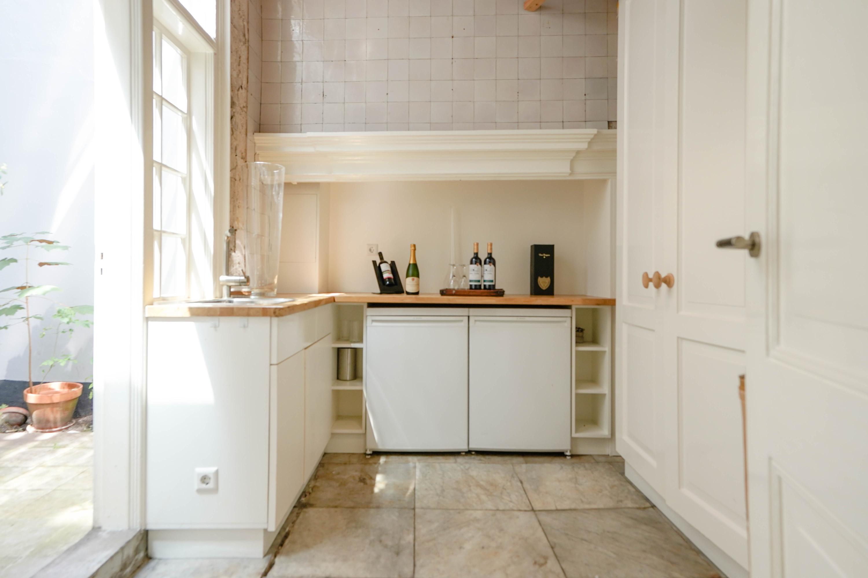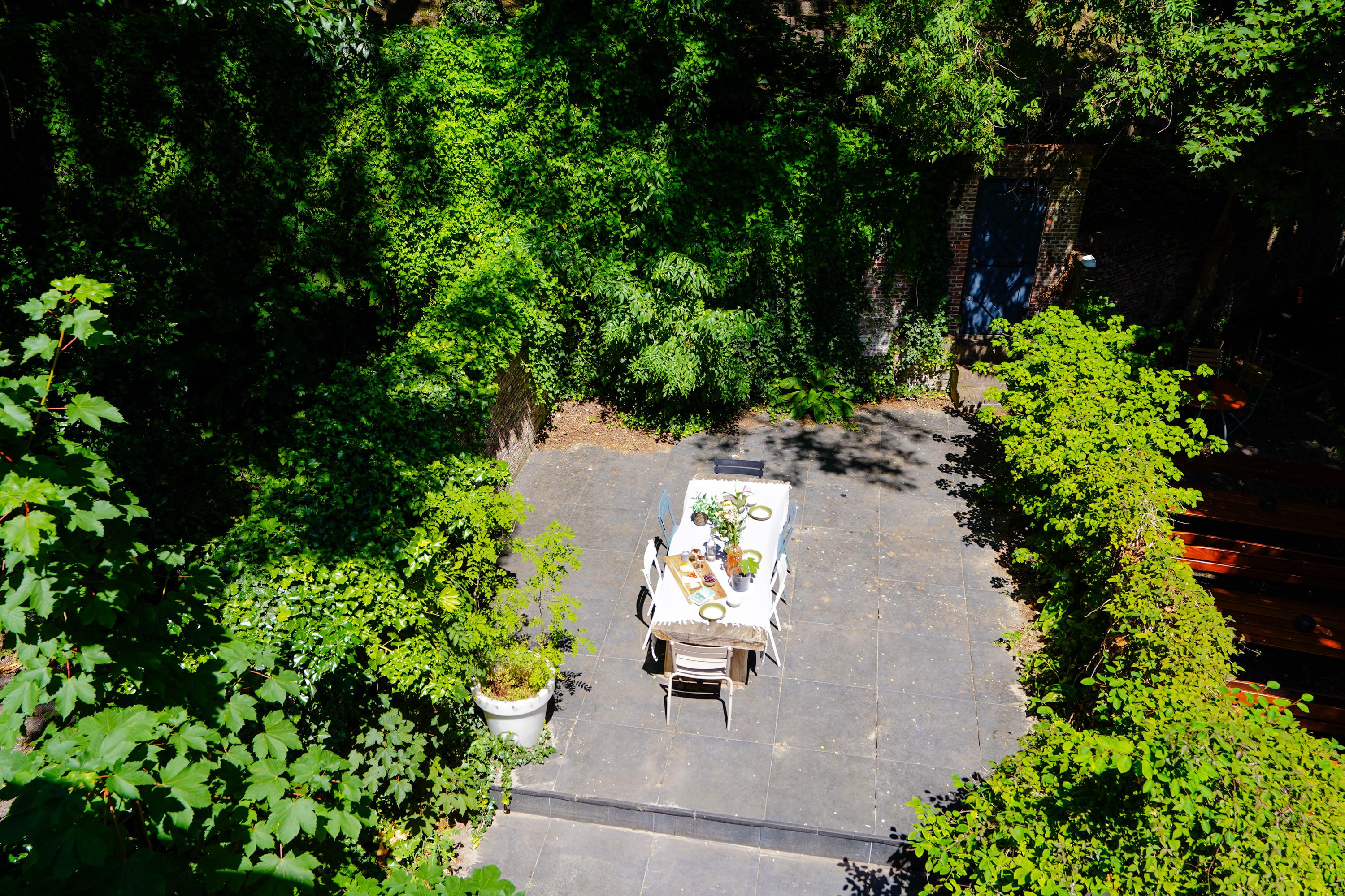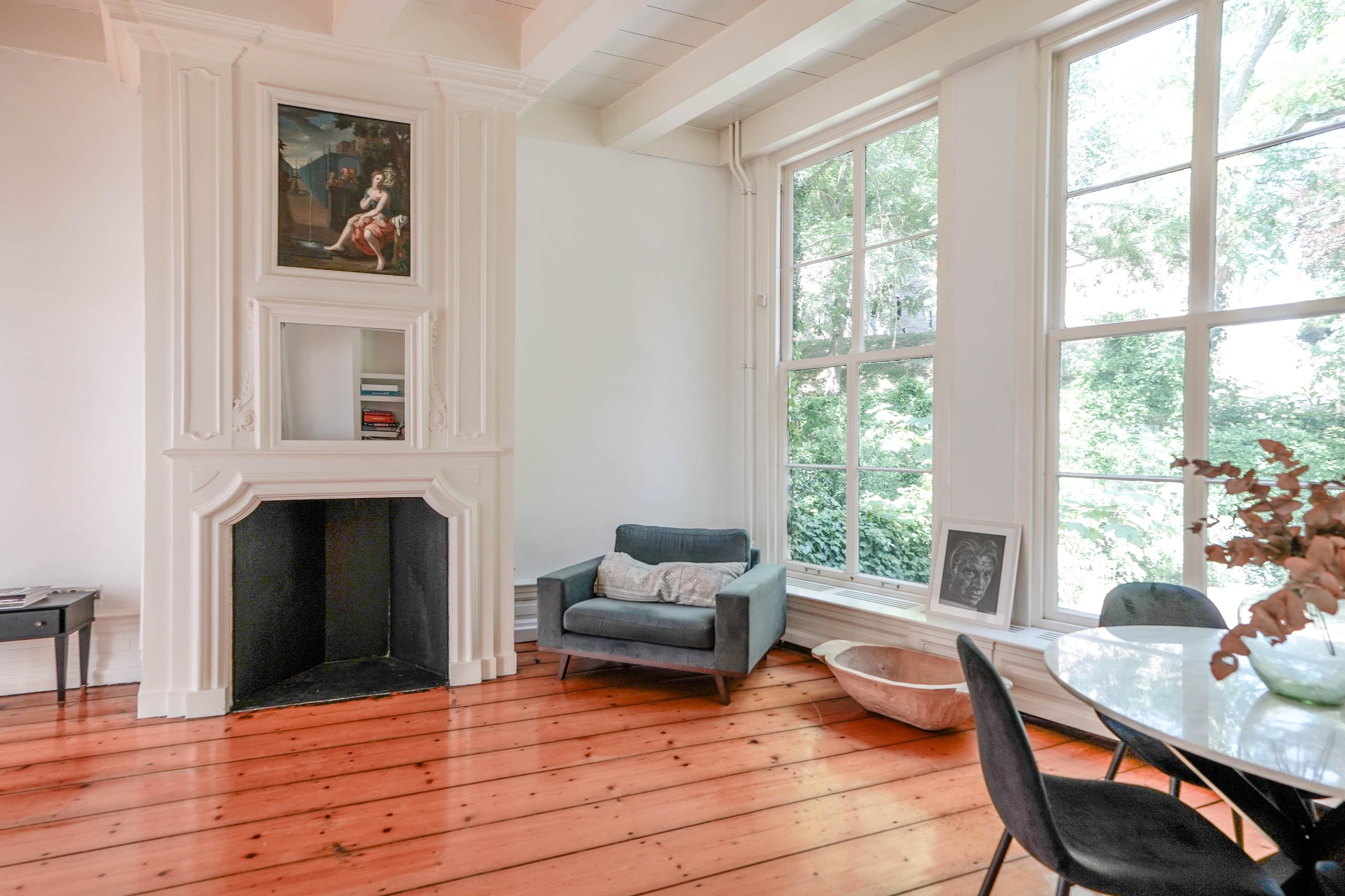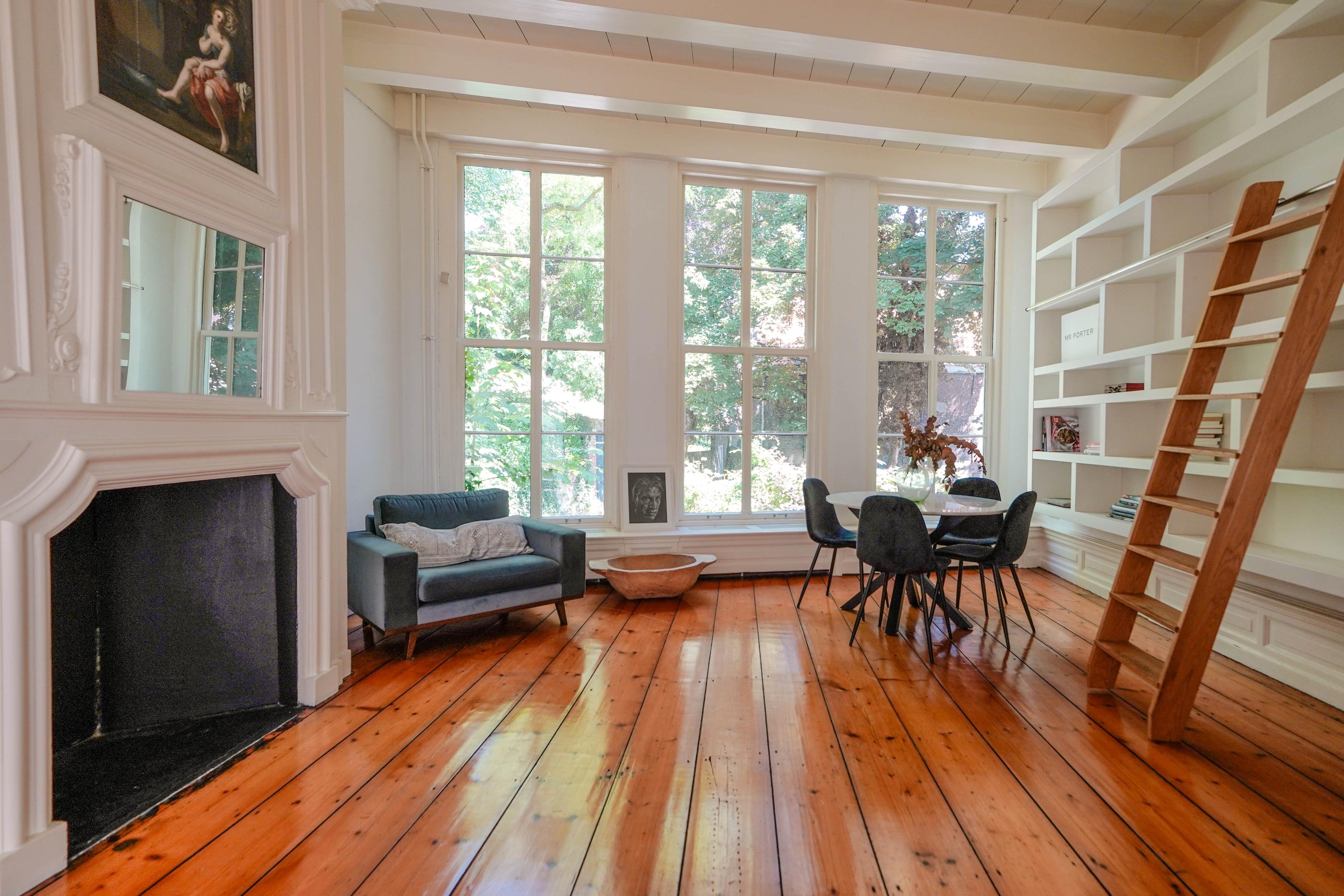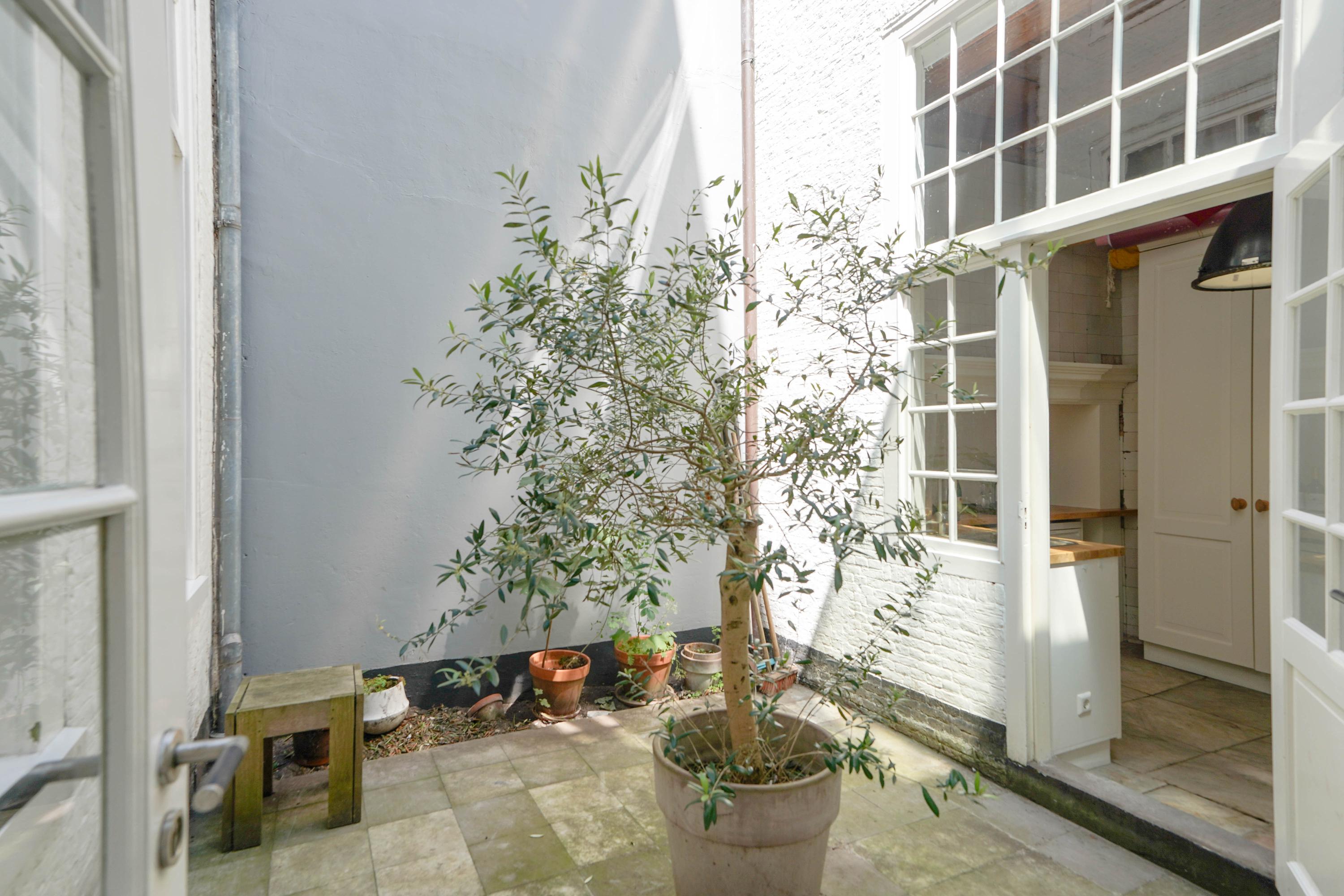 Het achterhuis is gericht op de tuin en de burchtheuvel. Vanuit de verschillende ruimtes zie je het oude onderkomen van de Burggraaf door mooie hoge raampartijen: een 800 jaar oude oase van groen midden in de binnenstad. Hier heeft de huidige eigenaar op de begane grond een tuinkamer met daarbij een extra keuken. Deze heb je ook wel nodig, want om elke keer het hele pand weer door te moeten voor een hapje of drankje als je in de tuin zit is wel wat veel gevraagd. Het zijn nogal afstanden die je hier kan afleggen. Op de 1e etage bevindt zich nu een tweede woonkamer. met hoge plafonds, een haard en het beste zicht op de Burcht. Het zou ook een heerlijk kantoor of een bibliotheek kunnen zijn. Boven is een apart gastenverblijf met eigen badkamer en wc. Een au pair zou hier ook een heel fijn plekje kunnen hebben.