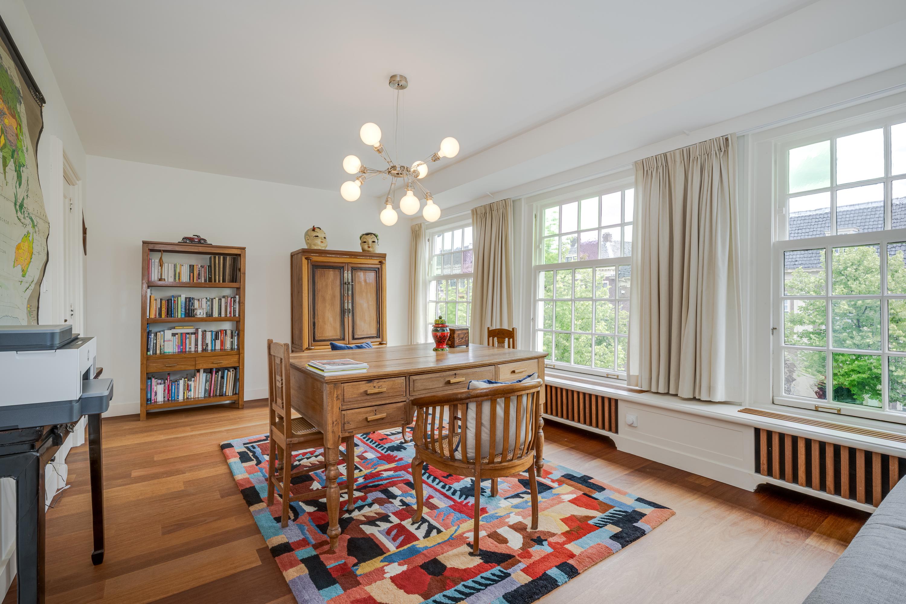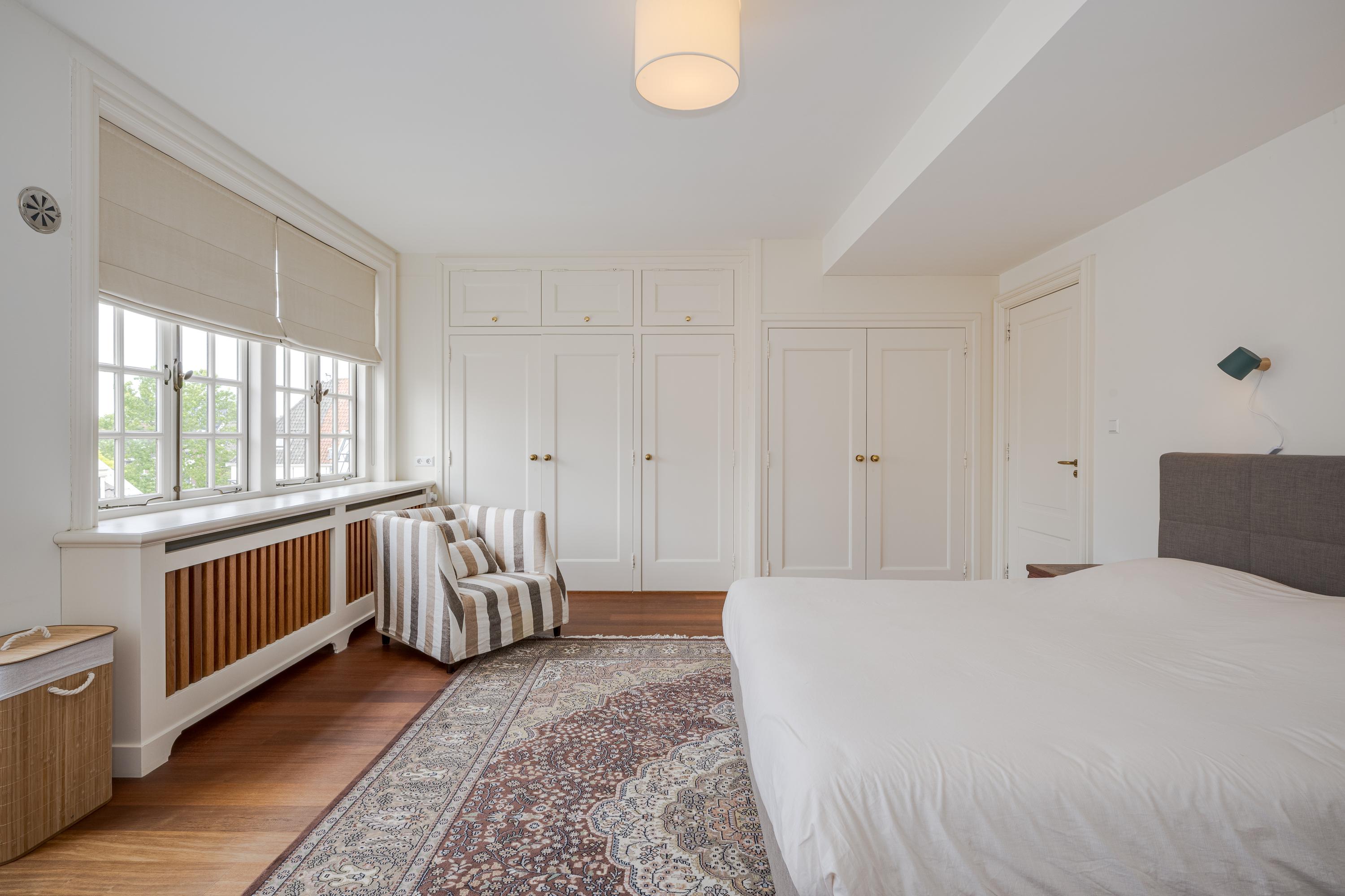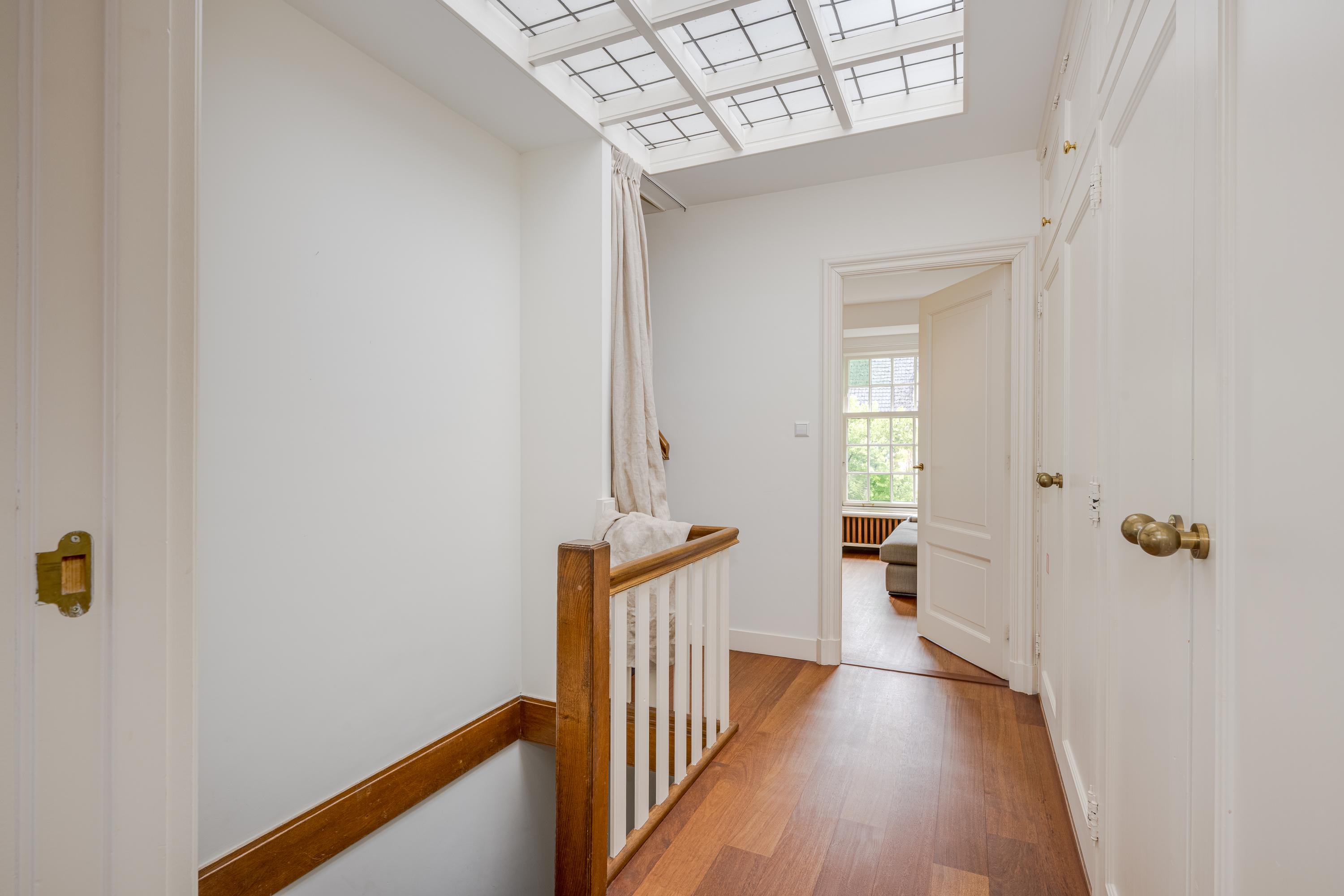 Een monumentale trap leidt naar de eerste verdieping. In het achterhuis bevindt zich een separaat toilet en een slaapkamer met moderne badkamer en suite. In het voorhuis treft u de zeer ruime en lichte woonkamer met aan de tuinzijde een zitkamer rondom de haardpartij en aan de voorzijde (3 ramen breed) een fijne lichte woonkamer met prachtig uitzicht op de gracht en de stad.