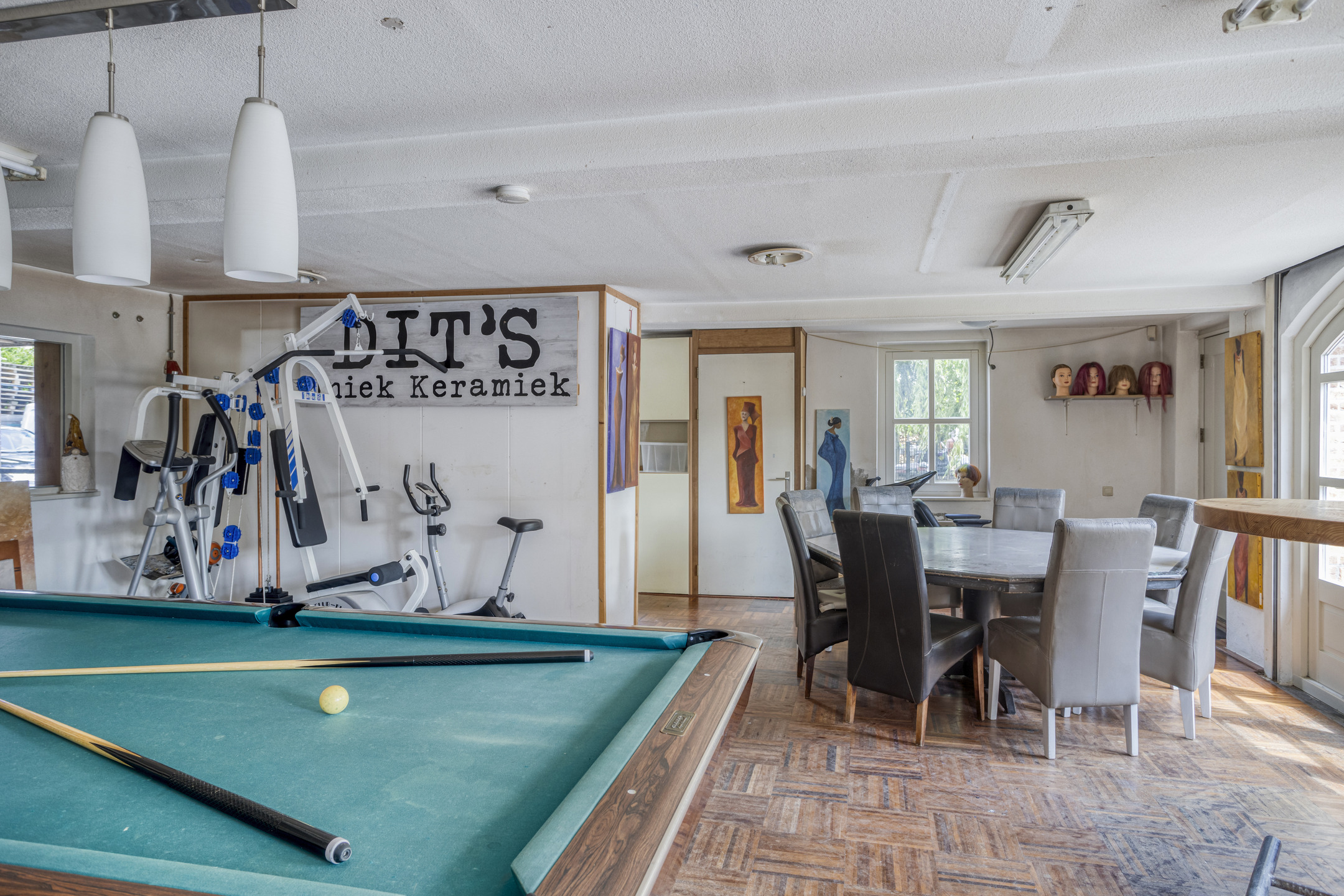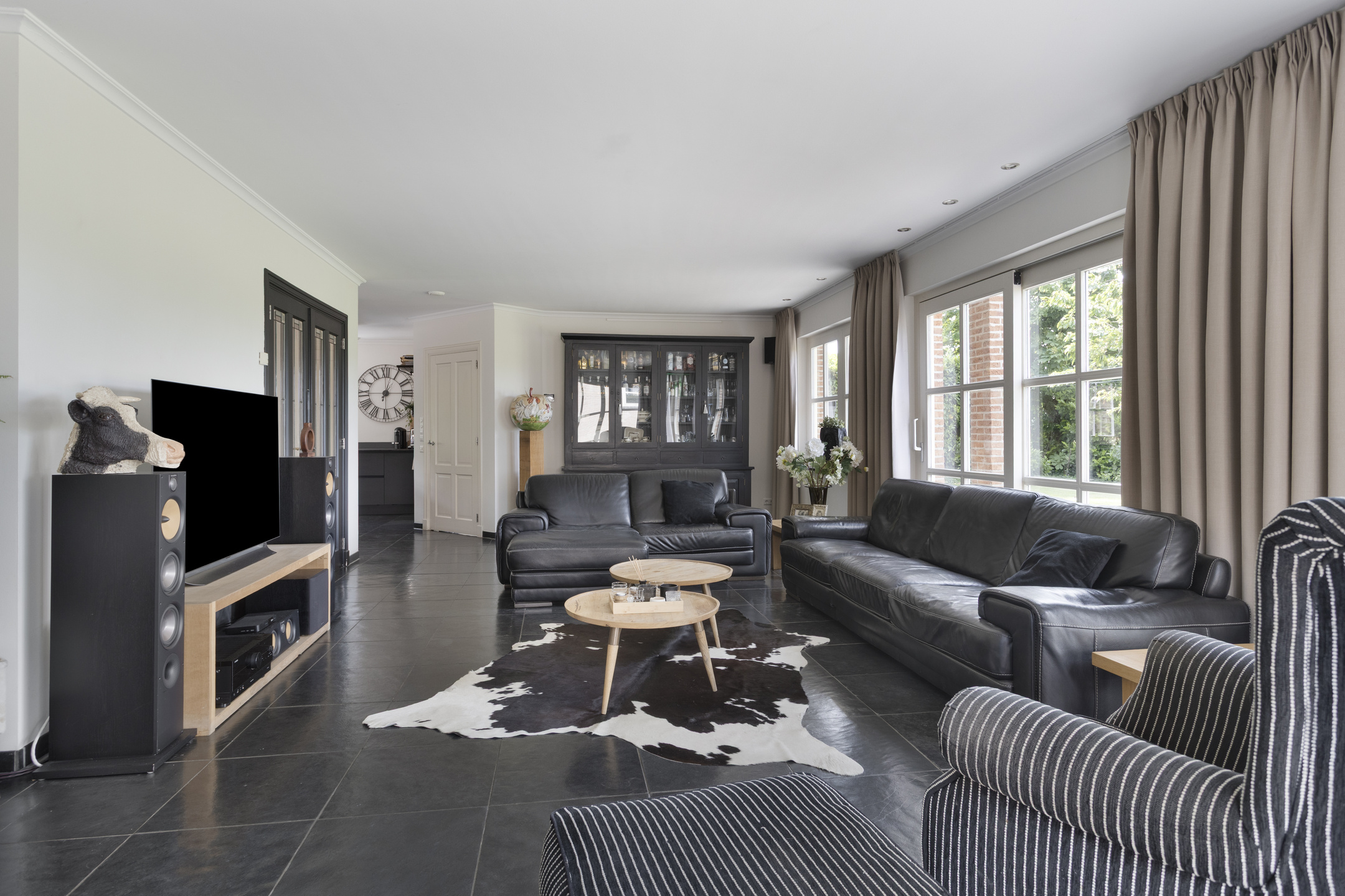 woonkamer (ca. 75 m² incl. keuken en werkhoek) voorzien van een drietal schuifpuien, houthaard en een werk-/leeshoek met inbouwkastenwand, wandafwerking stucwerk, natuurstenen vloer, plafond afgewerkt met stucwerk vv. inbouwspots;