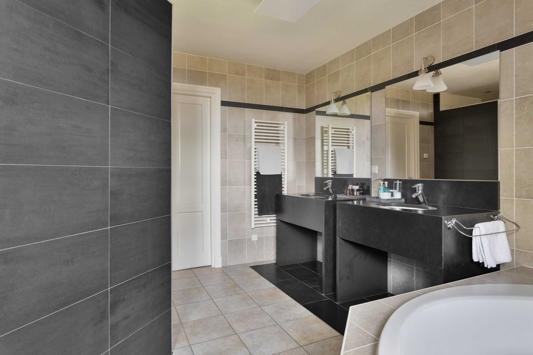 royale badkamer voorzien van een 2-persoonsligbad, inloopdouche, infraroodpaneel, badkamermeubel met dubbele wastafel, elektrische designradiator, dakkapel en vloerverwarming;