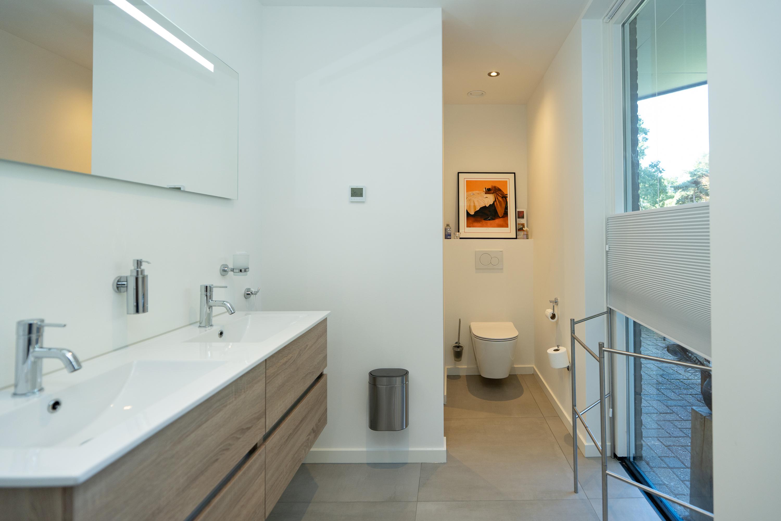 Er zijn in totaal drie slaapkamers en een multifunctionele studeerkamer op de begane grond. De studeerkamer is nu in gebruik als galerie. De masterbedroom heeft een ruime walk-in-closet en aansluitend een zeer ruime badkamer met combi sauna, vrijstaand ligbad, douche, dubbele wastafel en toilet. Hier kun je heerlijk ontspannen en tijdens het badderen genieten van de groene omgeving. Bij de andere slaapkamers is de tweede badkamer gesitueerd, welke voorzien is van een douche, dubbele wastafel en een toilet.