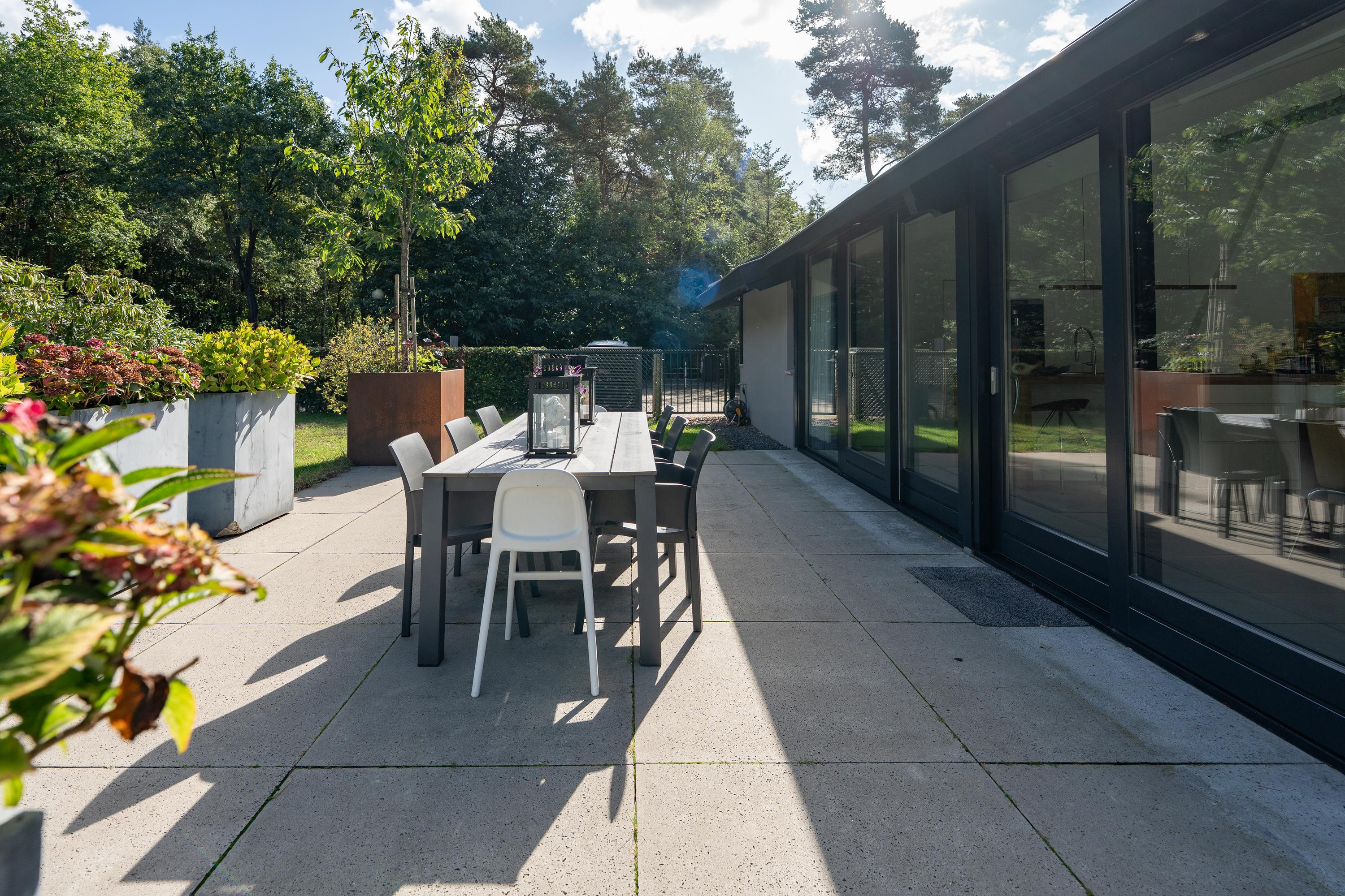 Rondom de woning ligt een verzorgde voor, zij en achtertuin, ingericht met meerdere terrassen waardoor op elk moment van de dag een fijne plek in de zon of schaduw te vinden is. Ook is er nog een extra berging. De omheinde zwemvijver is een echte blikvanger en geeft de tuin een bijzondere uitstraling. Op eigen terrein is bovendien ruime parkeergelegenheid aanwezig.