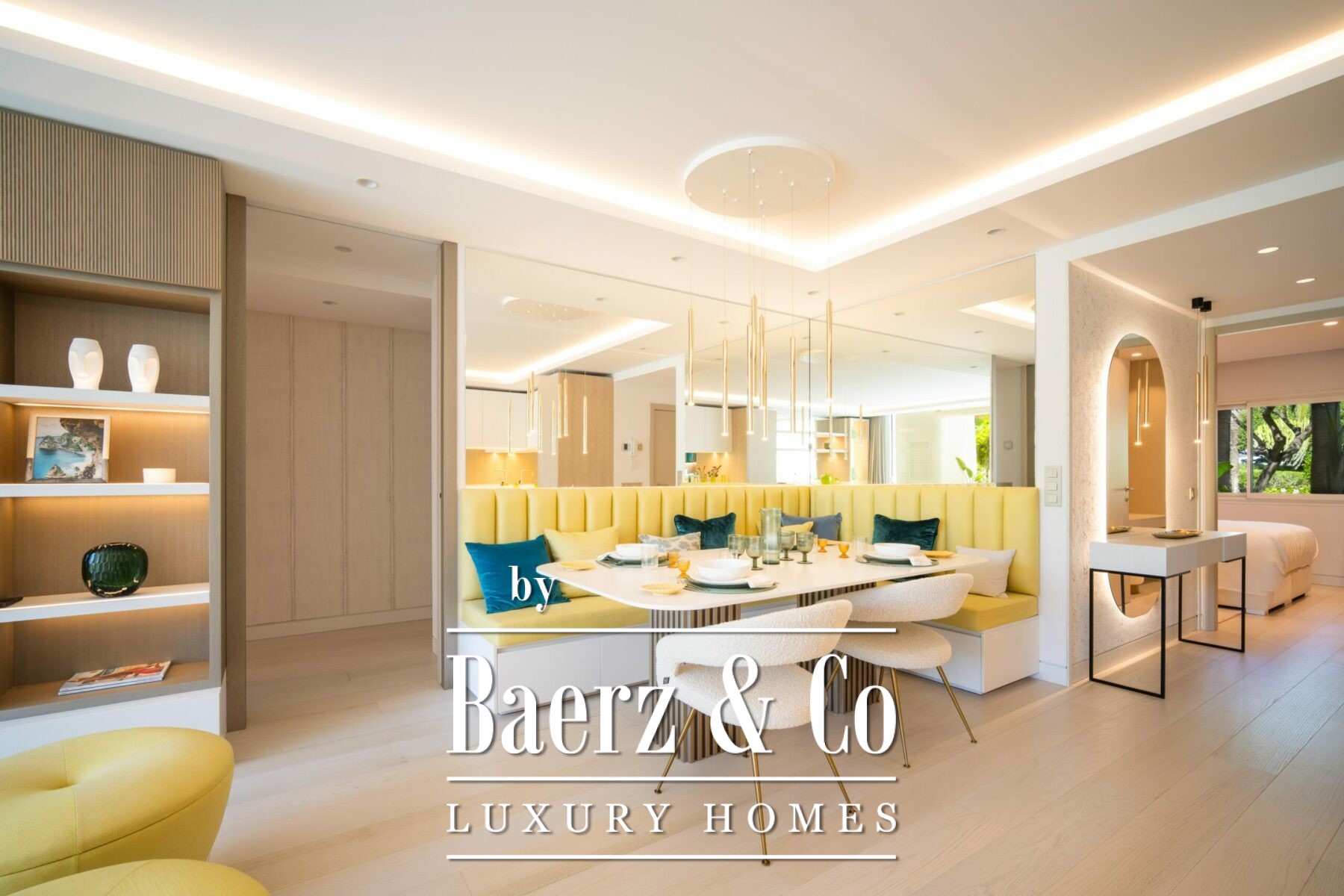 Inside, tasteful pops of colour accentuate carefully selected furniture, creating an intimate and inviting space. The cosy dining nook, positioned next to a sleek, modern kitchen with ample storage and state of the art appliances, adds to the apartment's charming atmosphere, complemented by a designated bar area for entertaining.