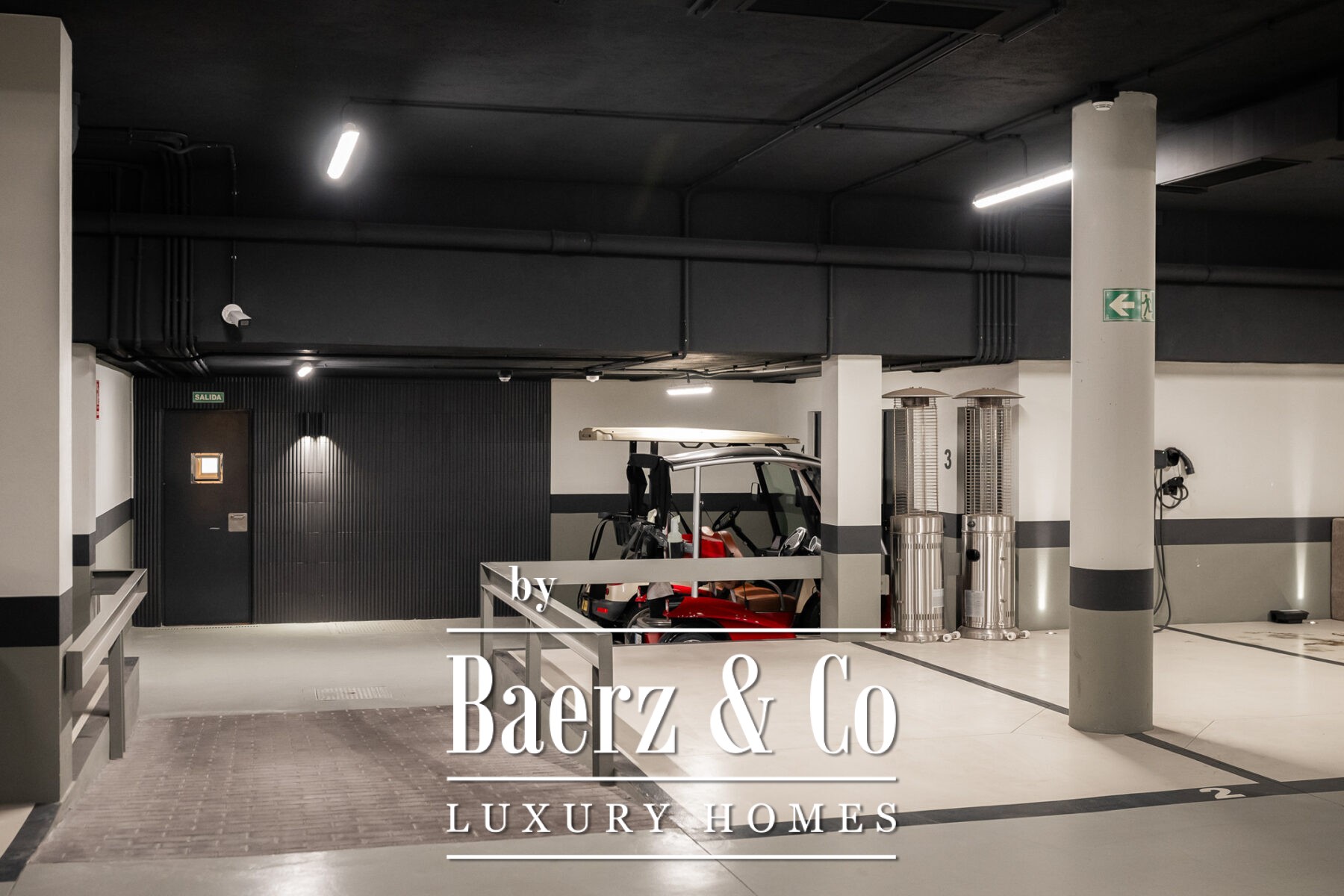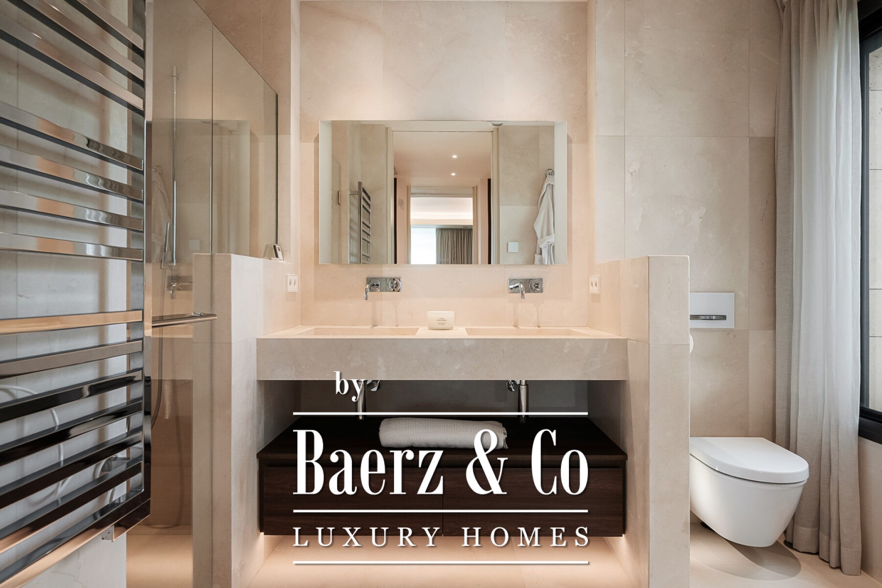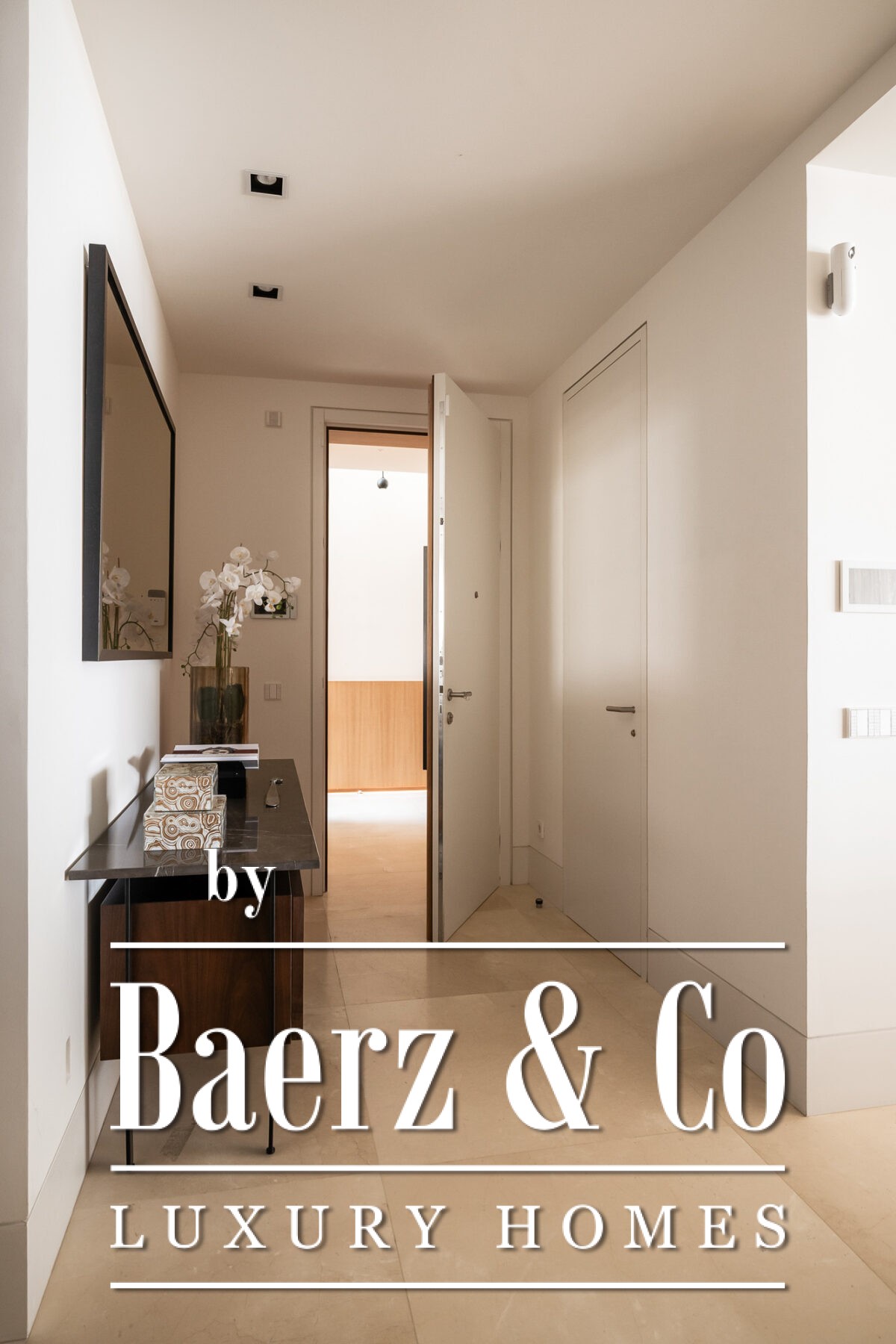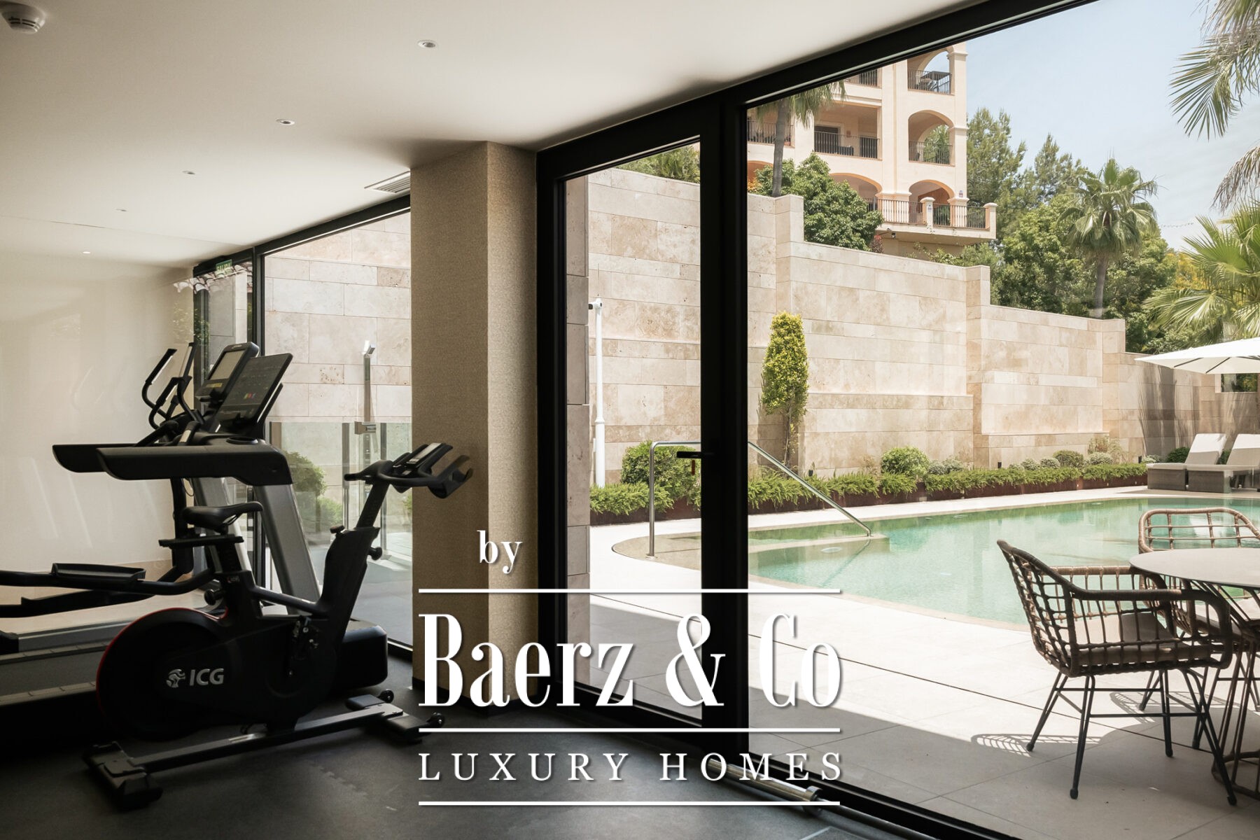 Binnenkomst via een centrale hal leidt tot een indeling die efficiënt het sociale en het privédeel van elkaar scheidt. De open leefruimte vloeit over in een keuken voorzien van Gaggenau en Miele apparatuur, een indrukwekkende wijnkast van vloer tot plafond en volledig automatische beglazing die binnen en buiten naadloos verbindt. In de privévleugel beschikt de master suite over een inloopkast en complete badkamer, aangevuld met twee extra slaapkamers met eigen badkamer en uitzicht op de rustige tuinen. Verdere voorzieningen zijn een wasruimte, domoticasysteem, hoogwaardige materialen door het gehele appartement en twee garageplaatsen met geregistreerde elektrische buggy en berging.