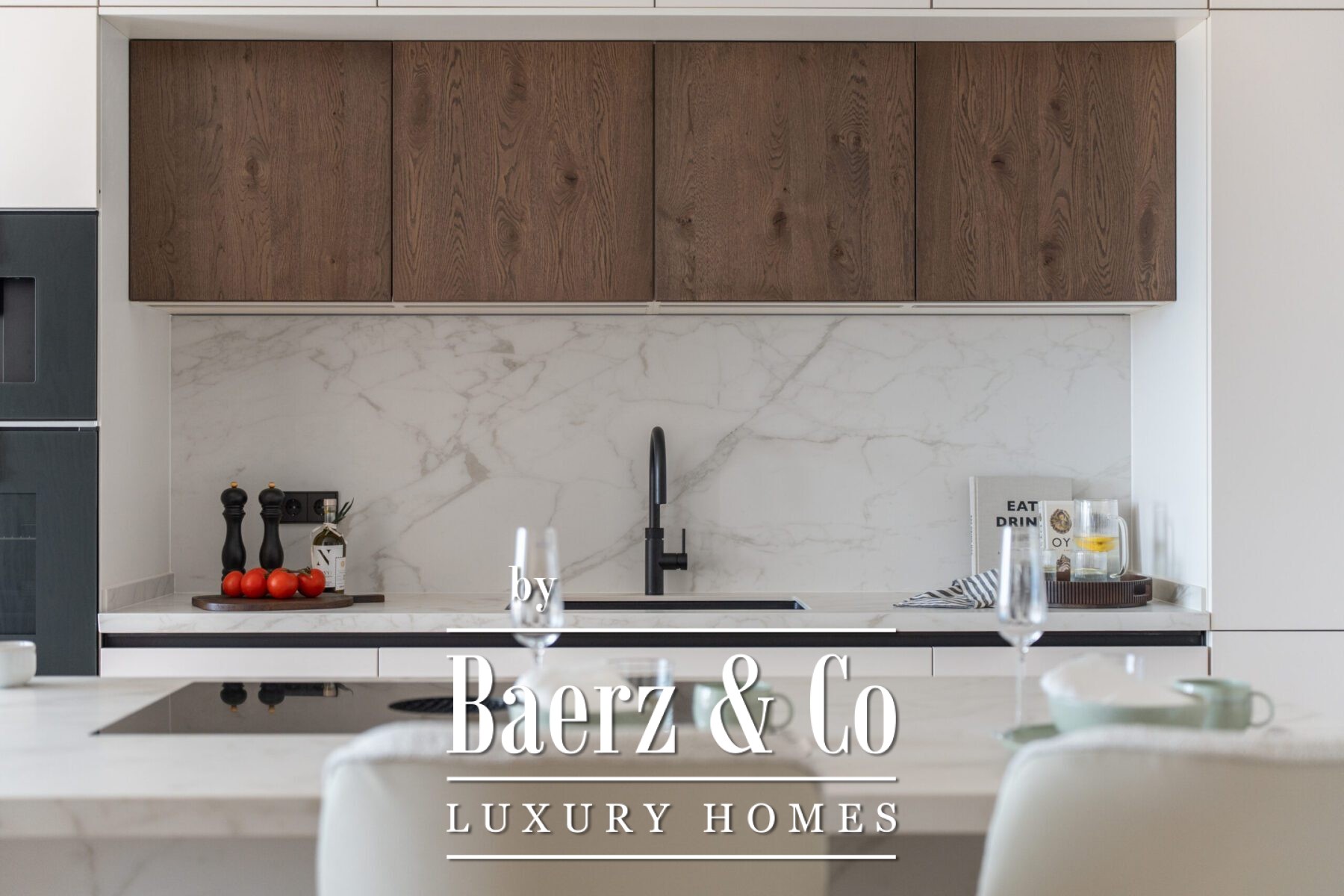 The apartment features an open-concept living and dining area with floor-to-ceiling windows that flood the space with natural light and create a seamless transition to the expansive outdoor terrace. The kitchen is equipped with state-of-the-art Gaggenau appliances, natural oak floors add warmth and character, and a smart home system allows for effortless control of lighting, temperature, and more.